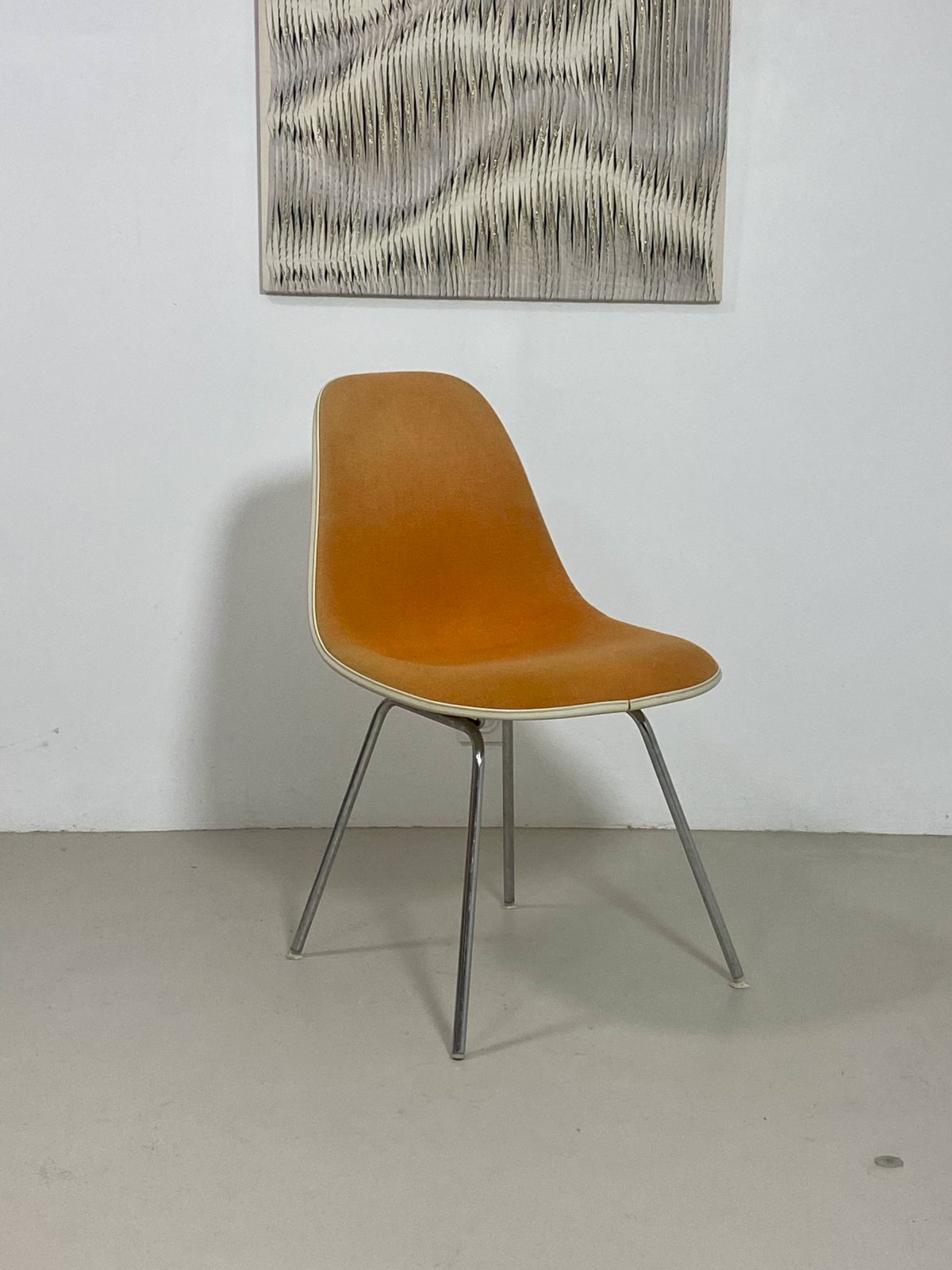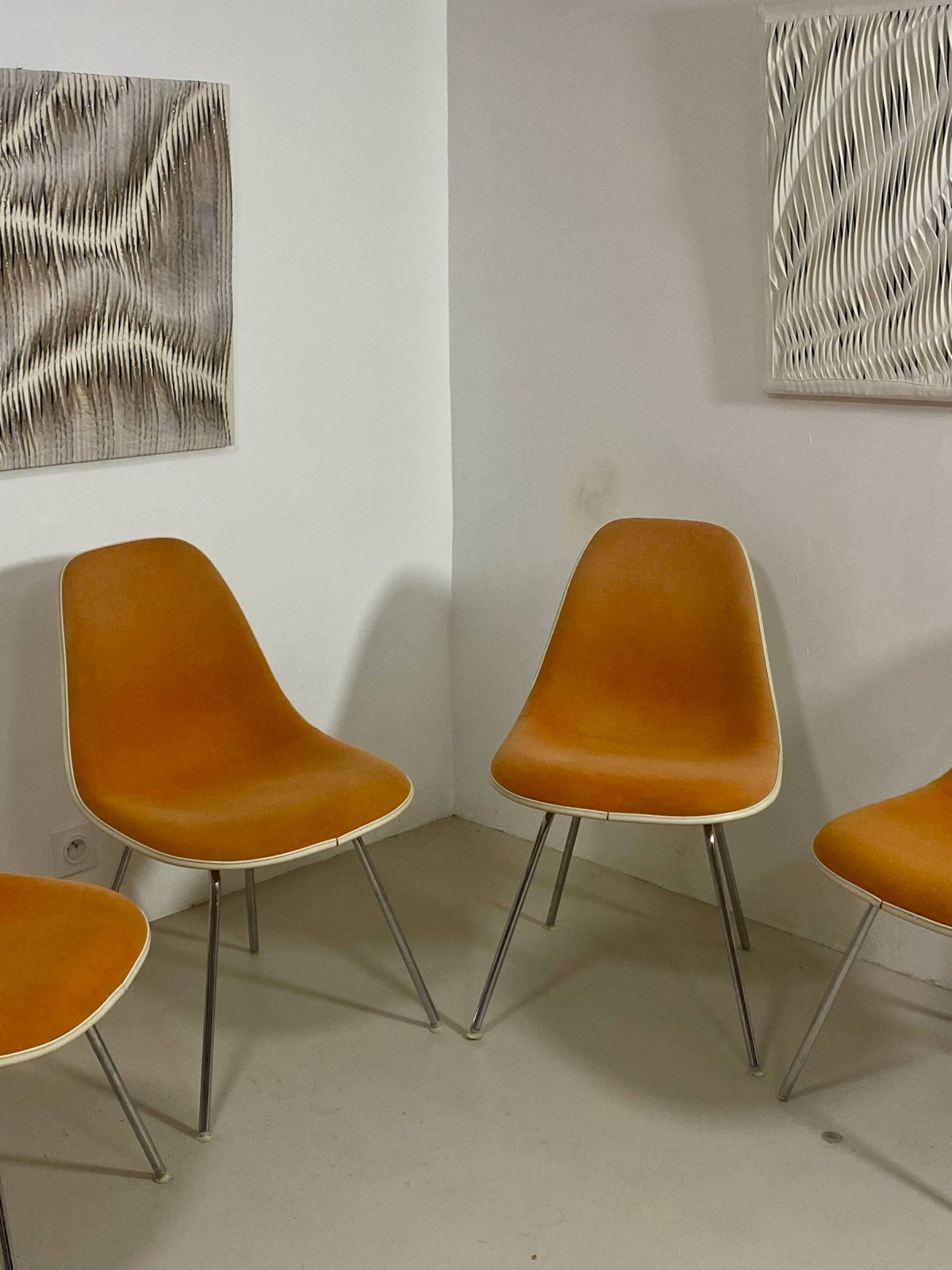 Lot de 4 chaises DSX dessinées par Charles et Ray Eames, édition Herman Miller, modèle iconique créé en 1952.Les assises sont en fibre de verre, recouvertes de leur tissu d’origine de couleur orange, en très bon état de conservation.Les piètements en métal tubulaire sont également en bon état.Une véritable icône du design du XXᵉ siècle, à la fois intemporelle et indispensable, aussi élégante que confortable.Deux des capuchons de sol blancs sont endommagés.