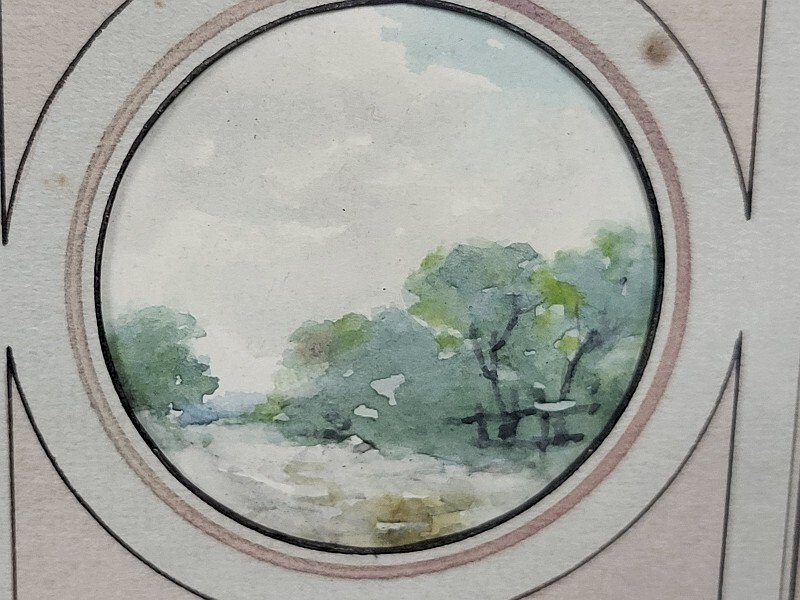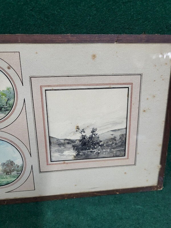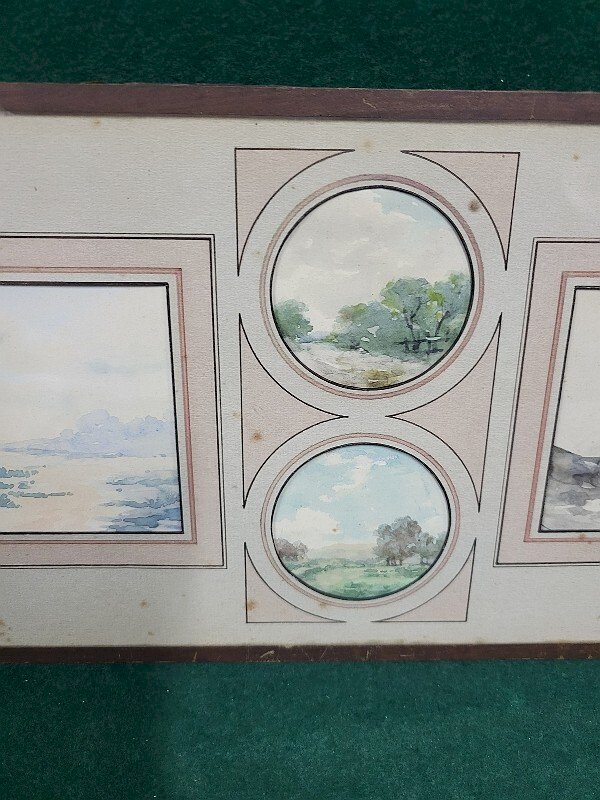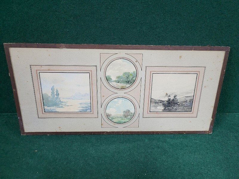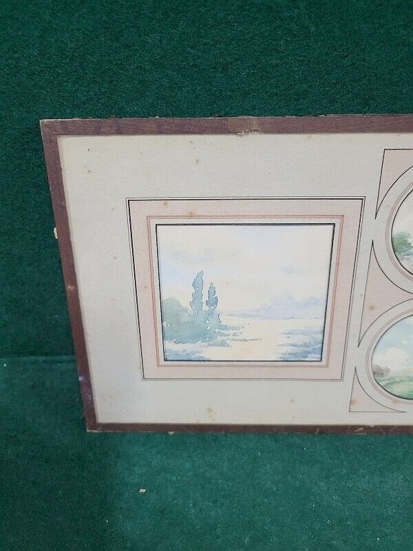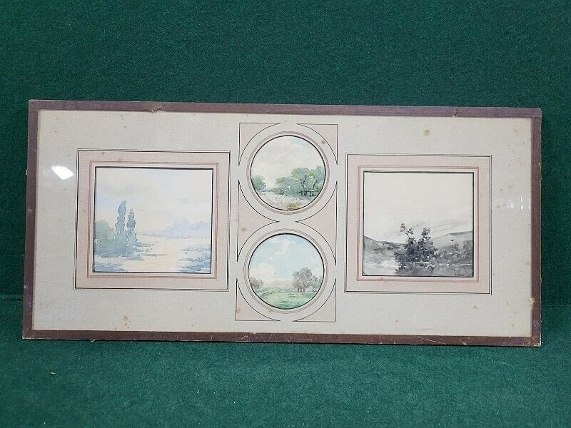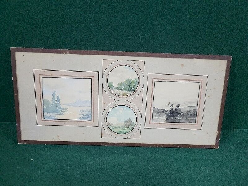 joli lot de 4 petites aquarelles sous verre signée F. Javel elles sont en bon état il n'y a que celle de droite en noir et blanc qui est signée (voir photos) celle de gauche mesure 9 cm de large sur 8 cm de haut les 2 médaillons mesurent 6 cm de diamètre celle de droite mesure 8.5 cm de large sur 8 cm de haut le sous verre mesure 39 cm de large sur 18 cm de haut Type:Aquarelle Caractéristiques:Signé Thème:Paysage