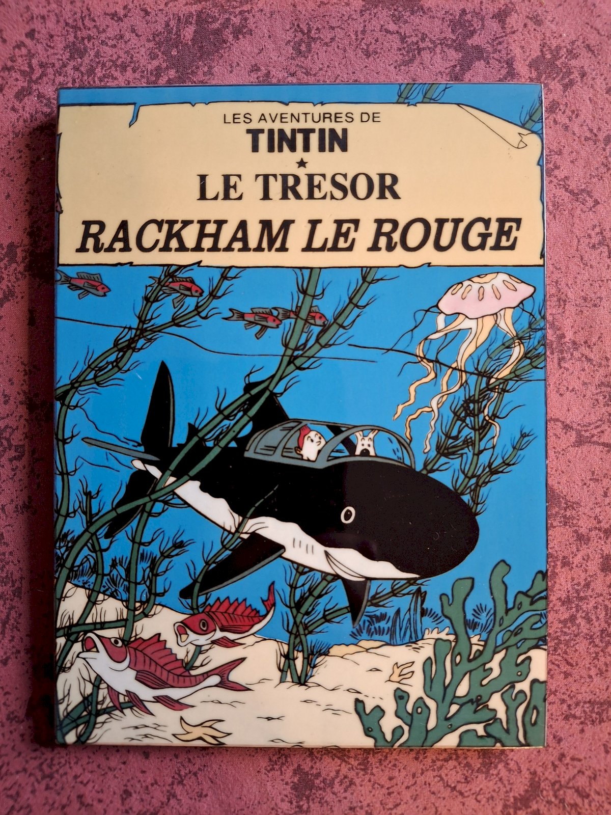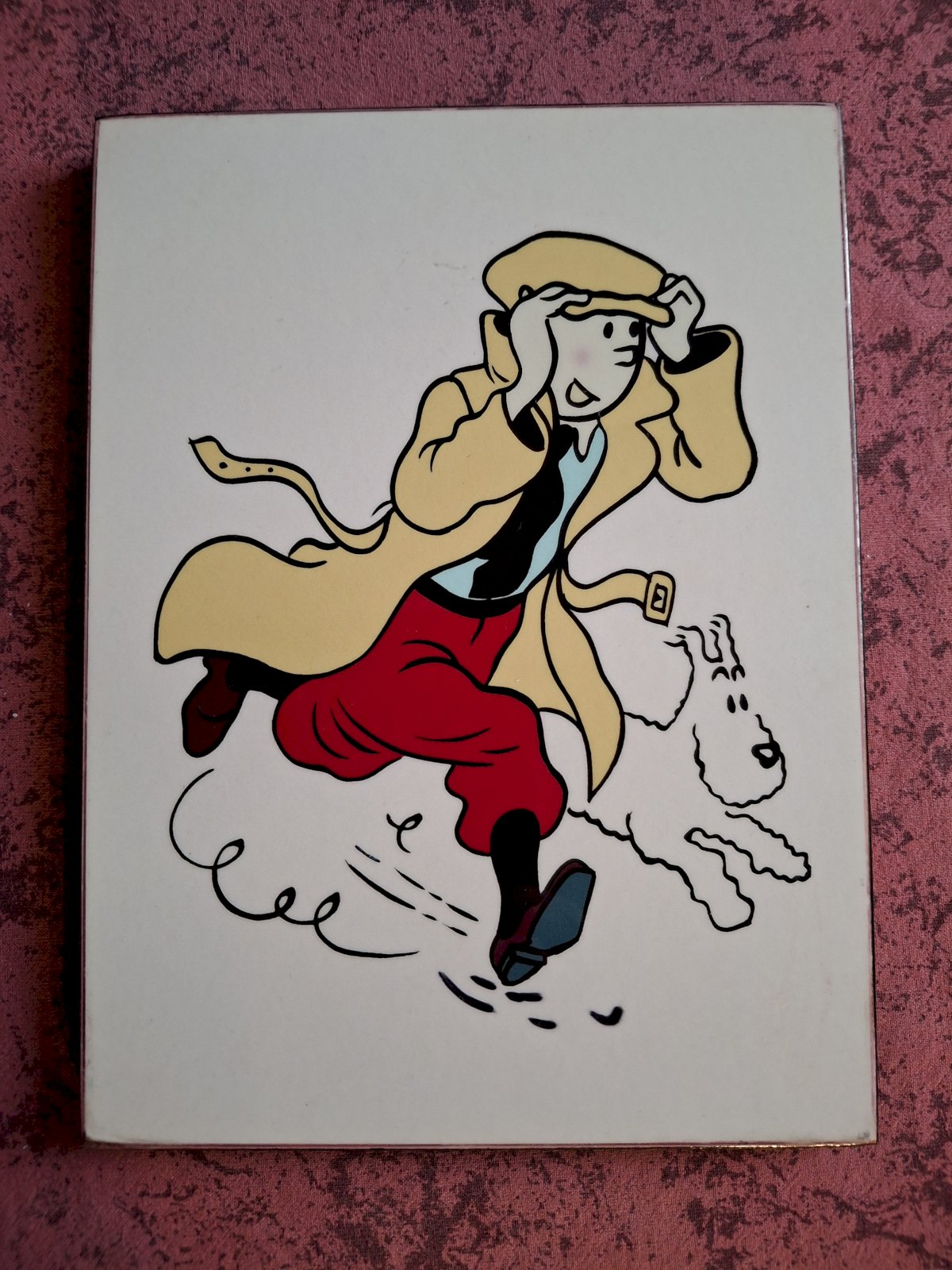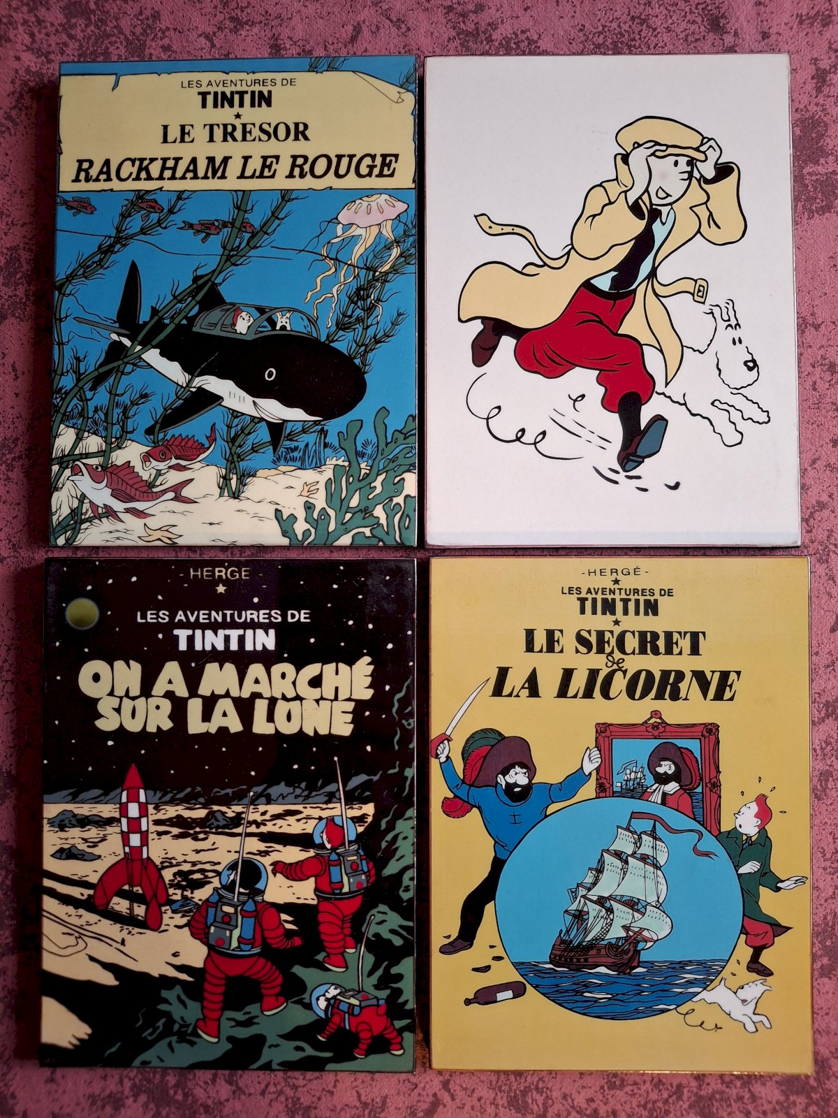 3 des 4 tableaux représentent des couvertures d'albums de Tintin, et le quatrième représente Tintin et Milou.