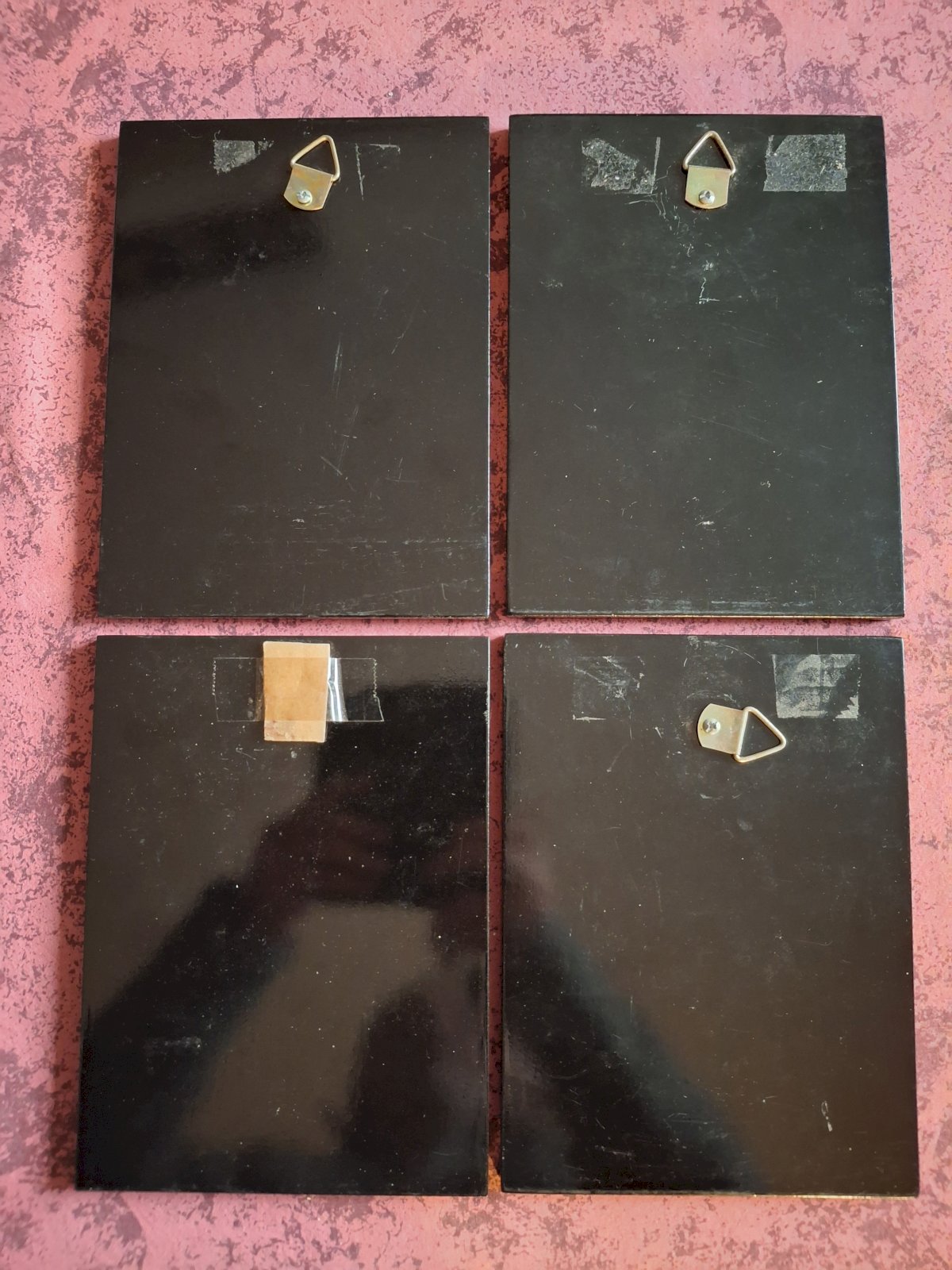 Chaque tableau est muni de son accroche ajustable au revers, j'ai juste oublié d'enlever la protection carton de l'un des 4 pour la photo, mais l'accroche est bien présente.