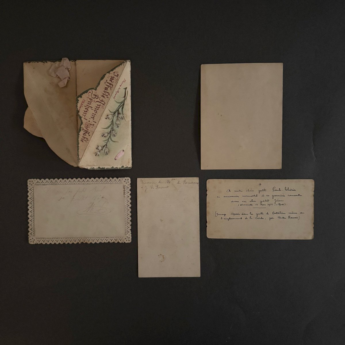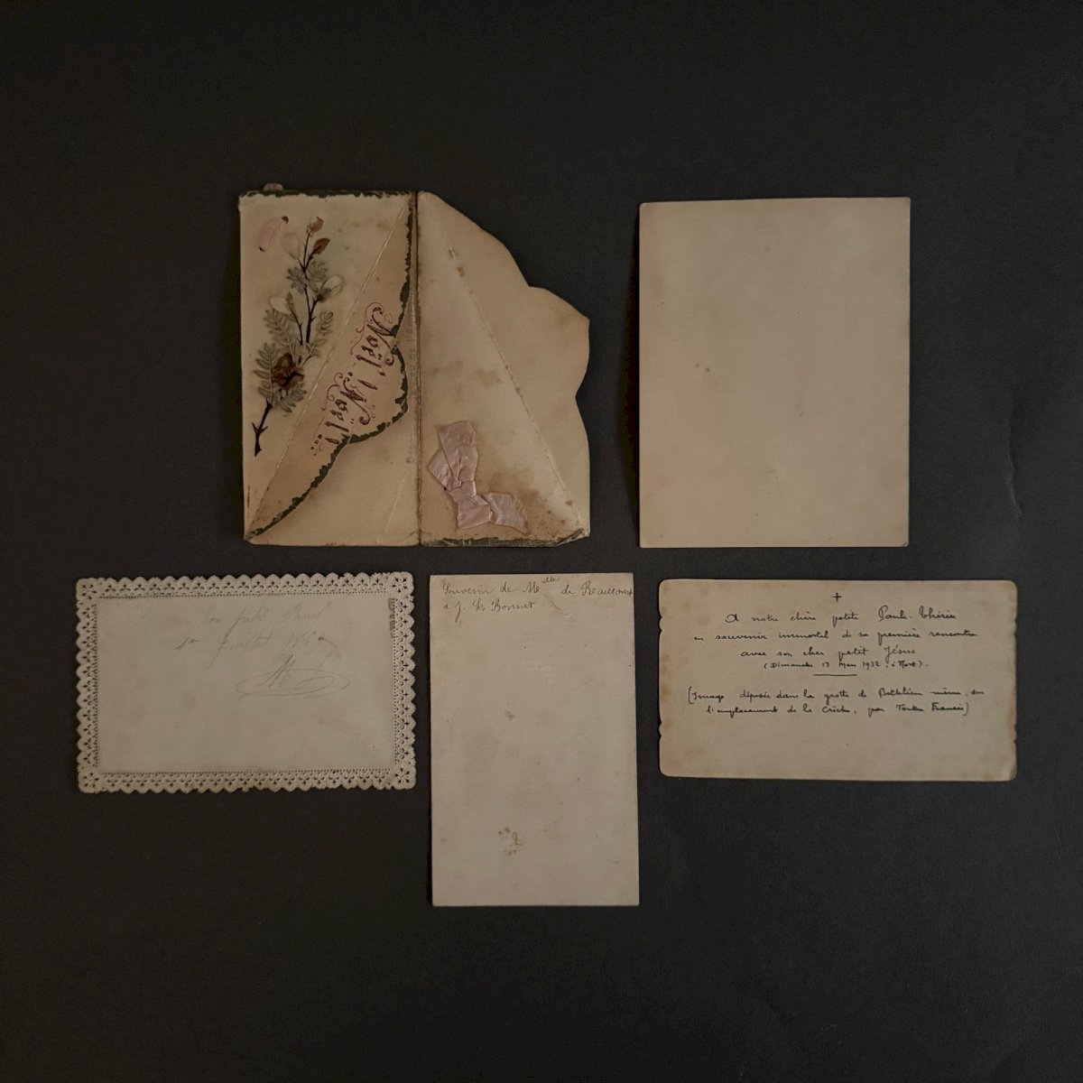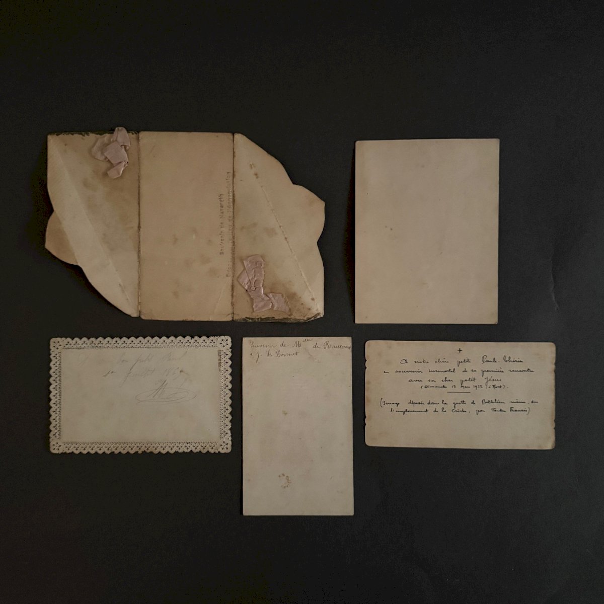Lot de 5 images pieuses anciennes et canivet Nativité  A5786 Ces images pieuses autour du thème de la Nativité sont anciennes. Pour l’état, notons un léger jaunissement du papier et des petites taches brunes. Nos photos vous permettent d'apprécier la qualité de l'objet. Merci de bien détailler les photos. N'hésitez pas à zoomer . Les photos font partie intégrante de la description. Dimensions : - Image pliante Hauteur : 18 cm Largeur : 12,3 cm - Jésus Hauteur : 11,5 cm Largeur : 7,2 cm   Je reste à votre disposition pour toute question. État:OccasionObjet ayant été utilisé. les éventuelles imperfections. Type:Christianisme Sous-type:Icône, Image pieuse Pays d'origine:France Matière:Papier, Carton