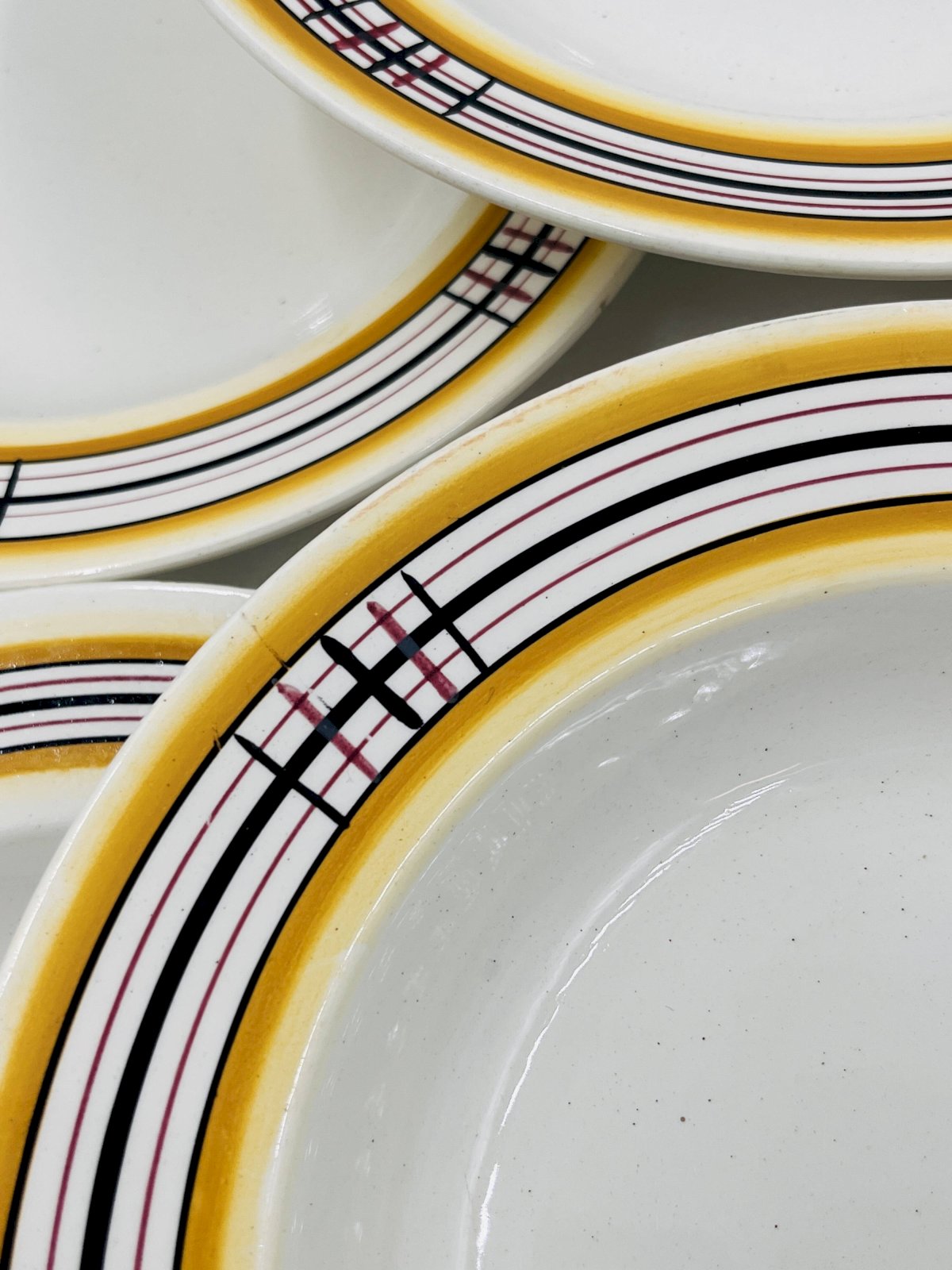 Chaque assiette est ornée d'un motif classique jaune et noir qui entoure élégamment le bord et contraste magnifiquement avec l'immaculée porcelaine.