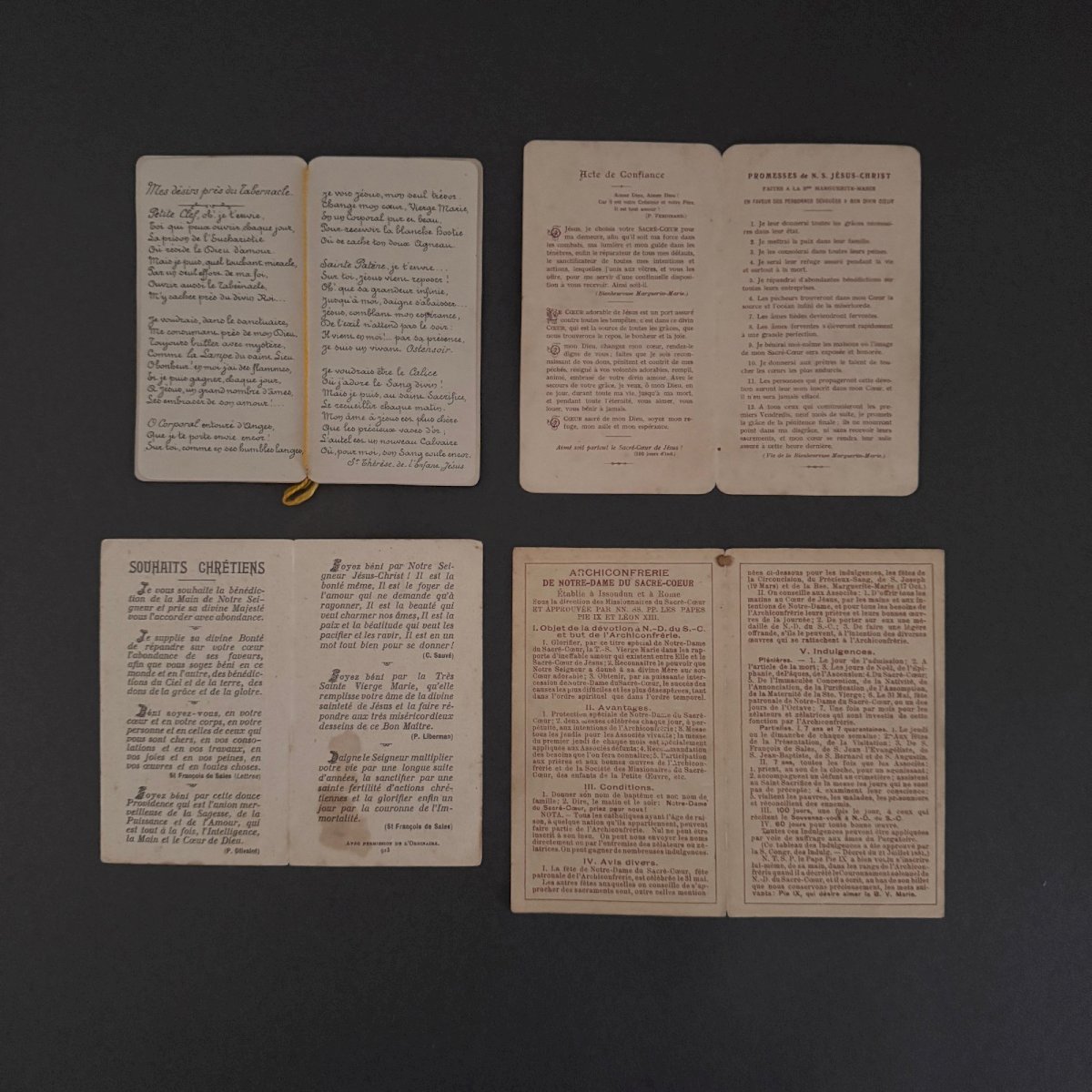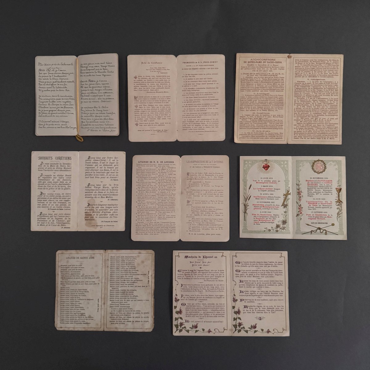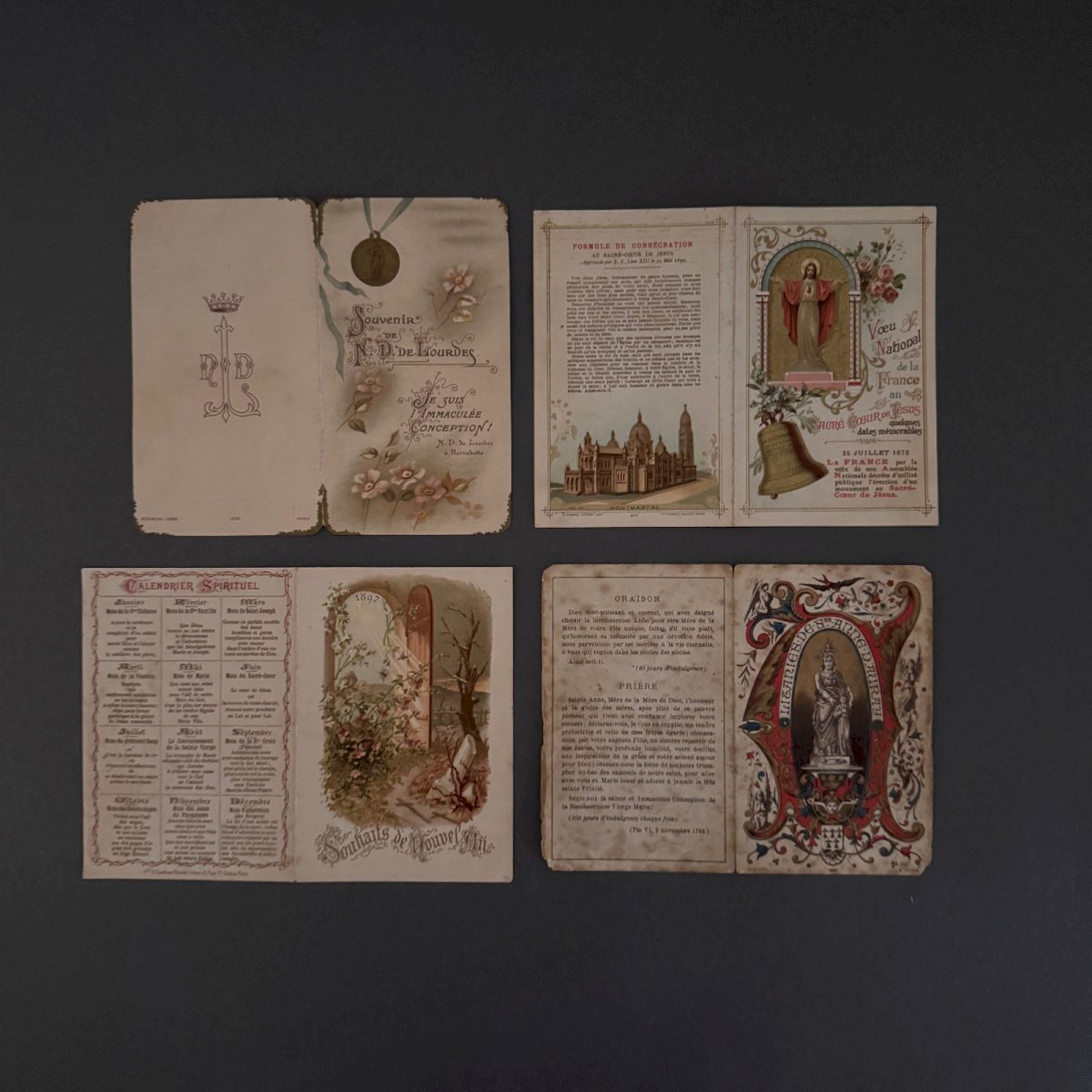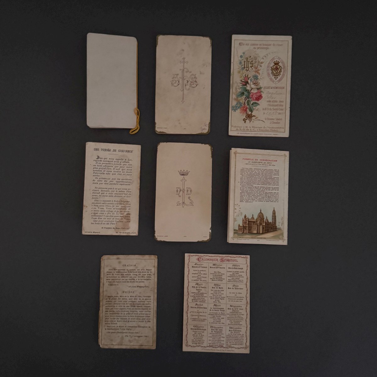 Lot de 6 images pieuses en couleur fin XIXe début XXe M3733 Ces images pieuses sont de qualité, notons un léger jaunissement, des taches par endroits et des petites déchirures. Nos photos vous permettent d'apprécier la qualité de ces images. Pour l'état, merci de bien détailler les photos. N'hésitez pas à zoomer . Les photos font partie intégrante de la description. Dimensions : - Plus petite Hauteur : 11,1 cm Largeur : 11,8 cm - Plus grande Hauteur : 12,4 cm Largeur : 14,6 cm   Je reste à votre disposition pour toute question. État:OccasionObjet ayant été utilisé. les éventuelles imperfections. Type:Christianisme Sous-type:Icône, Image pieuse Pays d'origine:France Matière:Papier, Carton