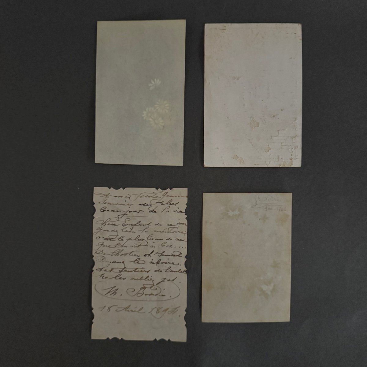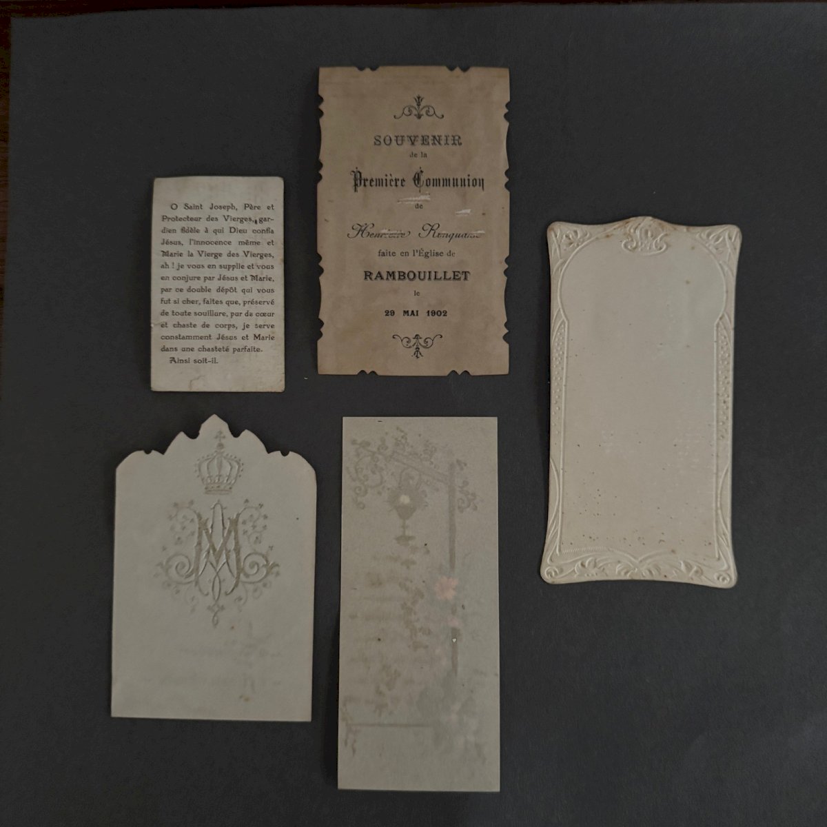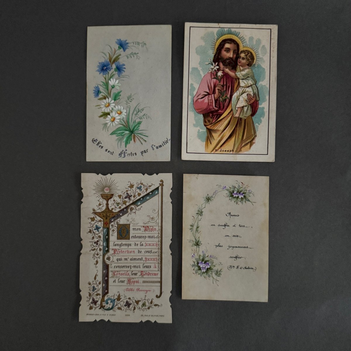 Lot de 9 images pieuses XIXe A5785 Nous vendons l’ensemble de ces images pieuses rehaussées en couleur . Nous signalons un léger jaunissement par endroits, de minimes taches, cependant l’ensemble reste dans un état tout à fait présentable.   Nos photos vous permettent d'apprécier la qualité de l'objet. Pour l'état, merci de bien détailler les photos. N'hésitez pas à zoomer . Les photos font partie intégrante de la description. Dimensions : - la plus grande Hauteur : 12 cm Largeur : 5,2 cm - la plus petite Hauteur : 7,5 cm Largeur : 4,6 cm   Je reste à votre disposition pour toute question. État:OccasionObjet ayant été utilisé. les éventuelles imperfections. Type:Christianisme Sous-type:Images pieuses Pays d'origine:France Matière:Papier, Carton