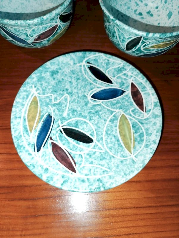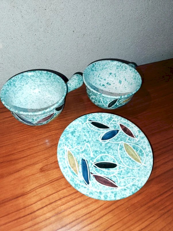lot de deux tasses avec poignees et une coupelle vallauris signé Borty en bon etat tres design typique de cet artiste diametre 16.5cm de la coupelle et diametre 12.5cm pour les tasses quelques petites egrenures