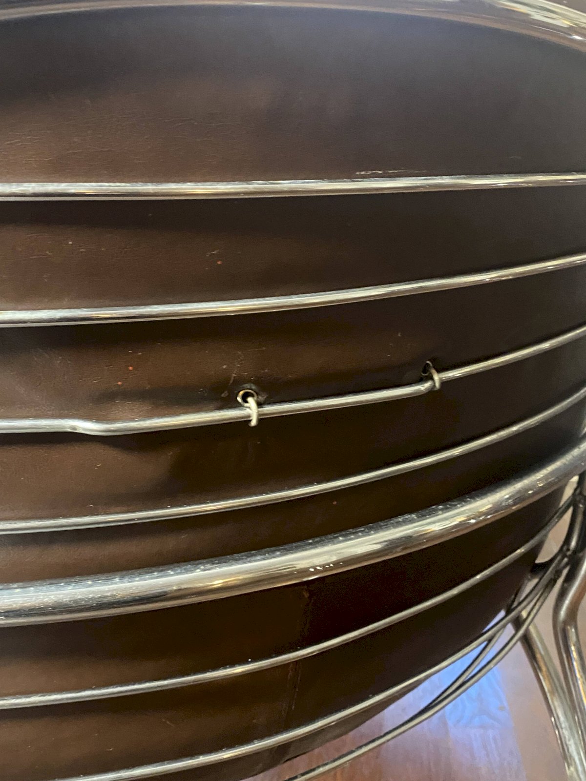 Le dossier légèrement incliné et la conception filaire donnent à l’ensemble une silhouette légère tout en offrant une assise stable et confortable.État:Les chaises sont en très bon état vintage, présentant quelques traces d’usage normales pour leur âge.Structure solide, patine authentique.Les coussins montrent une légère usure uniforme.Dimensions:Hauteur: 84 cm.Largeur: 53 cm.Profondeur: 52 cm.Hauteur d’assise: 45cm.
