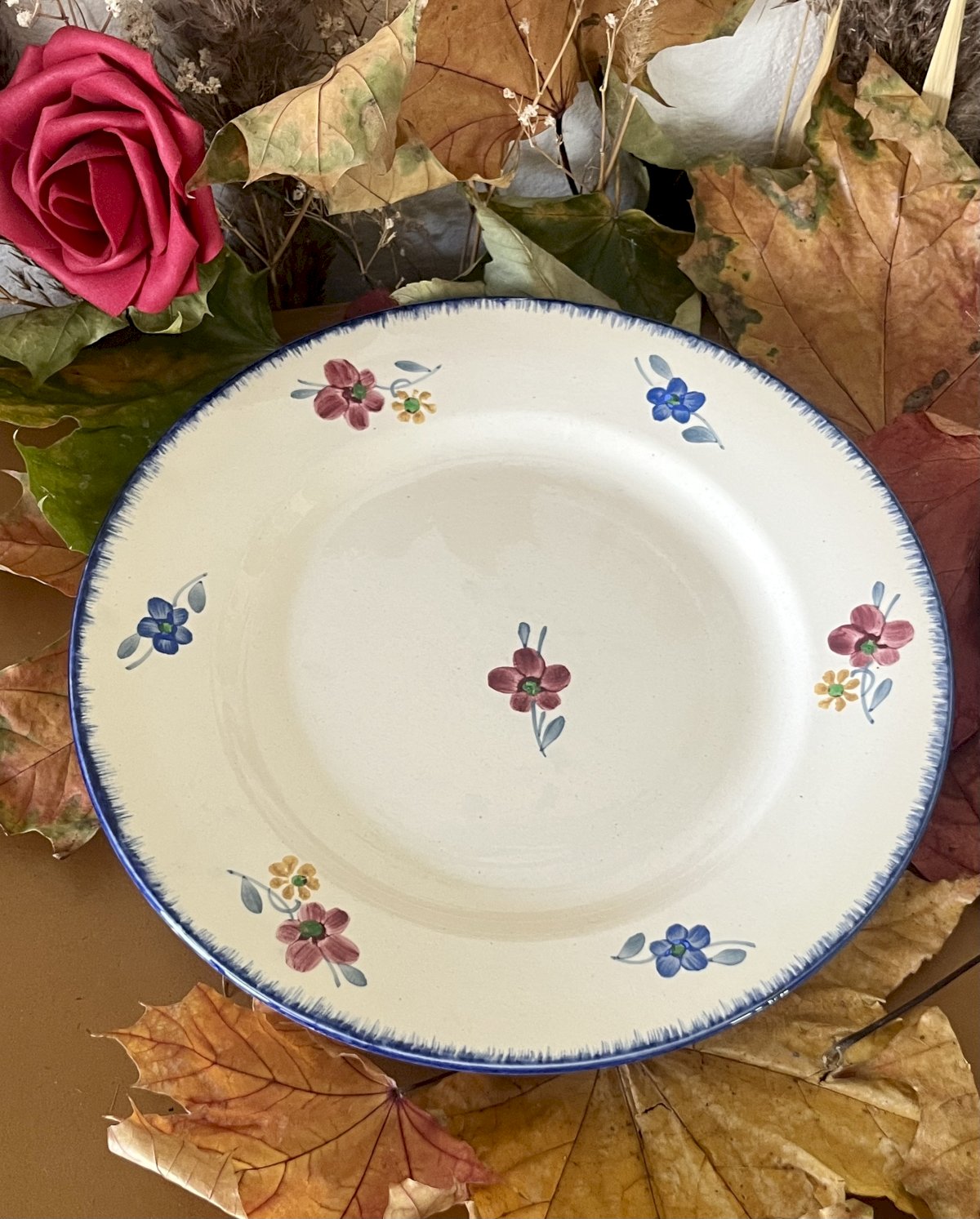 Apportez une touche floral et pleine de pep's à votre table avec ces 2 assiettes plates "Mary Lou" en porcelaine opaque à décor multicolore et bordure bleu sur fond crème, peint à la main.