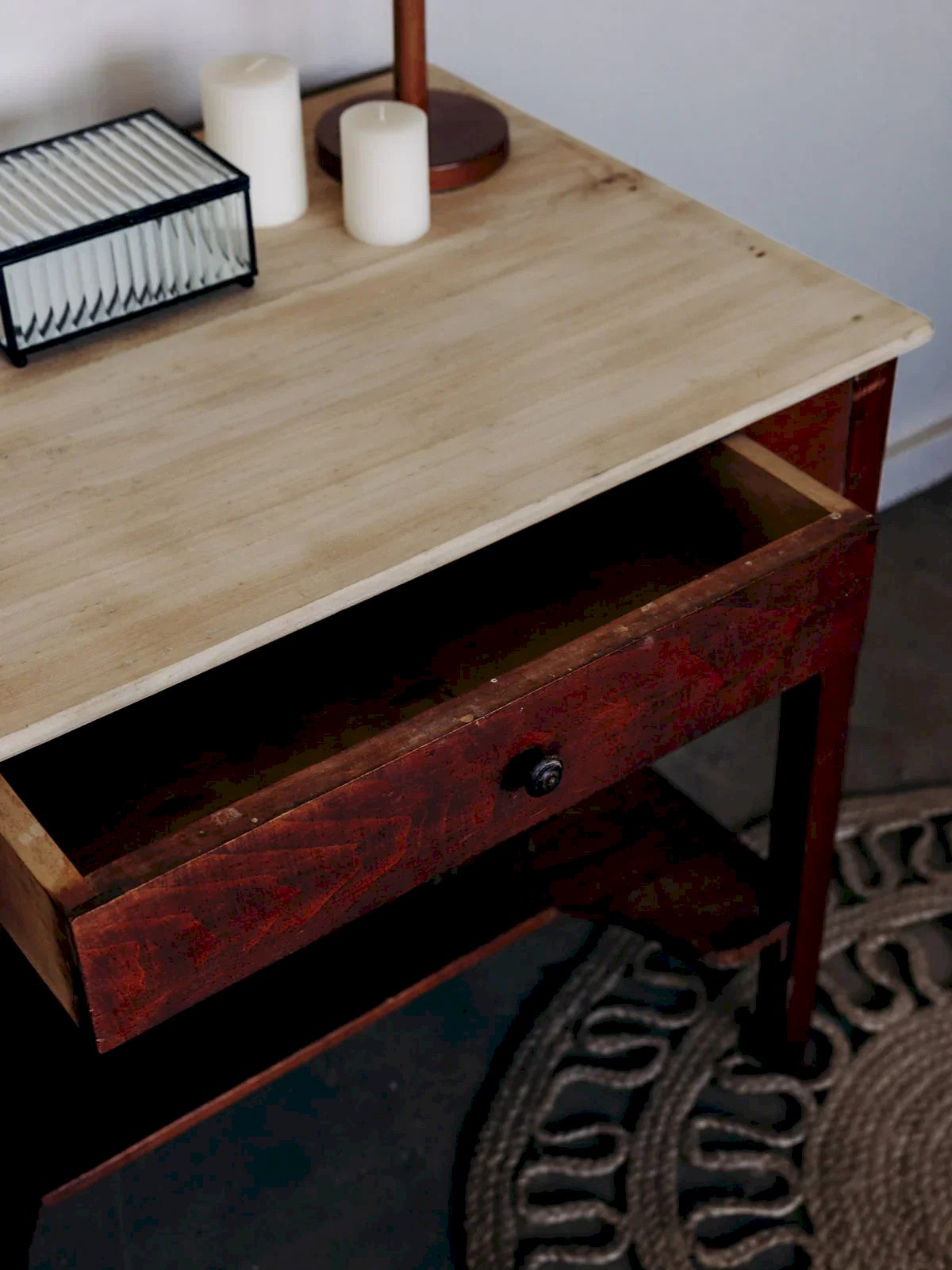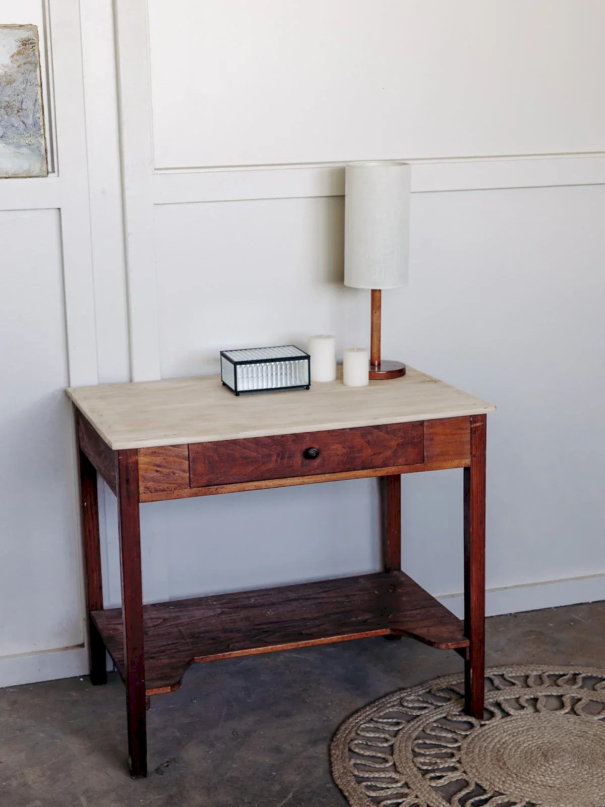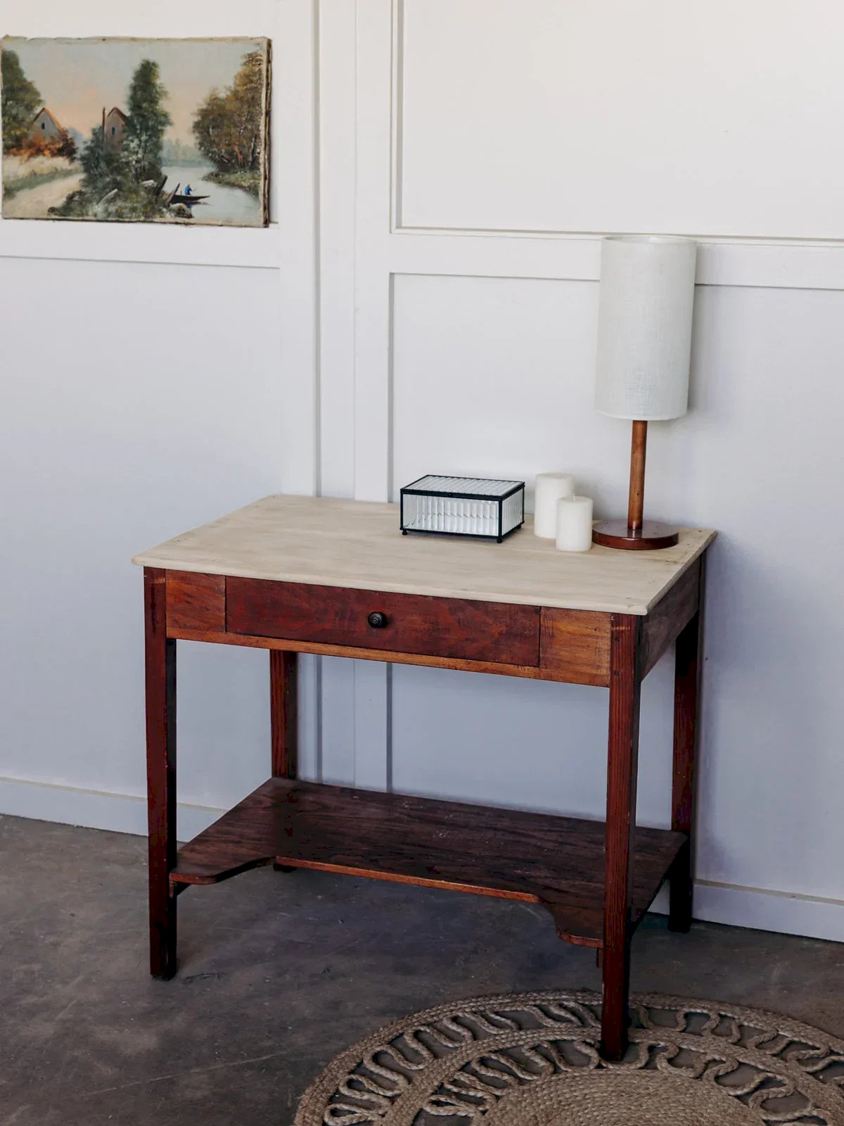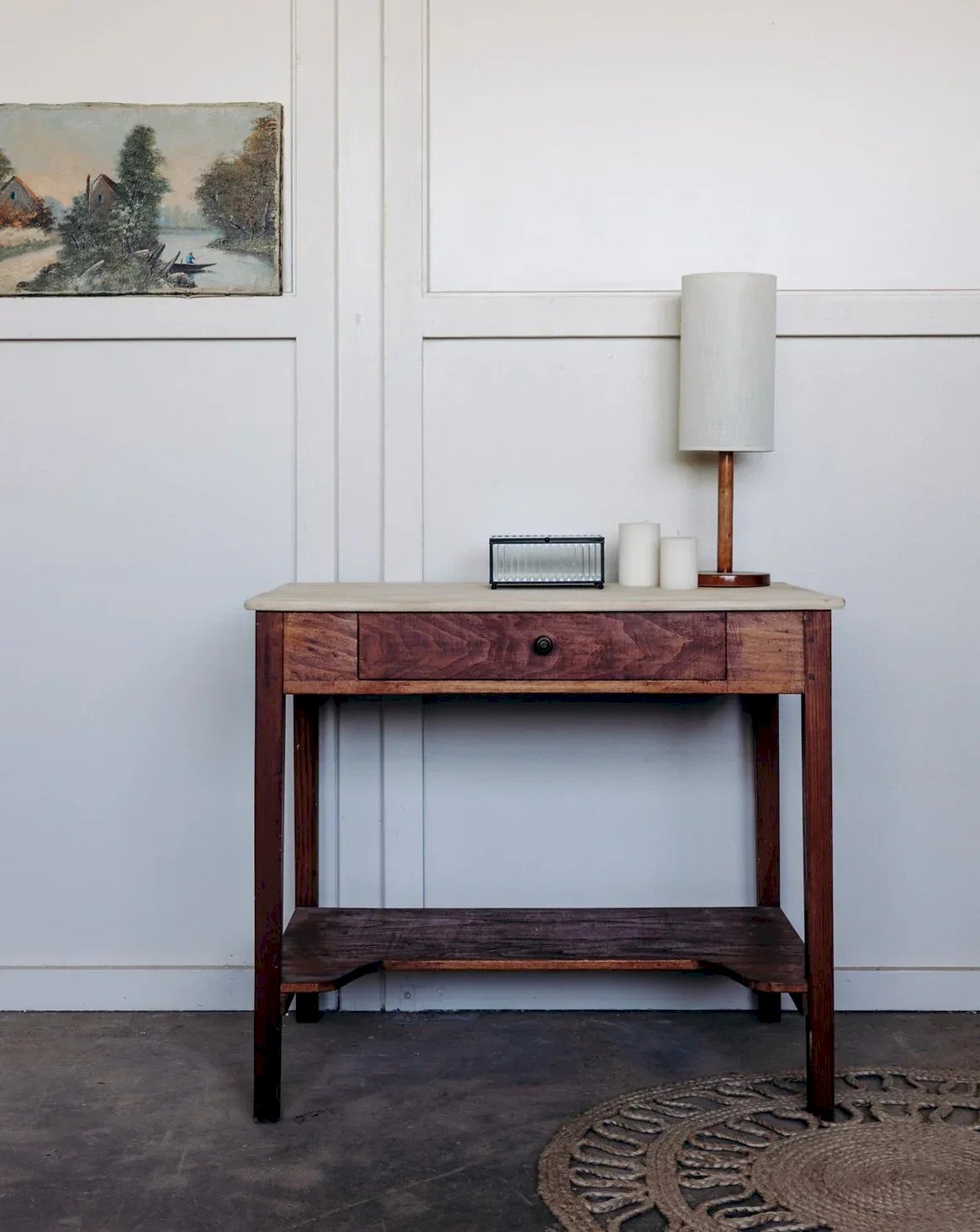 Découvrez cette coiffeuse, à la fois table de toilette et/ou petit bureau au charme vintage. Son plateau a été soigneusement décapé et poncé pour révéler un bois clair naturel. Les pieds, laissés dans leur jus, lui confèrent un caractère authentique. Elle dispose d’un tiroir central avec une jolie poignée et d’une tablette basse pratique. Un meuble délicat et polyvalent, idéal dans une chambre ou une entrée. Longueur : 84 cm Hauteur : 74 cm Hauteur entre les deux plateaux : 40 cm Hauteur sous plateau : 60 cm Hauteur du tiroir : 8 cm Profondeur globale : 55,5 cm Petite histoire de la coiffeuse Le terme “coiffeuse” apparaît au début du XXème siècle, alors que le meuble existe depuis l’Antiquité. Composée d’une tablette, d’un ou plusieurs miroirs et de nombreux tiroirs, la coiffeuse est un meuble de rangement, mais surtout un lieu de préparation où l’on se maquille, se parfume et se coiffe. Si à l’origine, ce mobilier correspond aussi bien aux hommes qu’aux femmes, il devient très vite l’incarnation du mystère féminin. La coiffeuse peut en effet se munir de cachettes secrètes, afin de recevoir la correspondance intime. Aujourd’hui, la coiffeuse revient sur le devant de la scène et fonctionne très bien dans tous les style d'intérieurs ! État:Occasion: Objet ayant été utilisé. Objet présentant quelques marques d'usure superficielle, ...Occasion: Objet ayant été utilisé. Objet présentant quelques marques d'usure superficielle, entièrement opérationnel et fonctionnant correctement. Il peut s'agir d'un modèle de démonstration ou d'un objet retourné en magasin après une courte période d'utilisation. les éventuelles imperfections. Marque:Debongout Type:Produit chiné Matériau:Bois Style:Campagne Personnalisé:Coiffeuses
