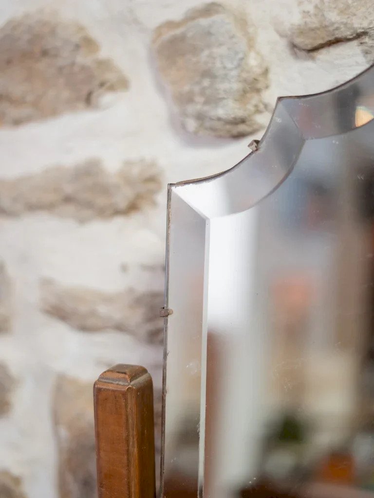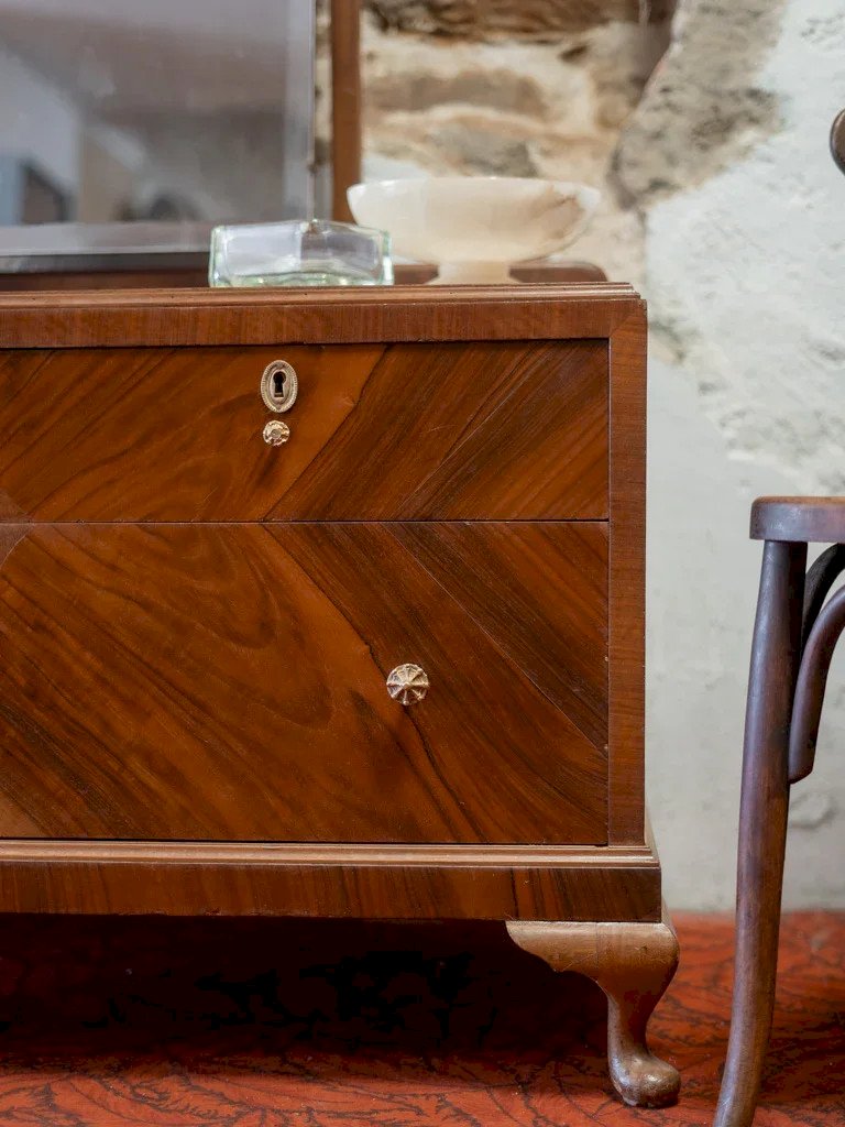 Découvrez cette élégante coiffeuse ancienne, datant du début du 20ème siècle, qui apportera une touche d'authenticité à votre intérieur. Fabriquée en bois avec un magnifique miroir biseauté pivotant, elle est équipée de poignées dorées délicates et propose un espace de rangement pratique avec deux petits tiroirs et un grand tiroir. Ces quelques traces du temps ajoutent du charme et de l'histoire de ce modèle italien unique. Un meuble qui allie fonctionnalité et style vintage pour les amateurs d’objets d'exception. Longueur : 111 cm Largeur : 50 cm Hauteur : 153 cm Hauteur sous plateau : 63 cm Hauteur tiroir : 22 cm Hauteur de la niche : 11 cm Petite histoire de la coiffeuse Le terme “coiffeuse” apparaît au début du XXème siècle, alors que le meuble existe depuis l’Antiquité. Composée d’une tablette, d’un ou plusieurs miroirs et de nombreux tiroirs, la coiffeuse est un meuble de rangement, mais surtout un lieu de préparation où l’on se maquille, se parfume et se coiffe. Si à l’origine, ce mobilier correspond aussi bien aux hommes qu’aux femmes, il devient très vite l’incarnation du mystère féminin. La coiffeuse peut en effet se munir de cachettes secrètes, afin de recevoir la correspondance intime. Aujourd’hui, la coiffeuse revient sur le devant de la scène et fonctionne très bien dans tous les style d'intérieurs ! État:Occasion: Objet ayant été utilisé. Objet présentant quelques marques d'usure superficielle, ...Occasion: Objet ayant été utilisé. Objet présentant quelques marques d'usure superficielle, entièrement opérationnel et fonctionnant correctement. Il peut s'agir d'un modèle de démonstration ou d'un objet retourné en magasin après une courte période d'utilisation. les éventuelles imperfections. Marque:Debongout Type:Produit chiné Matériau:Bois Style:Campagne Personnalisé:Coiffeuses