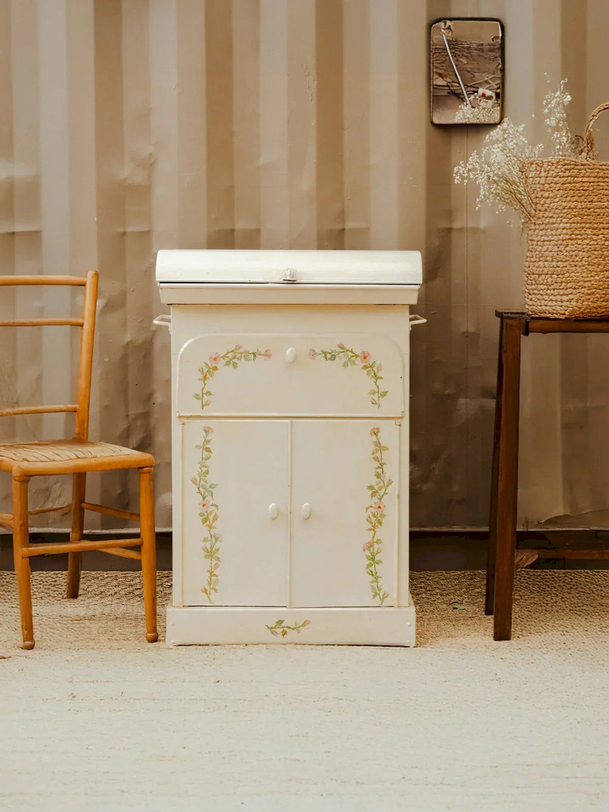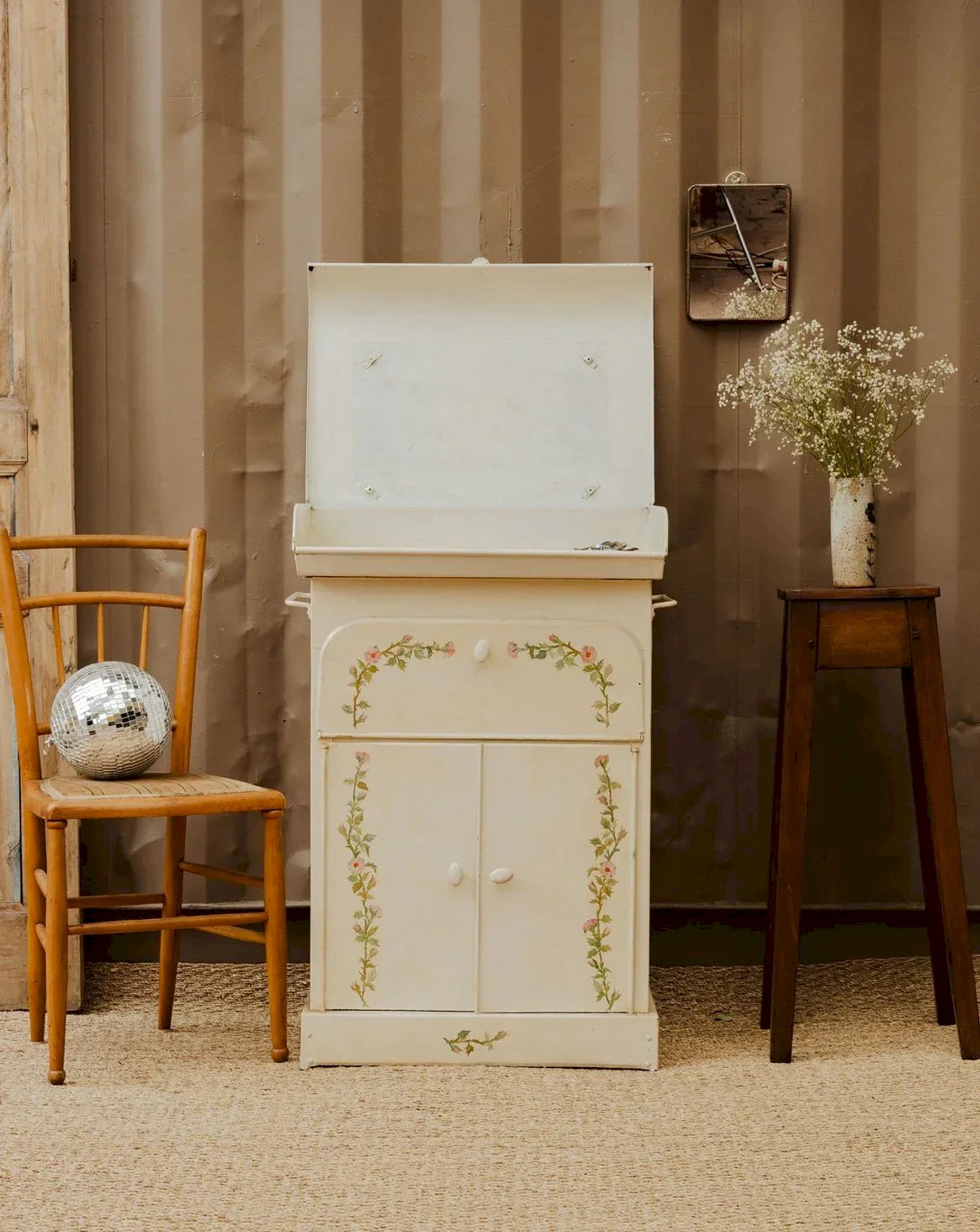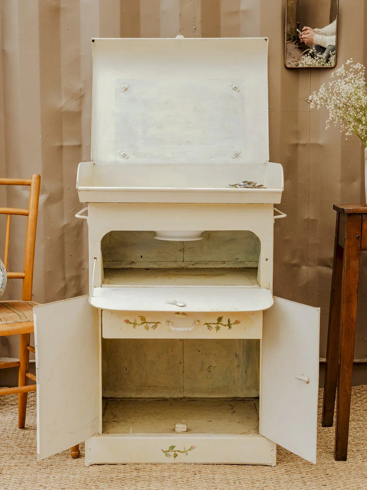 Découvrez cette coiffeuse ancienne tout métal, subtilement rehaussée d'une peinture réalisée à la main qui lui confère une patine singulière. Le plateau se relève pour laisser apparaître une vasque non d'origine et révèle l'ancien emplacement d'un miroir. Munie d'une niche discrète sous une porte relevable et deux portes inférieures qui dissimulent un tiroir à façade décorée, offrant un rangement malin. Des porte-serviettes latéraux complètent l'ensemble, parfait pour une salle de bains au charme rétro. Quelques marques d'usage qui font son authenticité. Longueur : 60 cm Largeur : 44 cm Hauteur : 90 cm Hauteur du compartiment vasque : 11 cm Hauteur tiroir : 16 cm Petite histoire de la coiffeuse Le terme “coiffeuse” apparaît au début du XXème siècle, alors que le meuble existe depuis l’Antiquité. Composée d’une tablette, d’un ou plusieurs miroirs et de nombreux tiroirs, la coiffeuse est un meuble de rangement, mais surtout un lieu de préparation où l’on se maquille, se parfume et se coiffe. Si à l’origine, ce mobilier correspond aussi bien aux hommes qu’aux femmes, il devient très vite l’incarnation du mystère féminin. La coiffeuse peut en effet se munir de cachettes secrètes, afin de recevoir la correspondance intime. Aujourd’hui, la coiffeuse revient sur le devant de la scène et fonctionne très bien dans tous les style d'intérieurs ! État:Occasion: Objet ayant été utilisé. Objet présentant quelques marques d'usure superficielle, ...Occasion: Objet ayant été utilisé. Objet présentant quelques marques d'usure superficielle, entièrement opérationnel et fonctionnant correctement. Il peut s'agir d'un modèle de démonstration ou d'un objet retourné en magasin après une courte période d'utilisation. les éventuelles imperfections. Marque:Debongout Type:Produit chiné Matériau:Métal Style:Campagne Personnalisé:Coiffeuses
