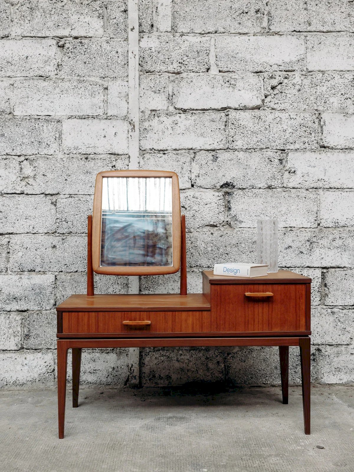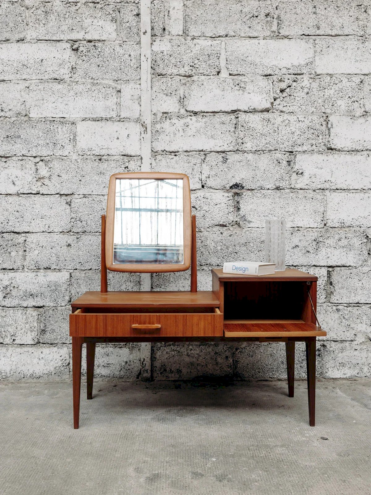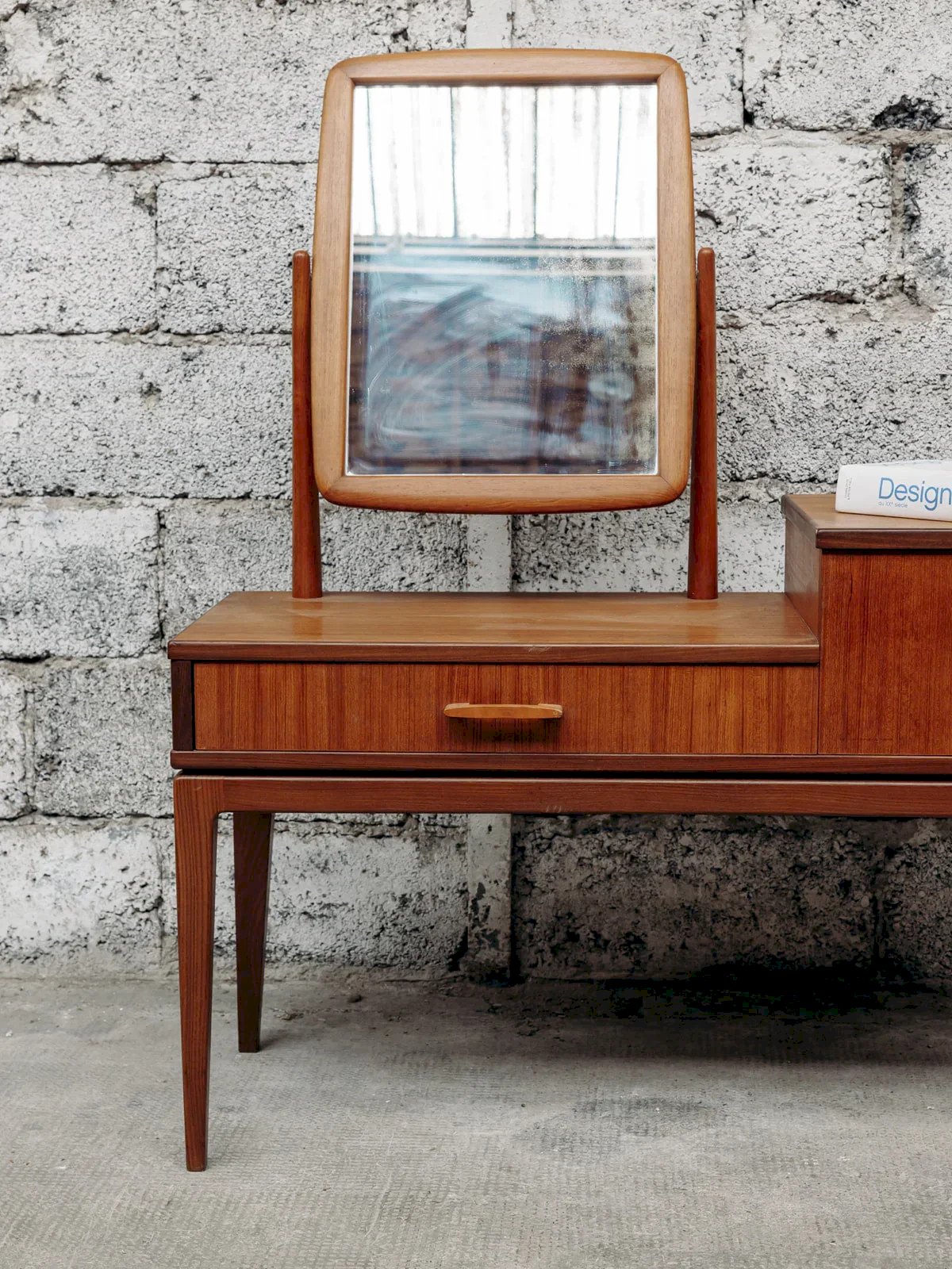 Alerte pépite ! Cette coiffeuse scandinave en teck incarne l’élégance et la simplicité du design nordique. Son bois naturel, associé à des lignes épurées et un miroir délicat, crée un meuble à la fois pratique et raffiné. Parfaite pour ajouter une touche de douceur et de fonctionnalité à votre chambre, elle allie esthétique minimaliste et espace de rangement astucieux. Exclusivité web, la rencontre se fera chez vous ! Longueur : 110 cm Largeur : 40,5 cm Hauteur : 65 cm Hauteur totale : 122 cm Hauteur sous ceinture (du sol au meuble) : 40 cm Largeur tiroir droit : 40 cm Hauteur tiroir droit : 21 cm Largeur tiroir gauche : 60 cm Hauteur tiroir gauche : 7 cm Petite histoire de la coiffeuse Le terme “coiffeuse” apparaît au début du XXème siècle, alors que le meuble existe depuis l’Antiquité. Composée d’une tablette, d’un ou plusieurs miroirs et de nombreux tiroirs, la coiffeuse est un meuble de rangement, mais surtout un lieu de préparation où l’on se maquille, se parfume et se coiffe. Si à l’origine, ce mobilier correspond aussi bien aux hommes qu’aux femmes, il devient très vite l’incarnation du mystère féminin. La coiffeuse peut en effet se munir de cachettes secrètes, afin de recevoir la correspondance intime. Aujourd’hui, la coiffeuse revient sur le devant de la scène et fonctionne très bien dans tous les style d'intérieurs ! État:Occasion: Objet ayant été utilisé. Objet présentant quelques marques d'usure superficielle, ...Occasion: Objet ayant été utilisé. Objet présentant quelques marques d'usure superficielle, entièrement opérationnel et fonctionnant correctement. Il peut s'agir d'un modèle de démonstration ou d'un objet retourné en magasin après une courte période d'utilisation. les éventuelles imperfections. Marque:Debongout Type:Produit chiné Matériau:Bois Style:Campagne Personnalisé:Coiffeuses