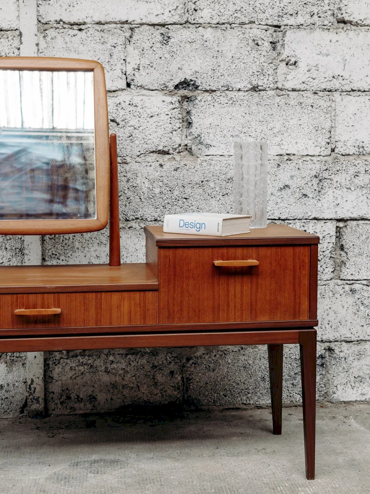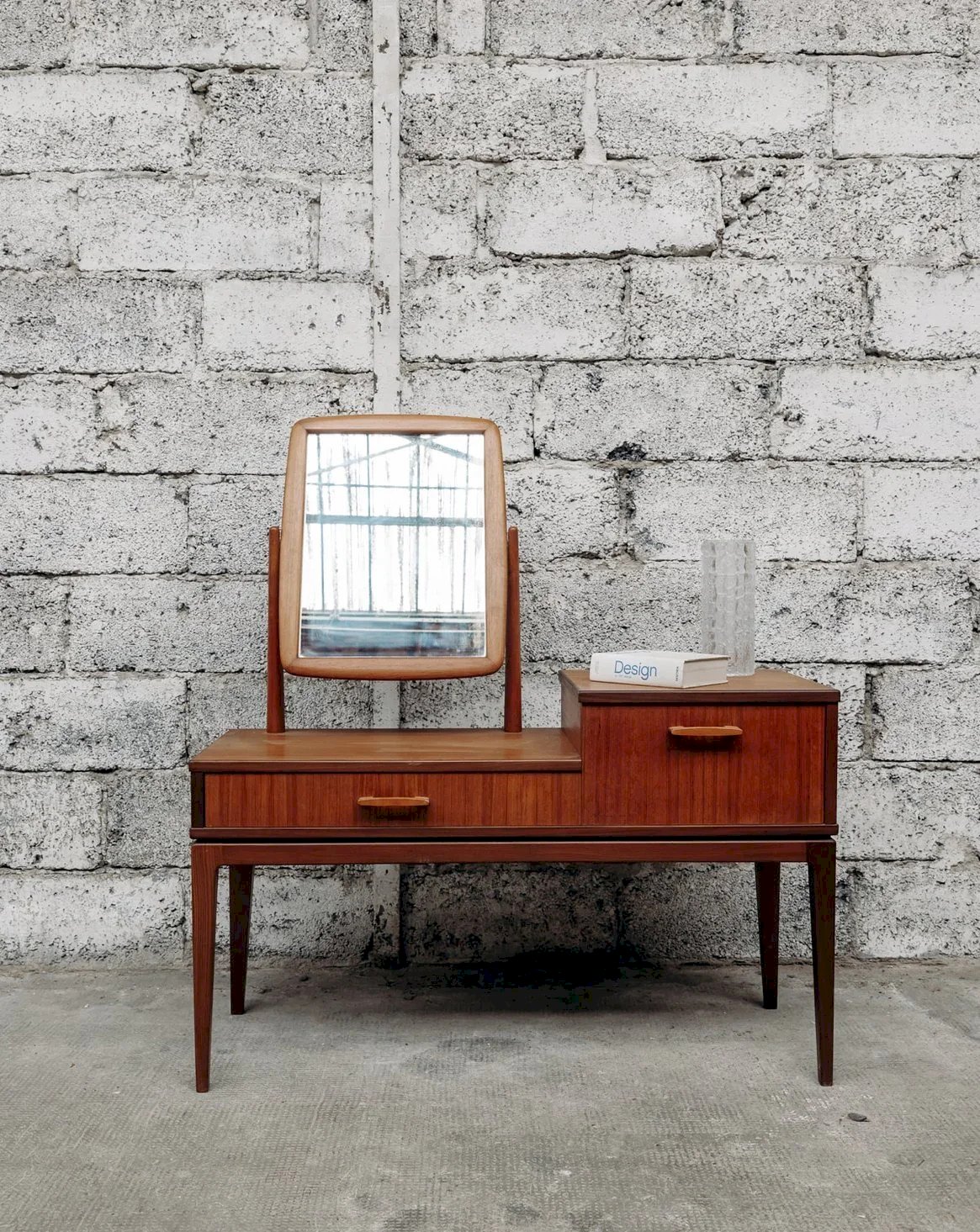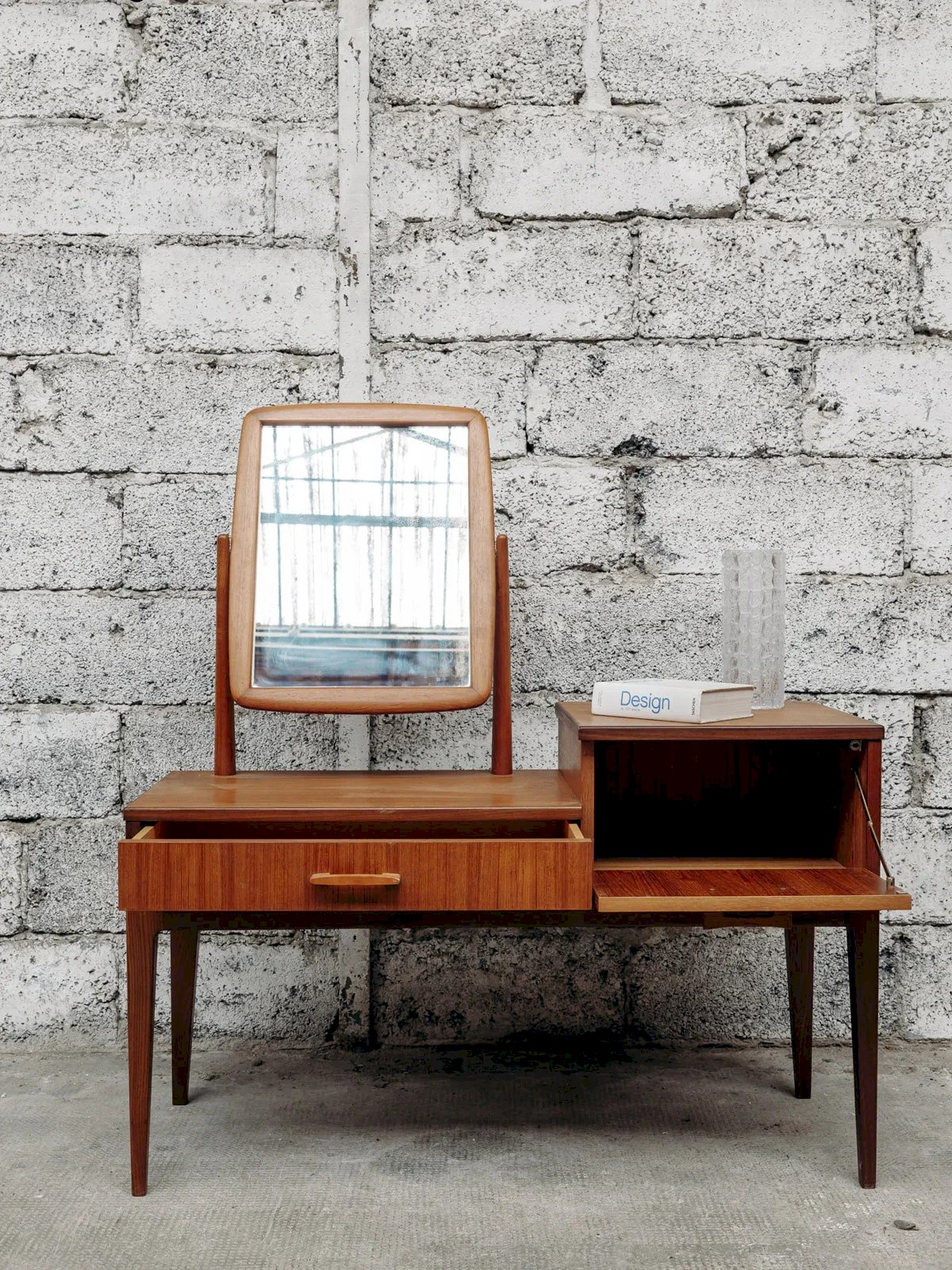 Alerte pépite ! Cette coiffeuse scandinave en teck incarne l’élégance et la simplicité du design nordique. Son bois naturel, associé à des lignes épurées et un miroir délicat, crée un meuble à la fois pratique et raffiné. Parfaite pour ajouter une touche de douceur et de fonctionnalité à votre chambre, elle allie esthétique minimaliste et espace de rangement astucieux. Exclusivité web, la rencontre se fera chez vous ! Longueur : 110 cm Largeur : 40,5 cm Hauteur : 65 cm Hauteur totale : 122 cm Hauteur sous ceinture (du sol au meuble) : 40 cm Largeur tiroir droit : 40 cm Hauteur tiroir droit : 21 cm Largeur tiroir gauche : 60 cm Hauteur tiroir gauche : 7 cm Petite histoire de la coiffeuse Le terme “coiffeuse” apparaît au début du XXème siècle, alors que le meuble existe depuis l’Antiquité. Composée d’une tablette, d’un ou plusieurs miroirs et de nombreux tiroirs, la coiffeuse est un meuble de rangement, mais surtout un lieu de préparation où l’on se maquille, se parfume et se coiffe. Si à l’origine, ce mobilier correspond aussi bien aux hommes qu’aux femmes, il devient très vite l’incarnation du mystère féminin. La coiffeuse peut en effet se munir de cachettes secrètes, afin de recevoir la correspondance intime. Aujourd’hui, la coiffeuse revient sur le devant de la scène et fonctionne très bien dans tous les style d'intérieurs ! État:Occasion: Objet ayant été utilisé. Objet présentant quelques marques d'usure superficielle, ...Occasion: Objet ayant été utilisé. Objet présentant quelques marques d'usure superficielle, entièrement opérationnel et fonctionnant correctement. Il peut s'agir d'un modèle de démonstration ou d'un objet retourné en magasin après une courte période d'utilisation. les éventuelles imperfections. Marque:Debongout Type:Produit chiné Matériau:Bois Style:Campagne Personnalisé:Coiffeuses
