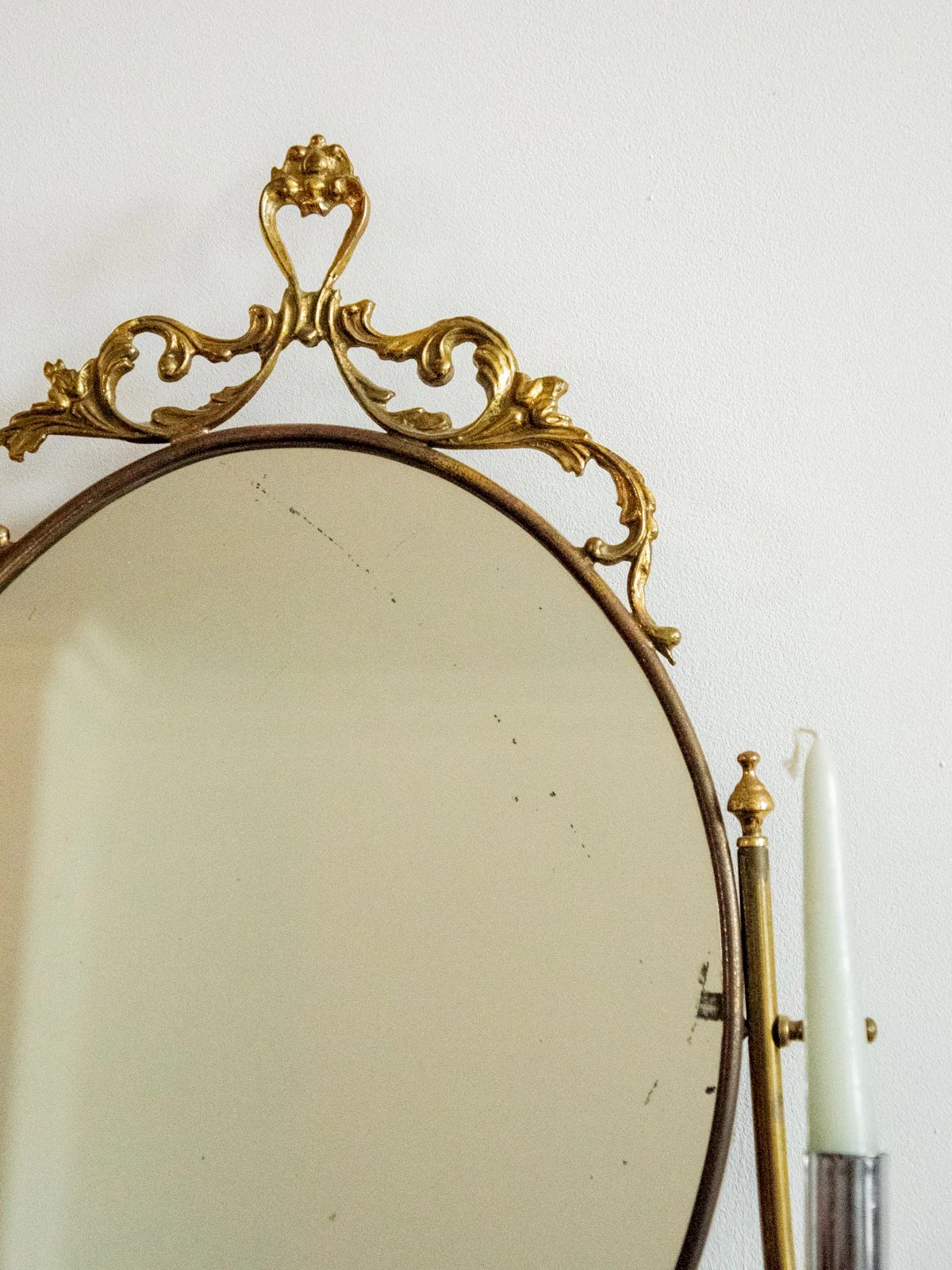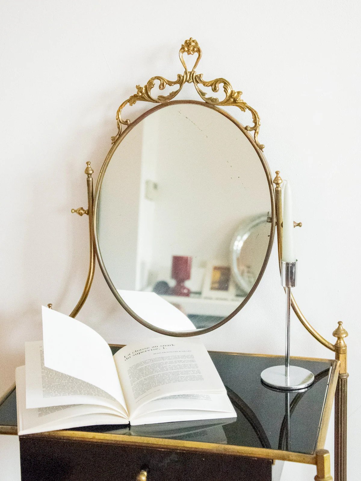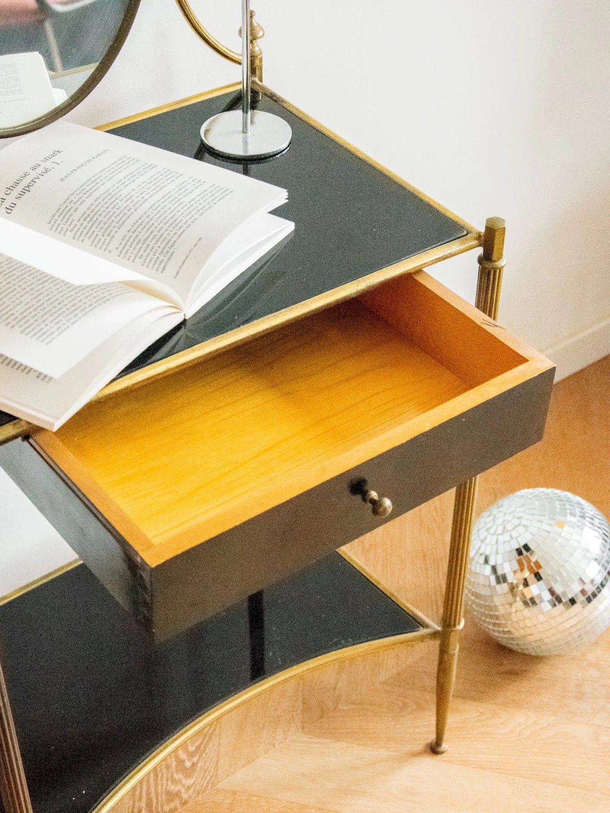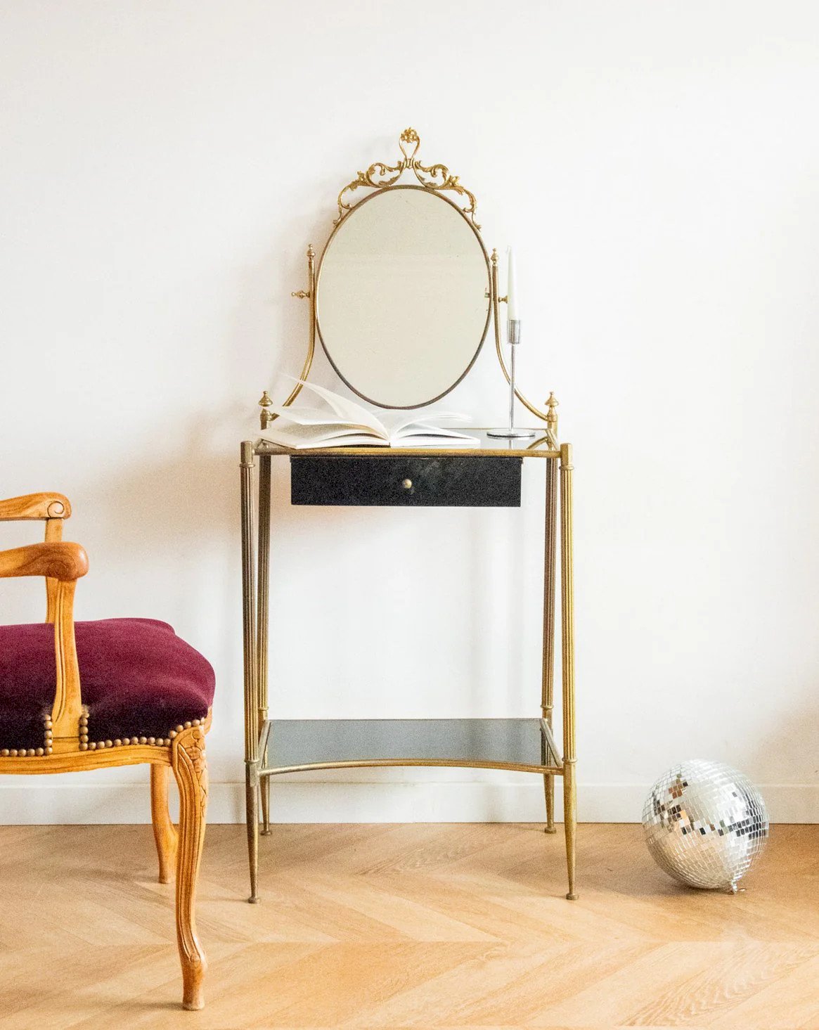Sublimez votre coin maquillage ou votre entrée avec cette coiffeuse en laiton et verre noir, dotée d'un miroir intégré qui souligne une élégance graphique. Un tiroir discret et une petite tablette offrent un rangement malin pour vos accessoires et soins, tandis que le plateau accueille vos essentiels avec aisance. Ses proportions élancées et sa finition contrastée apportent une atmosphère contemporaine et chaleureuse, idéale pour un intérieur urbain raffiné. Longueur : 50 cm Largeur : 36 cm Hauteur : 120 cm Hauteur sous plateau : 70 cm Hauteur tiroir : 6 cm Petite histoire de la coiffeuse Le terme “coiffeuse” apparaît au début du XXème siècle, alors que le meuble existe depuis l’Antiquité. Composée d’une tablette, d’un ou plusieurs miroirs et de nombreux tiroirs, la coiffeuse est un meuble de rangement, mais surtout un lieu de préparation où l’on se maquille, se parfume et se coiffe. Si à l’origine, ce mobilier correspond aussi bien aux hommes qu’aux femmes, il devient très vite l’incarnation du mystère féminin. La coiffeuse peut en effet se munir de cachettes secrètes, afin de recevoir la correspondance intime. Aujourd’hui, la coiffeuse revient sur le devant de la scène et fonctionne très bien dans tous les style d'intérieurs ! État:Occasion: Objet ayant été utilisé. Objet présentant quelques marques d'usure superficielle, ...Occasion: Objet ayant été utilisé. Objet présentant quelques marques d'usure superficielle, entièrement opérationnel et fonctionnant correctement. Il peut s'agir d'un modèle de démonstration ou d'un objet retourné en magasin après une courte période d'utilisation. les éventuelles imperfections. Marque:Debongout Type:Produit chiné Matériau:Laiton, Verre, Bois Style:Campagne Personnalisé:Coiffeuses