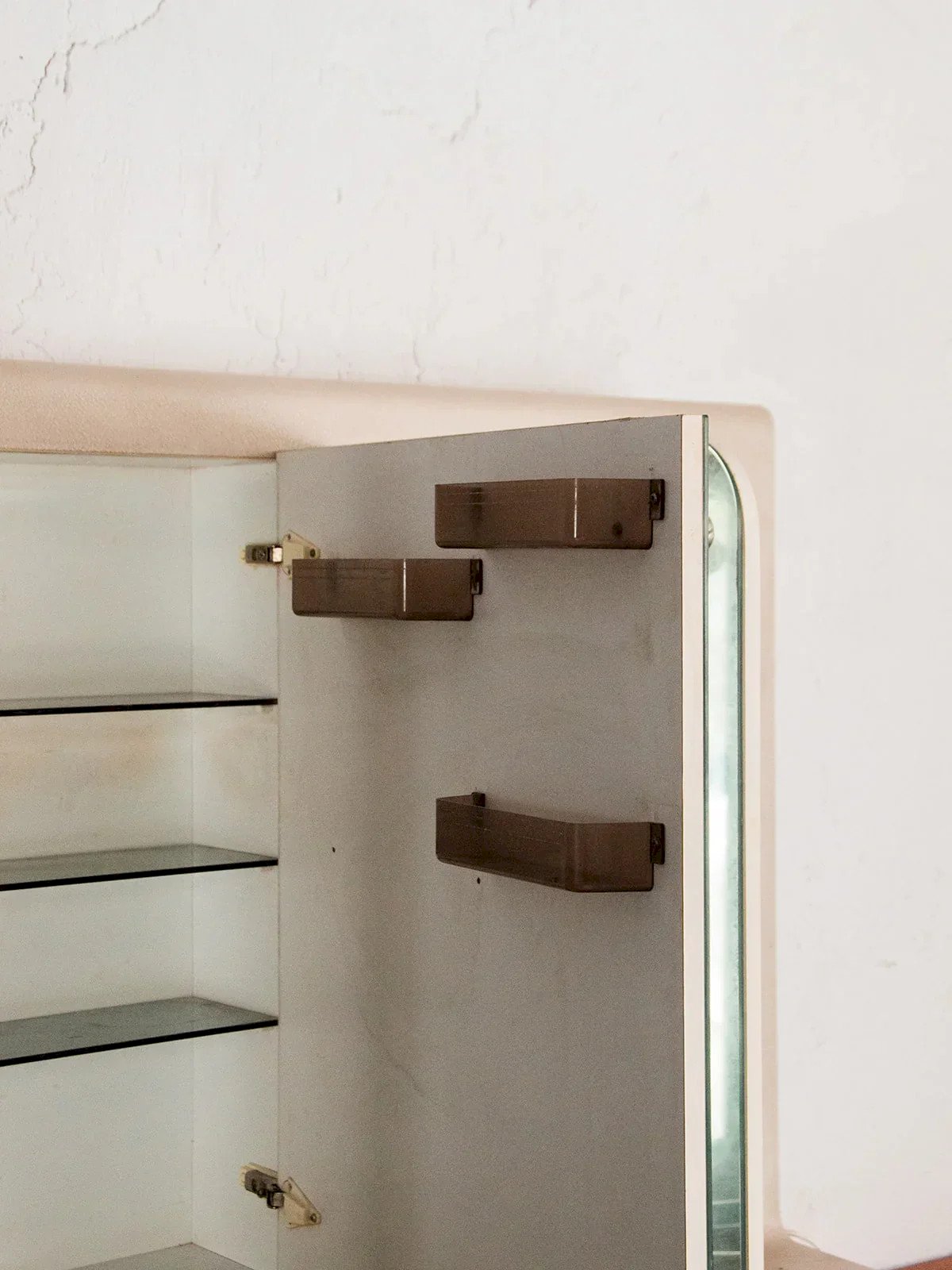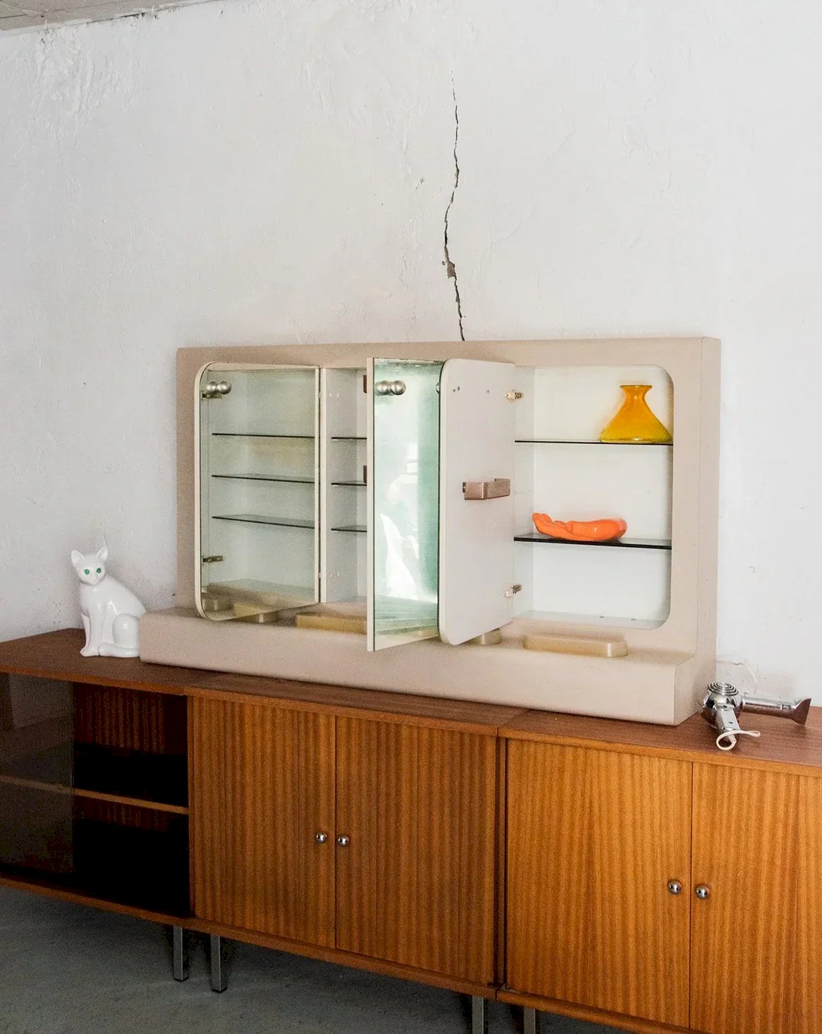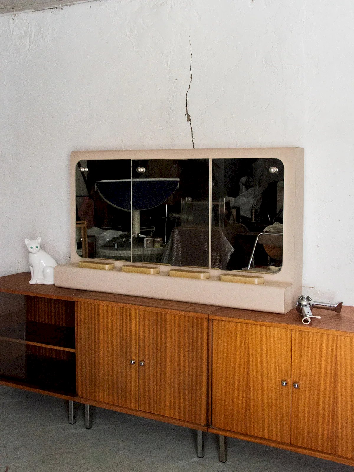 Découvrez ce miroir coiffeuse au charme rétro, parfait comme meuble de salle de bain ou d’appoint. Doté de miroirs en mercure et de quatre blocs lumineux, il offre une belle luminosité une fois le système électrique rebranché. Le meuble, en bois avec plaquage plastique, allie robustesse et style vintage. Derrière ses trois portes se trouvent trois étagères par compartiment, offrant un rangement généreux. Quelques marques du temps viennent souligner son authenticité. Longueur : 130 cm Hauteur : 75 cm Profondeur : 28 cm Petite histoire de la coiffeuse Le terme “coiffeuse” apparaît au début du XXème siècle, alors que le meuble existe depuis l’Antiquité. Composée d’une tablette, d’un ou plusieurs miroirs et de nombreux tiroirs, la coiffeuse est un meuble de rangement, mais surtout un lieu de préparation où l’on se maquille, se parfume et se coiffe. Si à l’origine, ce mobilier correspond aussi bien aux hommes qu’aux femmes, il devient très vite l’incarnation du mystère féminin. La coiffeuse peut en effet se munir de cachettes secrètes, afin de recevoir la correspondance intime. Aujourd’hui, la coiffeuse revient sur le devant de la scène et fonctionne très bien dans tous les style d'intérieurs ! État:Occasion: Objet ayant été utilisé. Objet présentant quelques marques d'usure superficielle, ...Occasion: Objet ayant été utilisé. Objet présentant quelques marques d'usure superficielle, entièrement opérationnel et fonctionnant correctement. Il peut s'agir d'un modèle de démonstration ou d'un objet retourné en magasin après une courte période d'utilisation. les éventuelles imperfections. Marque:Debongout Type:Produit chiné Matériau:Bois, Mercure Style:Campagne Personnalisé:Coiffeuses