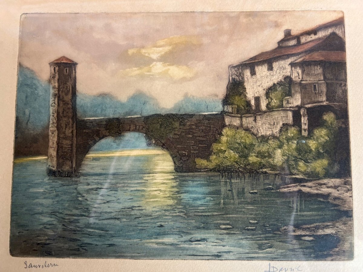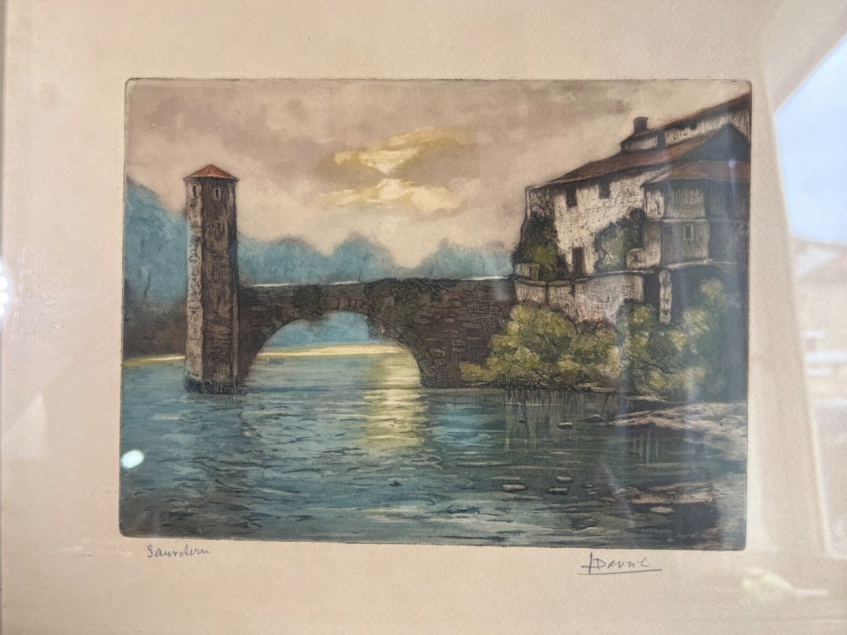 Charmante eau-forte ancienne signée Davril , pseudonyme de  Lucien d’Asselbourne (1873–1952) , représentant le célèbre  pont de Sauveterre-de-Béarn , au cœur du Pays Basque. Cette œuvre délicatement rehaussée de couleurs douces capture à merveille l’atmosphère paisible de ce lieu historique, baigné par la lumière d’un soleil couchant. Davril, artiste franco-luxembourgeois, est reconnu pour ses scènes de villages et paysages pittoresques, qu’il traite avec sensibilité et finesse dans ses gravures à l’eau-forte. ?  Détails  : Titre  :  Sauveterre  (inscrit à la main) Artiste  : Signé  Davril , pseudonyme de  Lucien d’Asselbourne (1873–1952) Technique  : Eau-forte originale, rehaussée à la main Dimensions avec cadre  : 37 x 32 cm (14.6 x 12.6 in) Dimensions de l’illustration  : 24 x 18 cm (9.4 x 7.1 in) Encadrement  : Bois foncé, verre simple, montage ancien État  : Très bon état général. L’œuvre est propre et bien conservée. Quelques légères marques d’âge sur le passe-partout. Le cadre présente des traces d’usage cohérentes avec son âge. Un bel hommage au patrimoine du sud-ouest de la France, idéal pour les collectionneurs d’eaux-fortes régionales, les amoureux du Pays Basque ou les amateurs de paysages anciens. Type:Eau forte Caractéristiques:Signée Thème:Paysage