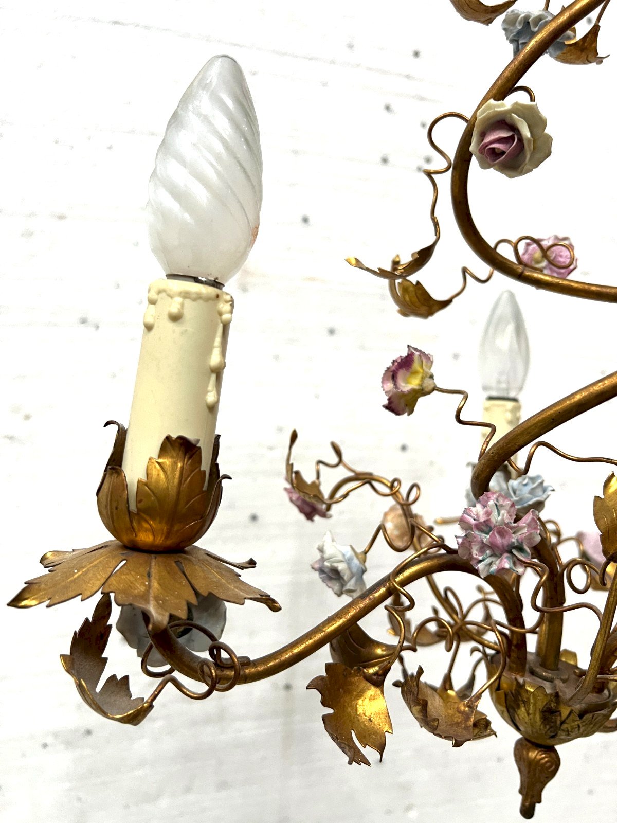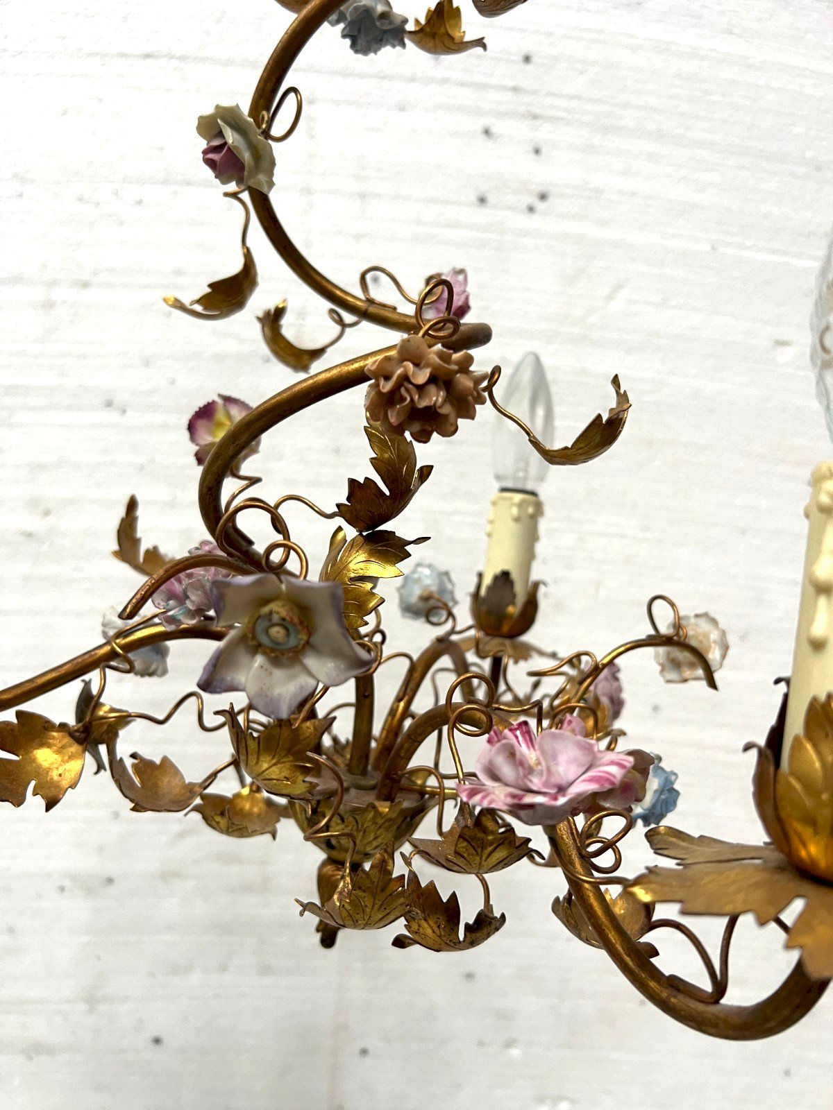 Lustre de style Louis XVI en métal doré et fleurs de porcelaine XX siècle