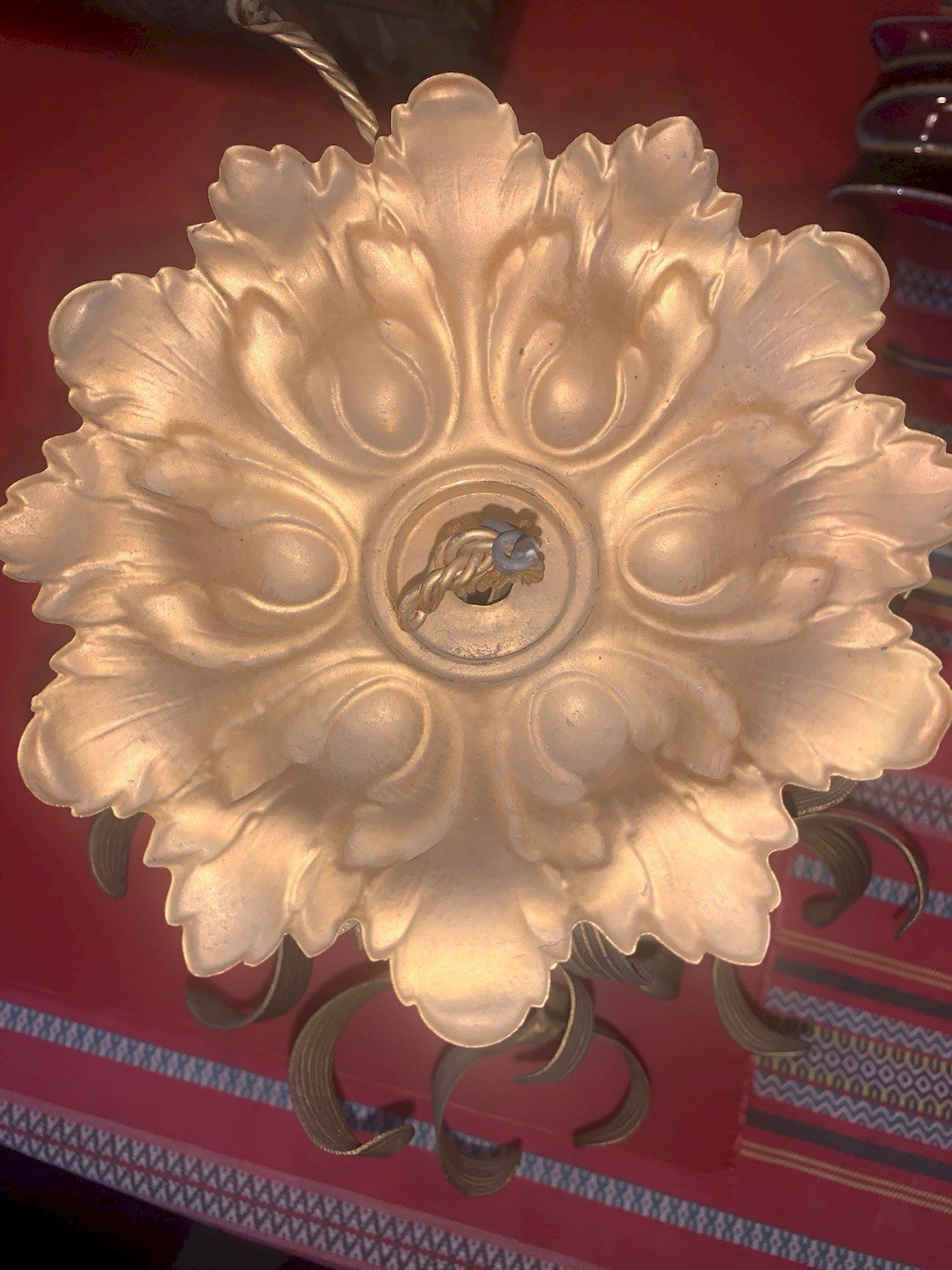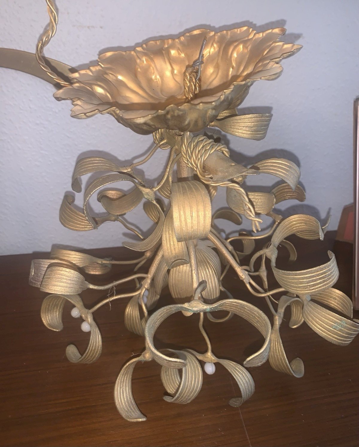 Beau petit lustre art nouveau 1 lumière douille baïonnette Bronze Boule de gui A électrifier Manque des boules en opaline blanche Diamètre:26cm Hauteur:26cm Type:Suspension, Lustre Période:Art Nouveau Sous-type:Non-spécifié Couleur dominante:Doré Matière:Bronze Type d'éclairage:Standard Caractéristiques:A baïonnette