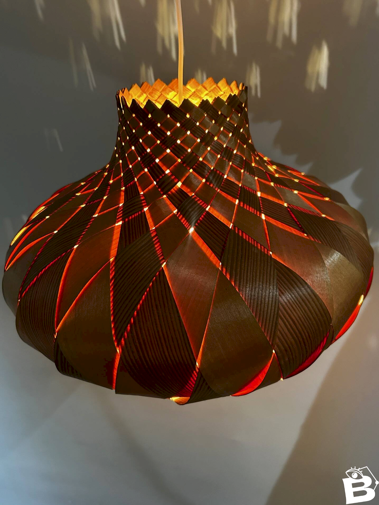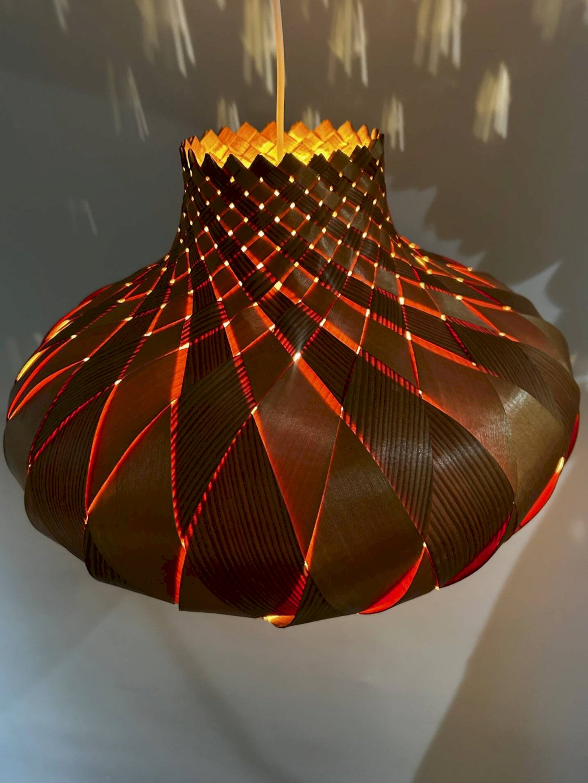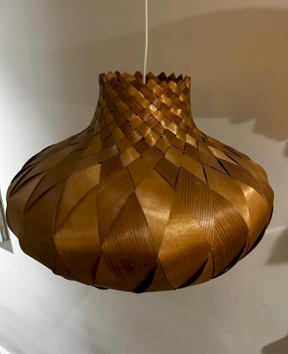 Plafonnier des années 60 en lames de bois tressées.Dimensions pour le plafonnier seulement, sans fil.