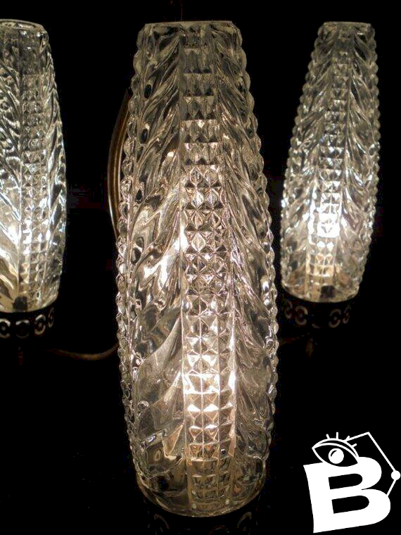 Lustre vintage à 3 branches composé d’une structure en laiton (comportant des débuts d’oxydation visibles sur photos mais très discrets une fois le lustre en place et de 3 « globes » en verre.Hauteur totale avec chaînette: 55.5 cm.Largeur: 29 X 29 X 29 cm.Poids: 1.750 kg.Douilles E14.