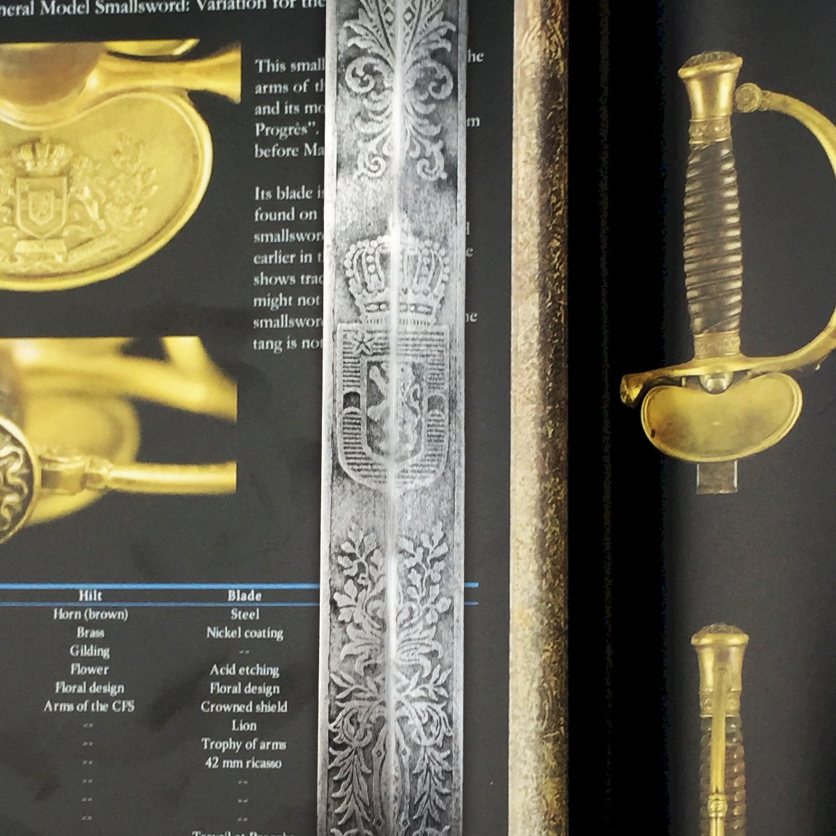 Superbe et très rare épée coloniale belge . Garde décorée d'ornements floraux, feuilles de lauriers et drapeaux, garde à une branche mobile, parfaitement fonctionnelle non réglementaire avec lion et monogramme du Roi Leopold. Avec des restes de sa superbe dorure d'origine. GRAVURES COMPLETES SUR LA LAME : '' BLASON BELGE AVEC 1 ETOILE '' + '' GRAVURES D'ARMES ET DE FLEURS... ''. Filigranne complet sur poignée en corne. Une magnifique et très rare pièce dans son jus, en très bon état de conservation, à saisir pour tout collectionneur avertis et passionné par l'amée française. Fourreau à un anneau. Lame brillante avec des traces dûes au temps. Très agréable à tenir en mains et à observer en vitrine ! Splendide pièce, totalement originale ! Pièce extrêmement rare, surtout dans cet état, prix en adéquation.