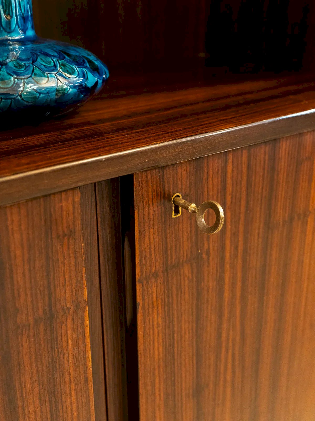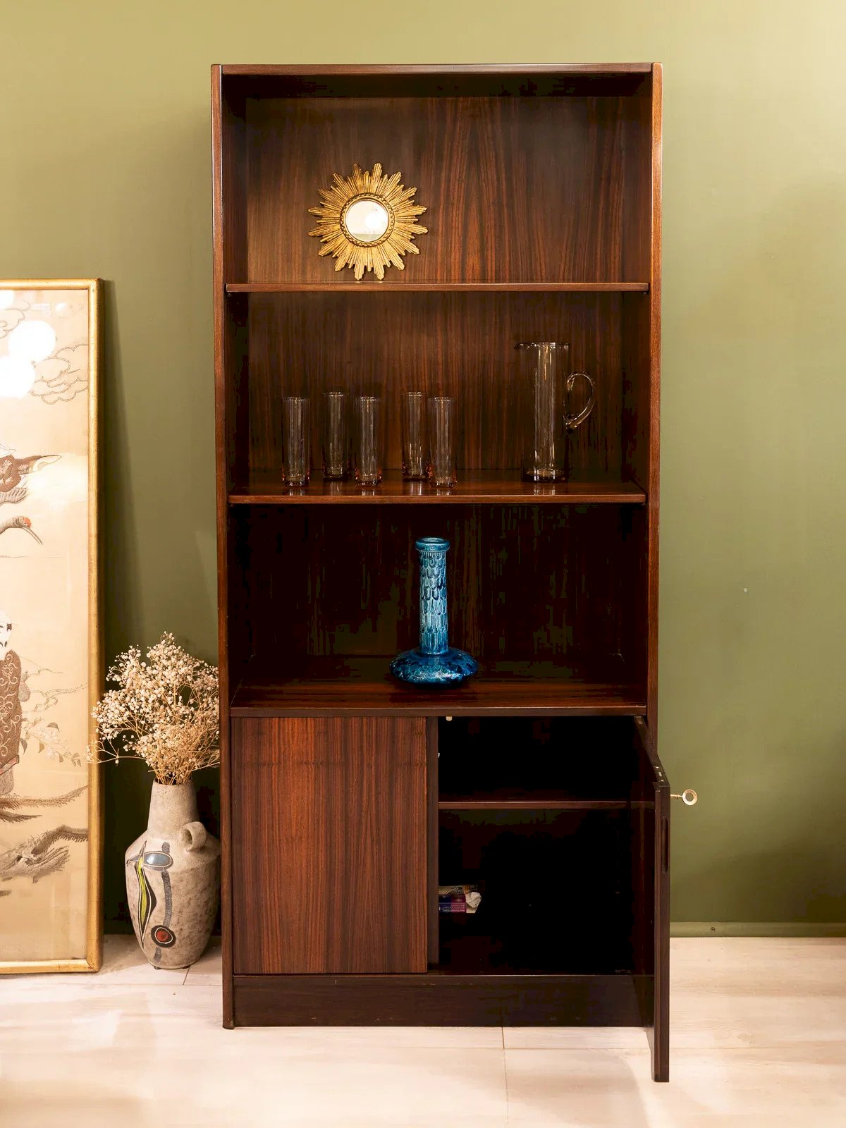 Découvrez cette magnifique bibliothèque des années 60, fabriquée en palissandre de Rio, une essence boisée à la fois élégante et durable. Avec ses 3 niches dotées d'étagères réglables, elle offre un espace de rangement optimal pour vos livres et objets de décoration. Ses 2 portes avec clé et serrure en laiton ajoutent une touche de charme vintage tout en garantissant la sécurité de vos trésors. Un véritable atout pour votre intérieur, alliant fonctionnalité et esthétique retro. Longueur : 82 cm Largeur : 36,5 cm Hauteur : 182 cm État:Occasion: Objet ayant été utilisé. Objet présentant quelques marques d'usure superficielle, ...Occasion: Objet ayant été utilisé. Objet présentant quelques marques d'usure superficielle, entièrement opérationnel et fonctionnant correctement. Il peut s'agir d'un modèle de démonstration ou d'un objet retourné en magasin après une courte période d'utilisation. les éventuelles imperfections. Marque:Debongout Type:Produit chiné Matériau:Palissandre de Rio Style:Contemporain Personnalisé:Bibliothèques