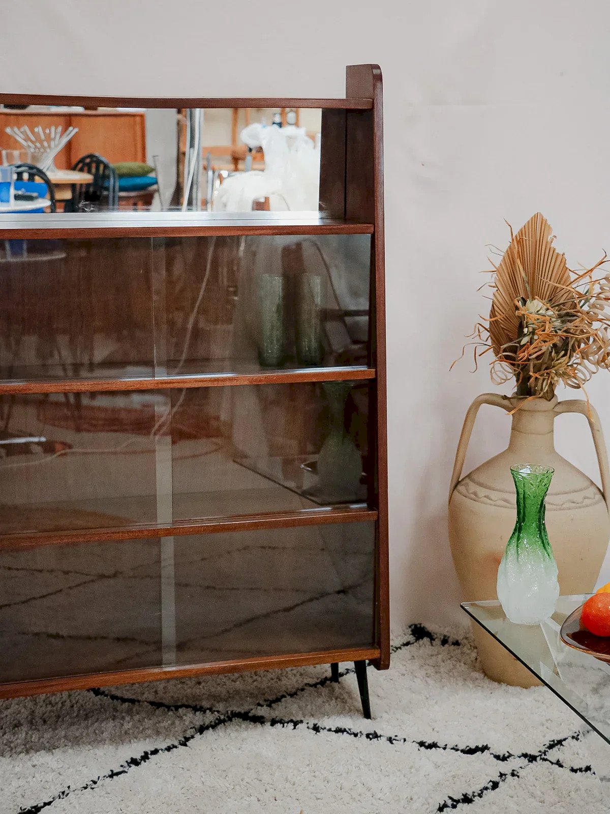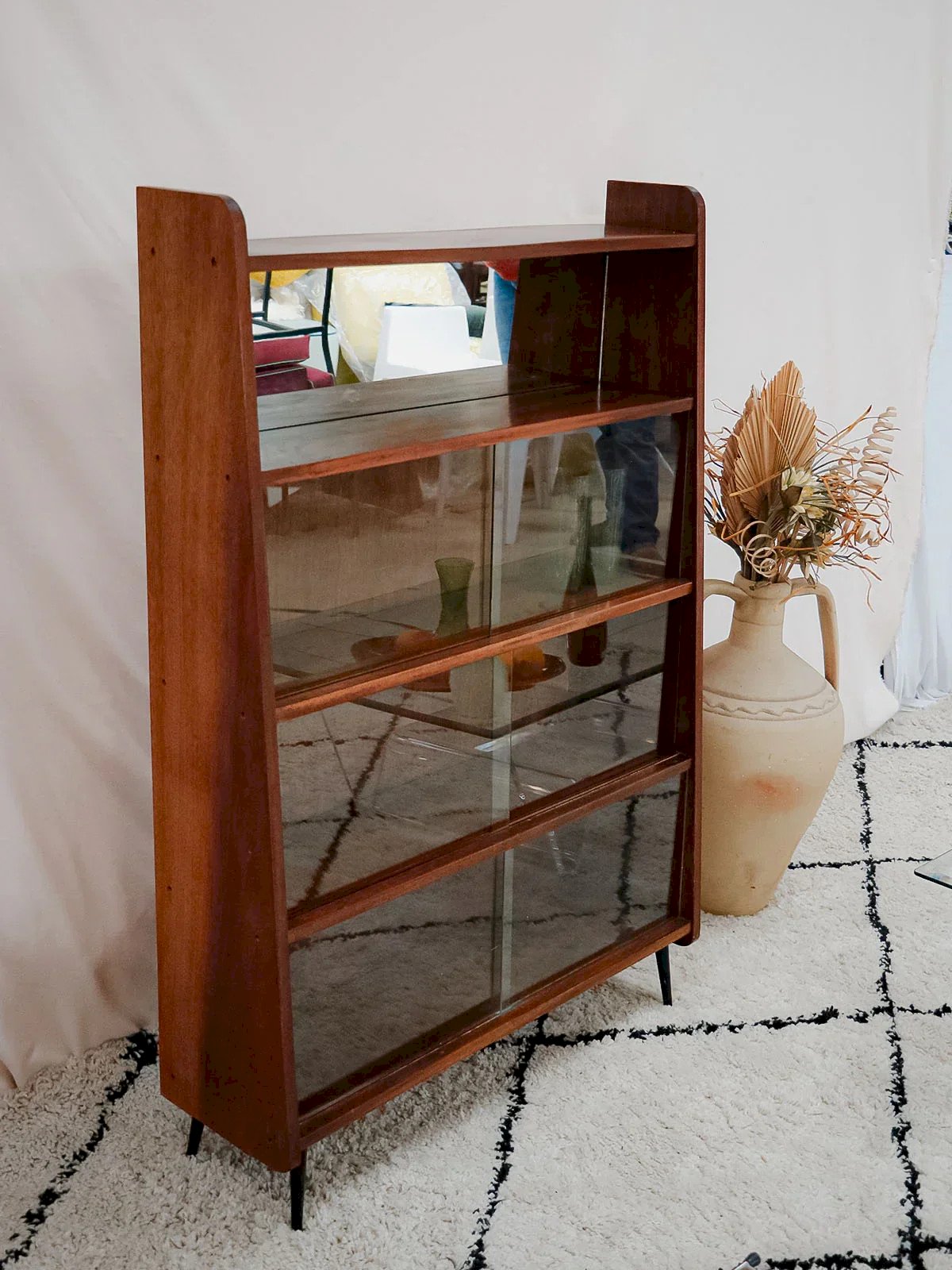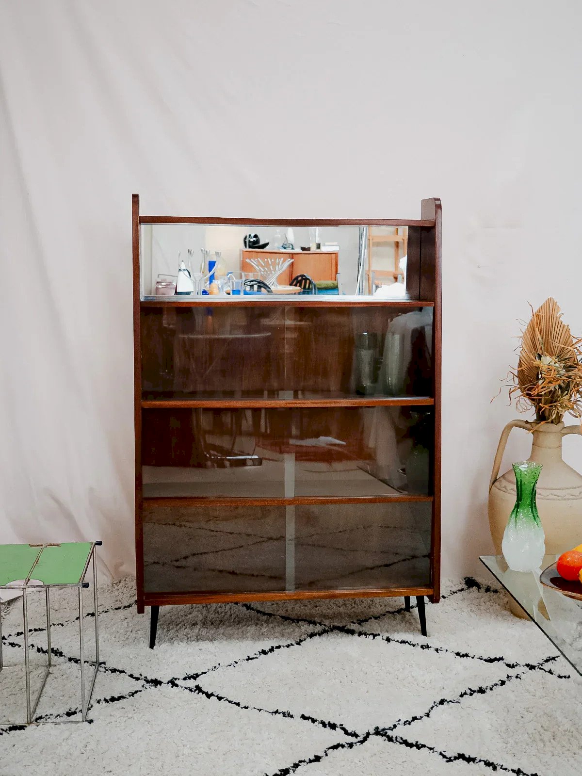 Découvrez cette bibliothèque des années 50 signée Fonteneau, habillée d'un plaquage acajou chaleureux et dessinée dans des proportions élancées qui s'intègrent facilement à un salon ou un bureau. Son agencement pratique, trois étagères avec vitrines et une étagère équipée d'un miroir, permet d'exposer livres et objets tout en jouant sur la profondeur ; les pieds en métal noir apportent une touche graphique et contemporaine. Une pièce française au charme discret, idéale pour une ambiance raffinée et contenue. Longueur : 85 cm Largeur : 15,5 cm Hauteur : 126 cm Hauteur de la niche : 25 cm État:Occasion: Objet ayant été utilisé. Objet présentant quelques marques d'usure superficielle, ...Occasion: Objet ayant été utilisé. Objet présentant quelques marques d'usure superficielle, entièrement opérationnel et fonctionnant correctement. Il peut s'agir d'un modèle de démonstration ou d'un objet retourné en magasin après une courte période d'utilisation. les éventuelles imperfections. Marque:Debongout Type:Produit chiné Matériau:Acajou, Verre, Bois Style:Contemporain Personnalisé:Bibliothèques