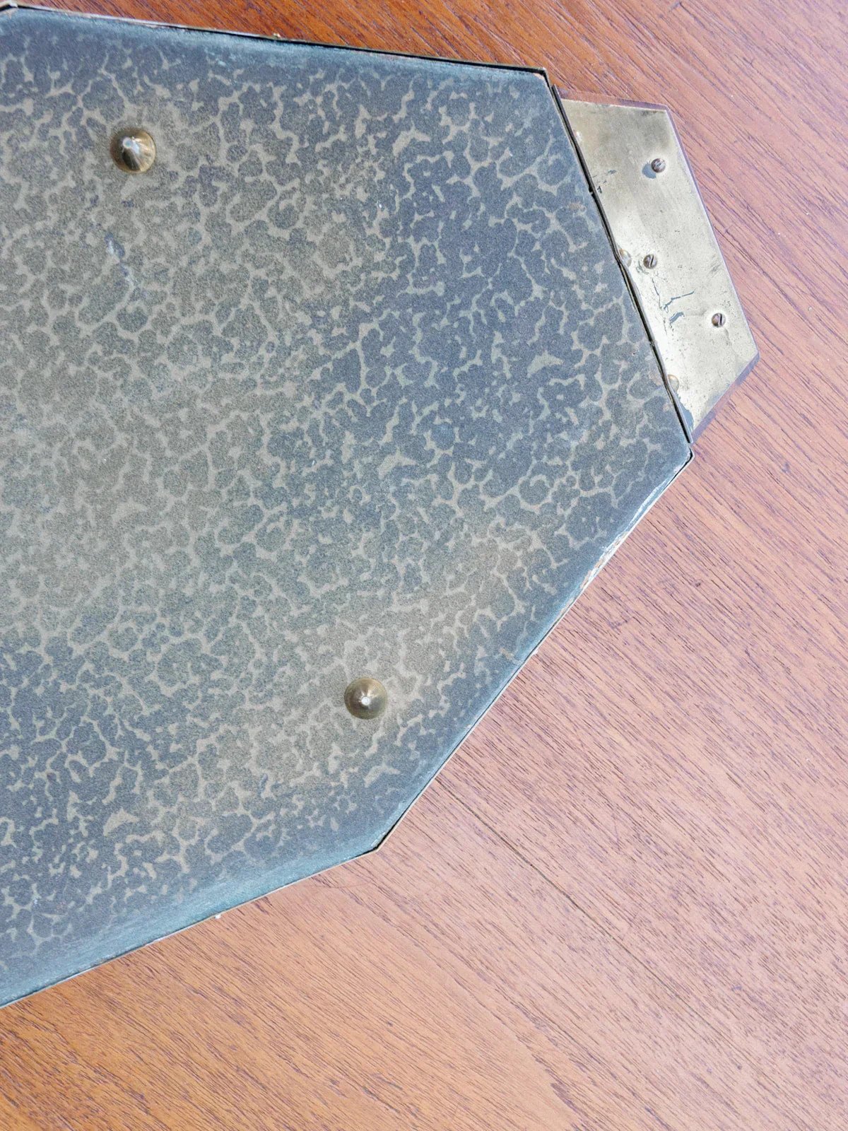 Apportez une touche d'élégance à votre intérieur avec notre plateau en métal et miroir, arborant une belle forme octogonale. Ses poignées en bois foncé ajoutent une note chaleureuse et design, tandis que le miroir apporte une touche de raffinement. Idéal pour servir vos boissons ou mettre en valeur vos objets décoratifs, cet accessoire allie fonctionnalité et esthétisme. Un indispensable pour les amateurs de décoration raffinée ! Longueur : 61 cm Largeur : 24,5 cm État:Occasion: Objet ayant été utilisé. Objet présentant quelques marques d'usure superficielle, ...Occasion: Objet ayant été utilisé. Objet présentant quelques marques d'usure superficielle, entièrement opérationnel et fonctionnant correctement. Il peut s'agir d'un modèle de démonstration ou d'un objet retourné en magasin après une courte période d'utilisation. les éventuelles imperfections. Marque:Debongout Type:Produit chiné Matériau:Métal, Verre, Bois Style:Campagne