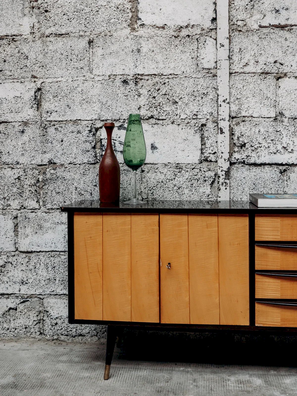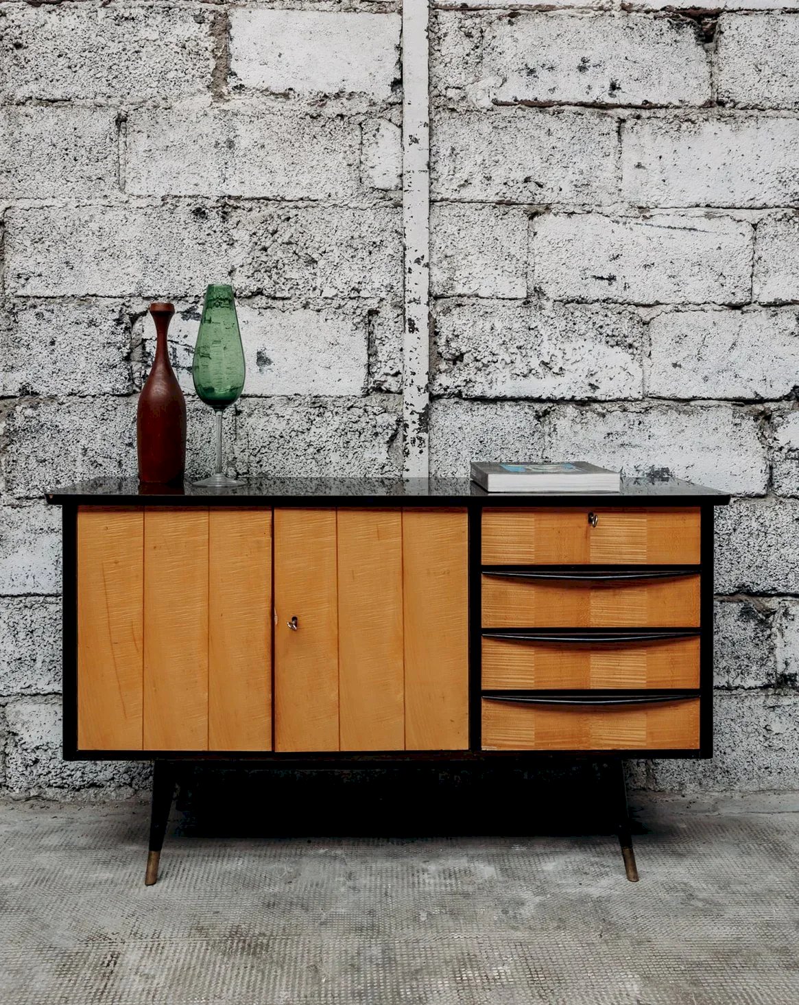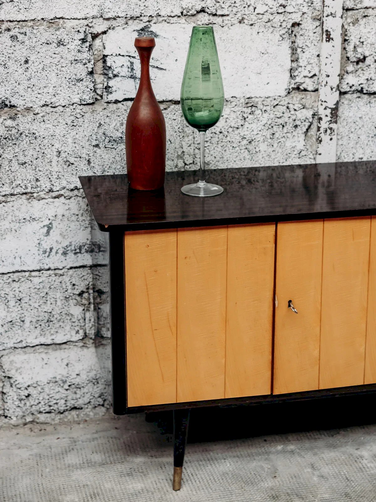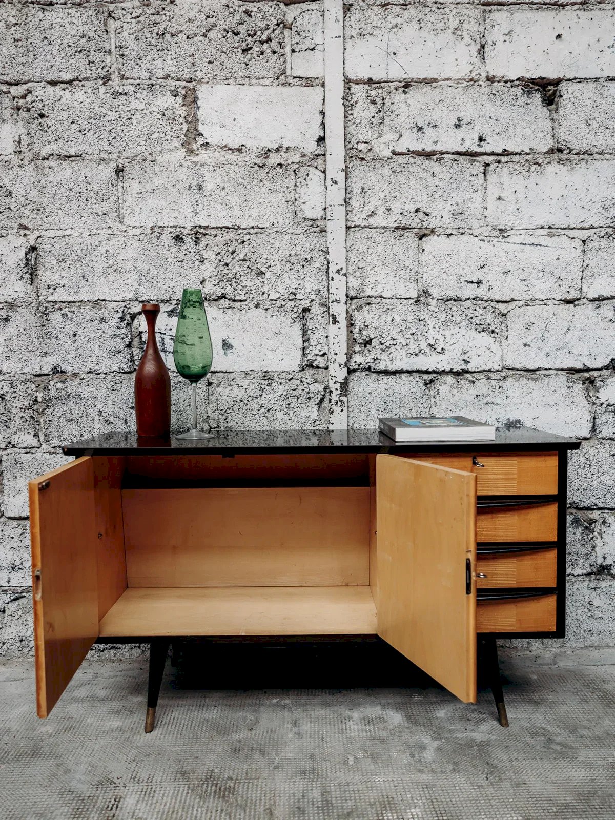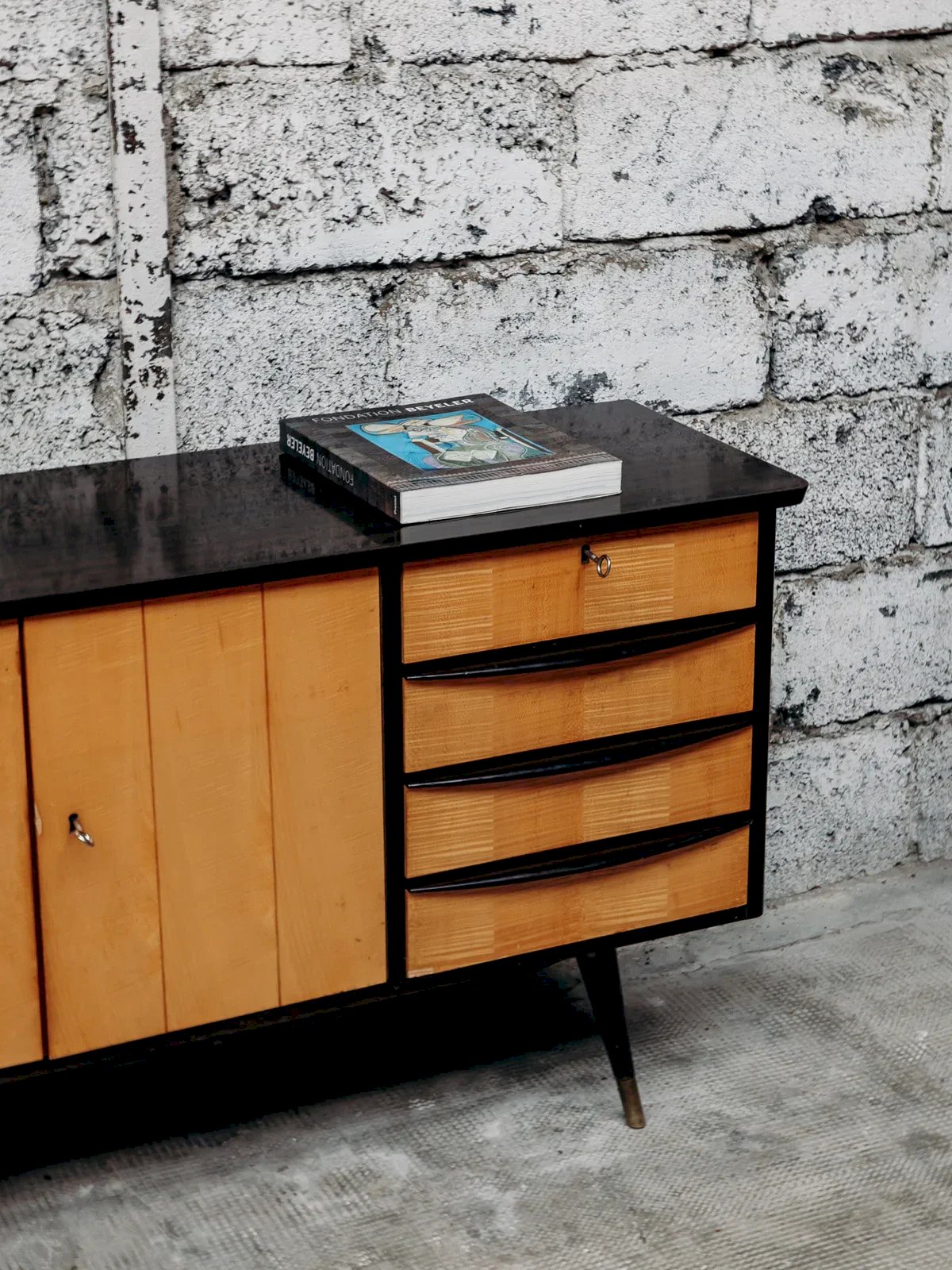 Apportez une touche moderne à votre intérieur avec cette enfilade bi-ton en bois, alliant élégance et praticité. Dotée de 4 tiroirs et d’un placard à 2 portes, elle offre un rangement spacieux pour vos essentiels. Ses pieds compas en bois apportent une touche rétro et stylée. Livrée avec 2 clés, cette enfilade combine sécurité et esthétisme. Un meuble parfait pour organiser votre salon ou votre salle à manger avec charme. Longueur : 125 cm Hauteur : 73 cm Hauteur tiroir : 8 cm Profondeur : 41 cm Petite histoire de l’enfilade C’est dans les années 1950 que les premières enfilades scandinaves font leur apparition. L'enfilade de style scandinave fait partie du mobilier innovant d'après-guerre. Ses lignes aériennes et ses volumes rectilignes reprennent le style sobre d'inspiration moderniste, avec toutes les caractéristiques des designers norvégiens, suédois, finlandais… L’enfilade scandinave est réalisée en ébénisterie traditionnelle, généralement en bois de teck. Elle est utilisée comme remplacement du traditionnel buffet de salle à manger et fait maintenant office de console. Pour un salon design et agréable à vivre, l'enfilade est le meuble parfait ! État:Occasion: Objet ayant été utilisé. Objet présentant quelques marques d'usure superficielle, ...Occasion: Objet ayant été utilisé. Objet présentant quelques marques d'usure superficielle, entièrement opérationnel et fonctionnant correctement. Il peut s'agir d'un modèle de démonstration ou d'un objet retourné en magasin après une courte période d'utilisation. les éventuelles imperfections. Marque:Debongout Type:Produit chiné Matériau:Bois Style:Contemporain Personnalisé:Enfilades