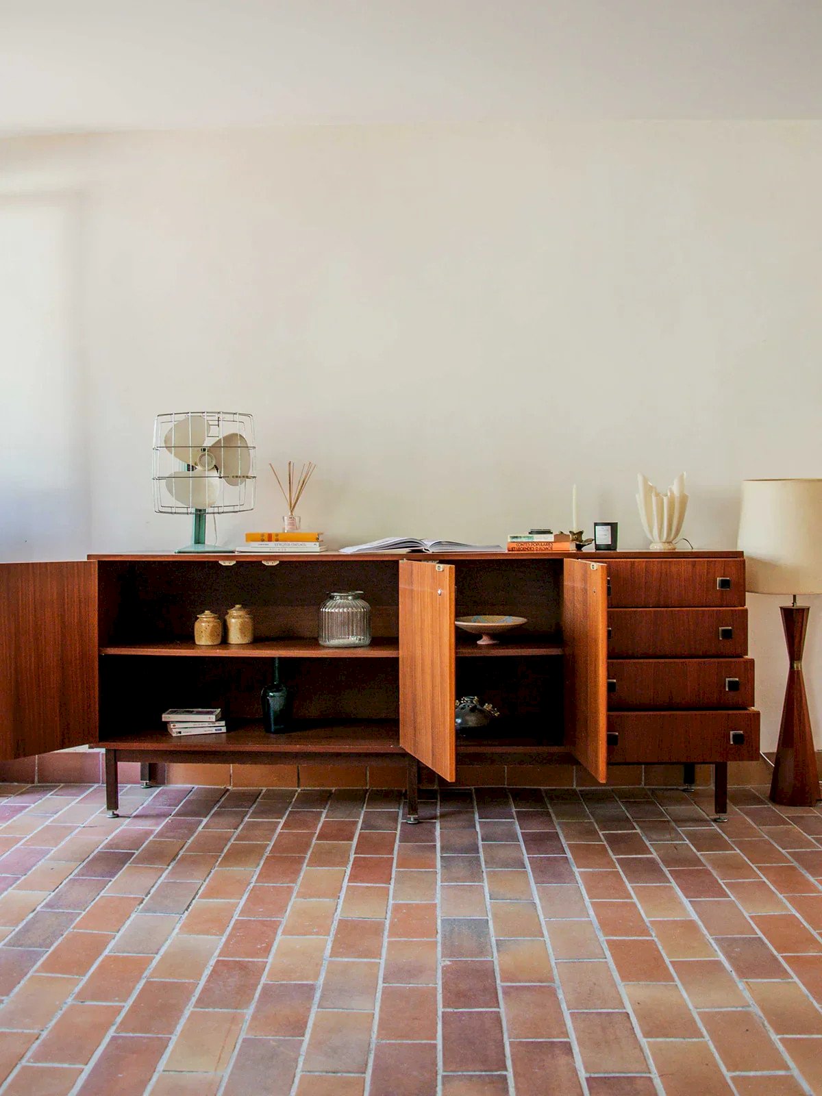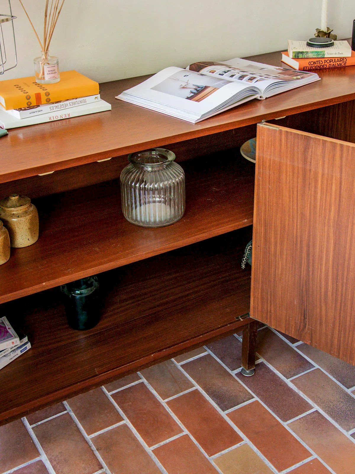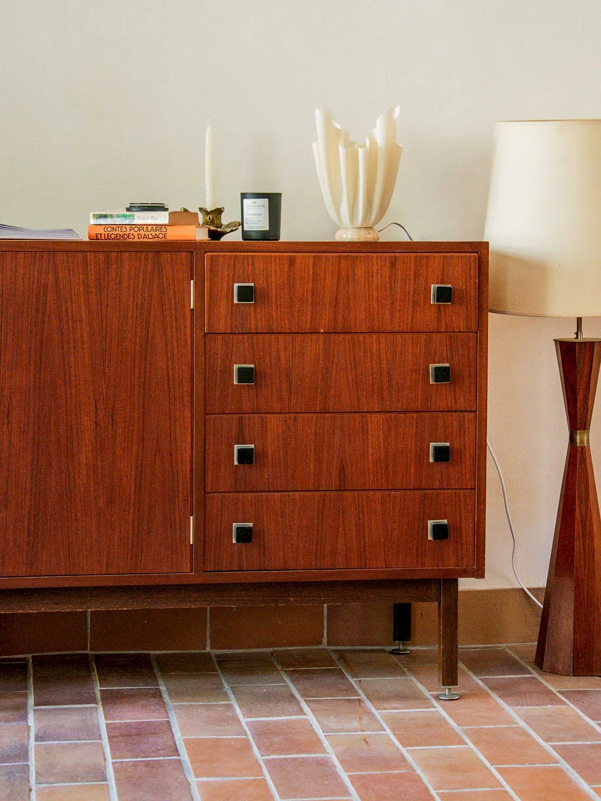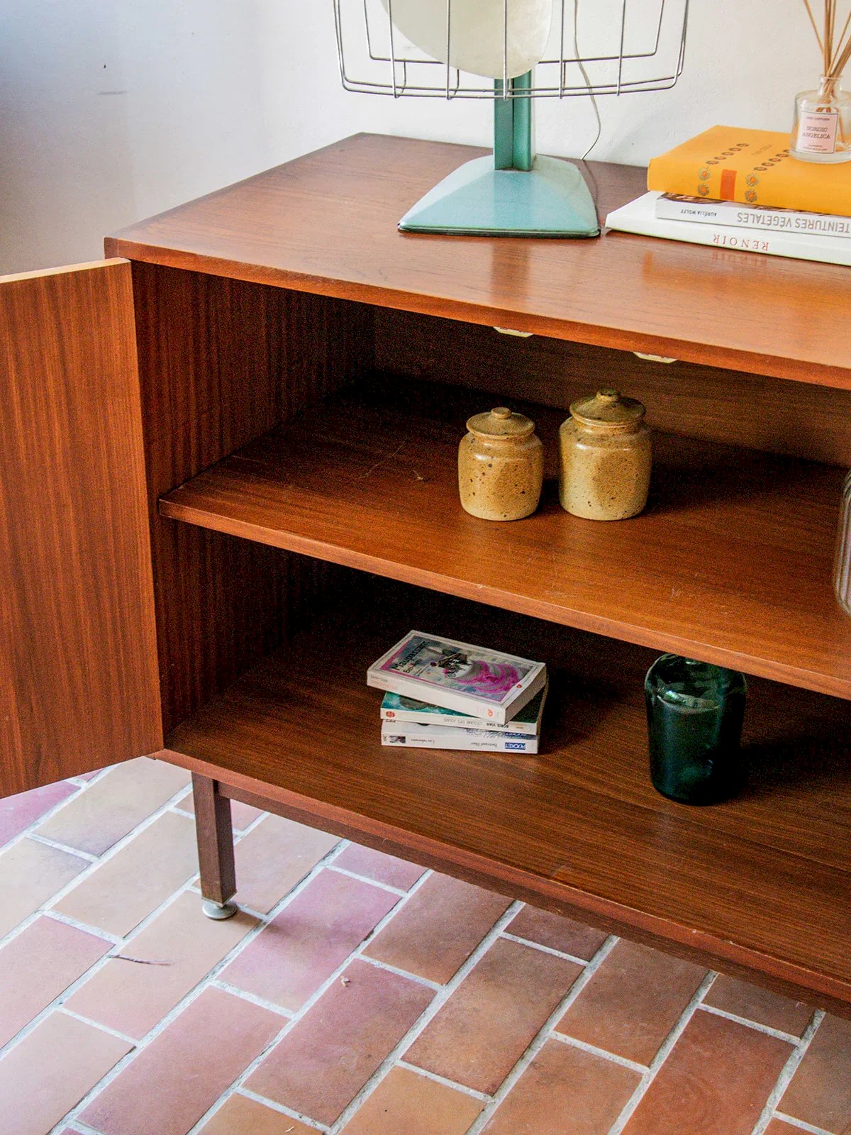 Grande enfilade pieds métal petits pieds fins x 6 petites poignées rondes 2 placards 3 portes 4 tiroirs 206 x 50 85H T13 étagères x 2 28cm Grande enfilade du fabriquant belge Comineurop des années 70. Ligne moderniste, avec des jolies poignées, on aime beaucoup son design qui saura apporter du cachet à votre intérieur. De grands compartiments de rangement et des pieds métalliques réglables, c'est une pièce pratique, bien pensée et robuste. On l'imagine comme enfilade ou comme meuble TV / hifi. Bel état général. A noter : c'est une pièce lourde, non démontable. Pensez à vérifier les dimensions et à prévoir de l'aide au moment de la livraison ! Dimensions : largeur 206cm - hauteur 85cm - profondeur 50cm hauteurs étagères 28 et 27,5cm 1200€ Découvrez cette magnifique grande enfilade des années 70, fabriquée par Comineurop. Avec ses lignes modernistes et ses élégantes poignées rondes, elle saura apporter une touche de cachet à votre intérieur. Ce meuble, à la fois pratique et robuste, offre de grands compartiments de rangement ainsi que 4 tiroirs, idéal pour organiser votre espace. Ses pieds métalliques réglables lui confèrent une belle esthétique. Parfaite en tant qu'enfilade ou meuble TV, elle est en bel état général. Pensez à vérifier les dimensions et à prévoir de l'aide pour la livraison, car cette pièce est lourde et non démontable. Dimensions : 206 x 50 x 85 cm. Prix : 1200€. Longueur : 206 cm Hauteur : 85 cm Hauteur tiroir : 13 cm Profondeur : 50 cm Petite histoire de l’enfilade C’est dans les années 1950 que les premières enfilades scandinaves font leur apparition. L'enfilade de style scandinave fait partie du mobilier innovant d'après-guerre. Ses lignes aériennes et ses volumes rectilignes reprennent le style sobre d'inspiration moderniste, avec toutes les caractéristiques des designers norvégiens, suédois, finlandais… L’enfilade scandinave est réalisée en ébénisterie traditionnelle, généralement en bois de teck. Elle est utilisée comme remplacement du traditionnel buffet de salle à manger et fait maintenant office de console. Pour un salon design et agréable à vivre, l'enfilade est le meuble parfait ! État:Occasion: Objet ayant été utilisé. Objet présentant quelques marques d'usure superficielle, ...Occasion: Objet ayant été utilisé. Objet présentant quelques marques d'usure superficielle, entièrement opérationnel et fonctionnant correctement. Il peut s'agir d'un modèle de démonstration ou d'un objet retourné en magasin après une courte période d'utilisation. les éventuelles imperfections. Marque:Debongout Type:Produit chiné Matériau:Bois Style:Contemporain Personnalisé:Enfilades