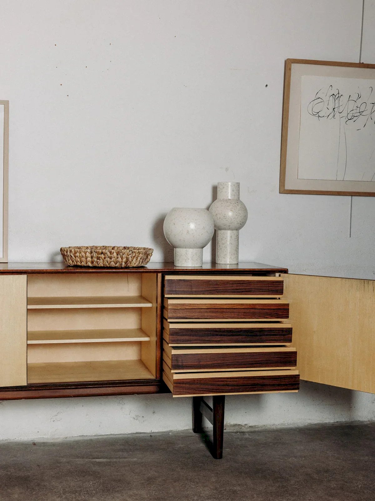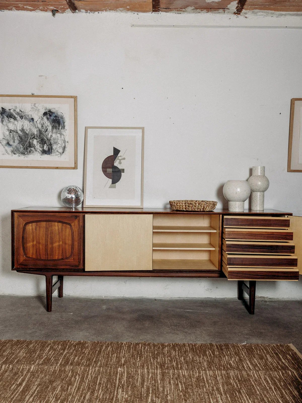 Alerte pièce rare ! Craquez pour cette enfilade scandinave en palissandre de Rio, signée Fredrik A. Kayser, datant des années 1960. Elle dispose de 5 tiroirs et 3 étagères (dont 2 en bois et une en verre modulable. Une pièce unique, parfaite pour sublimer un salon ou une salle à manger. Les petites poignées rondes, qui se verrouillent comme des clés, permettent de fermer complètement le meuble. Son sublime plateau, ses belles finitions sur les portes et son piétement haut et fin ajoutent à son élégance. Exclusivité web, la rencontre se fera chez vous ! Longueur : 221 cm Largeur : 44 cm Hauteur : 82,5 cm Hauteur tiroir : 7,5 cm Hauteur de la niche : 13,5 cm Hauteur sous le meuble : 29,5 cm Petite histoire de l’enfilade C’est dans les années 1950 que les premières enfilades scandinaves font leur apparition. L'enfilade de style scandinave fait partie du mobilier innovant d'après-guerre. Ses lignes aériennes et ses volumes rectilignes reprennent le style sobre d'inspiration moderniste, avec toutes les caractéristiques des designers norvégiens, suédois, finlandais… L’enfilade scandinave est réalisée en ébénisterie traditionnelle, généralement en bois de teck. Elle est utilisée comme remplacement du traditionnel buffet de salle à manger et fait maintenant office de console. Pour un salon design et agréable à vivre, l'enfilade est le meuble parfait ! État:Occasion: Objet ayant été utilisé. Objet présentant quelques marques d'usure superficielle, ...Occasion: Objet ayant été utilisé. Objet présentant quelques marques d'usure superficielle, entièrement opérationnel et fonctionnant correctement. Il peut s'agir d'un modèle de démonstration ou d'un objet retourné en magasin après une courte période d'utilisation. les éventuelles imperfections. Marque:Debongout Type:Produit chiné Matériau:Bois, Palissandre Style:Contemporain Personnalisé:Enfilades