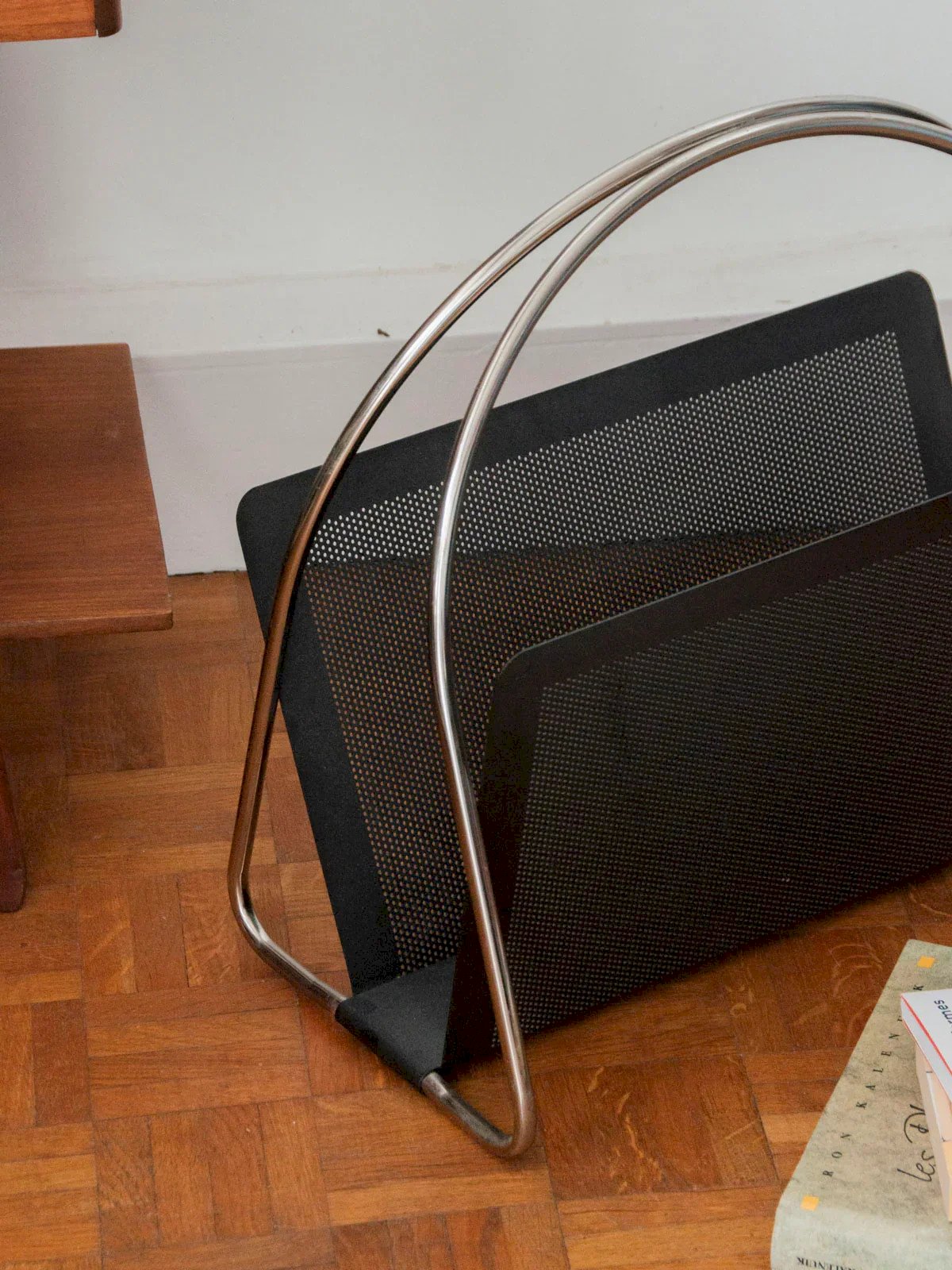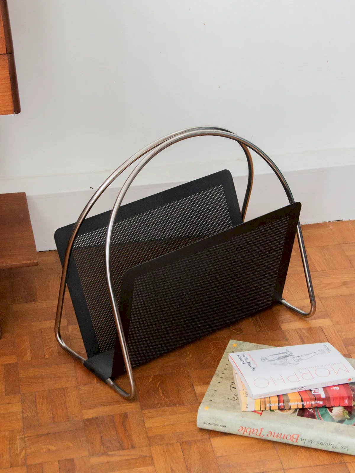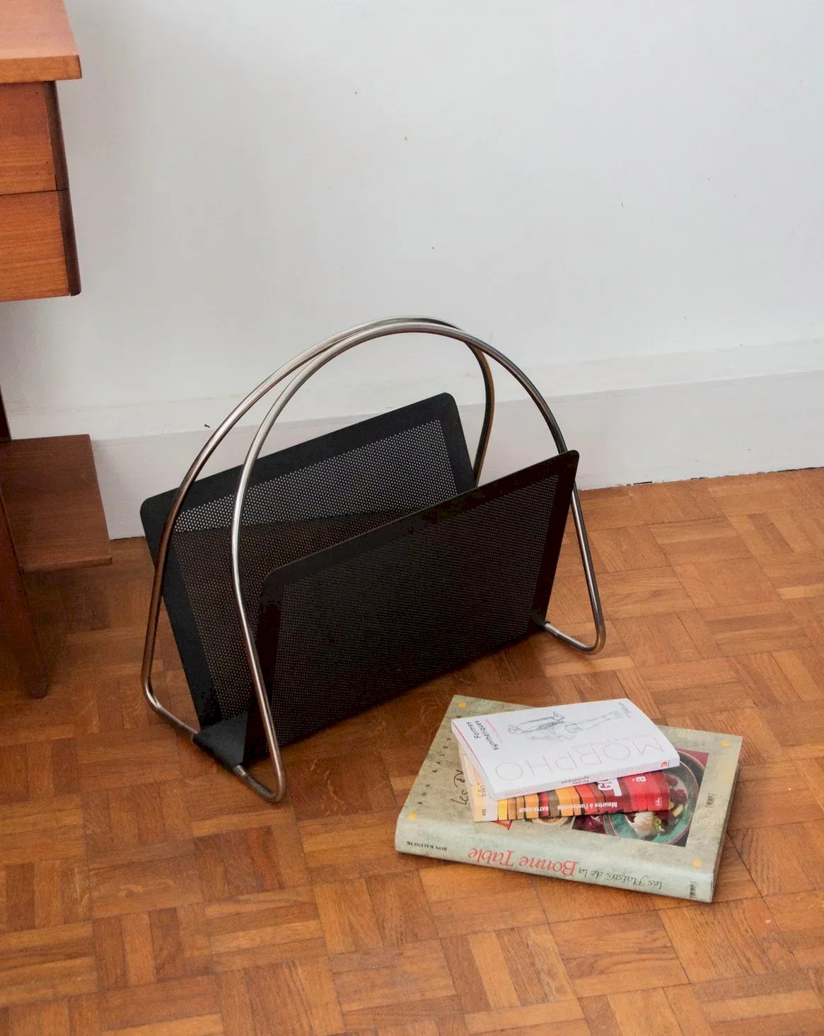 Adoptez ce porte‑revues italien Mascagni des années 1970 en métal gris perforé et chrome, au design aérien et légèrement futuriste. Ses lignes pures et arrondies structurent un rangement compact qui accueille revues et journaux avec élégance, idéal à côté d'un canapé ou dans une entrée contemporaine. La perforation allège visuellement le volume tandis que la finition chrome apporte une note lumineuse, créant une présence discrète et intemporelle dans tout intérieur. Longueur : 42 cm Largeur : 25 cm Hauteur : 40 cm Petite histoire du porte-revues Le terme "porte-revues" apparaît au début du XXe siècle, lorsque journaux et magazines deviennent courants dans les foyers. Ce meuble, souvent en bois ou en métal, est conçu pour organiser et exposer les publications imprimées. D'abord présent dans les salons et salles d'attente, il incarne l'ordre et l'accès à la culture. Aujourd'hui, le porte-revues s'adapte à tous les styles d'intérieur, offrant une touche décorative bien pratique. État:Occasion: Objet ayant été utilisé. Objet présentant quelques marques d'usure superficielle, ...Occasion: Objet ayant été utilisé. Objet présentant quelques marques d'usure superficielle, entièrement opérationnel et fonctionnant correctement. Il peut s'agir d'un modèle de démonstration ou d'un objet retourné en magasin après une courte période d'utilisation. les éventuelles imperfections. Marque:Debongout Type:Produit chiné Matériau:Métal, Chrome Style:Contemporain