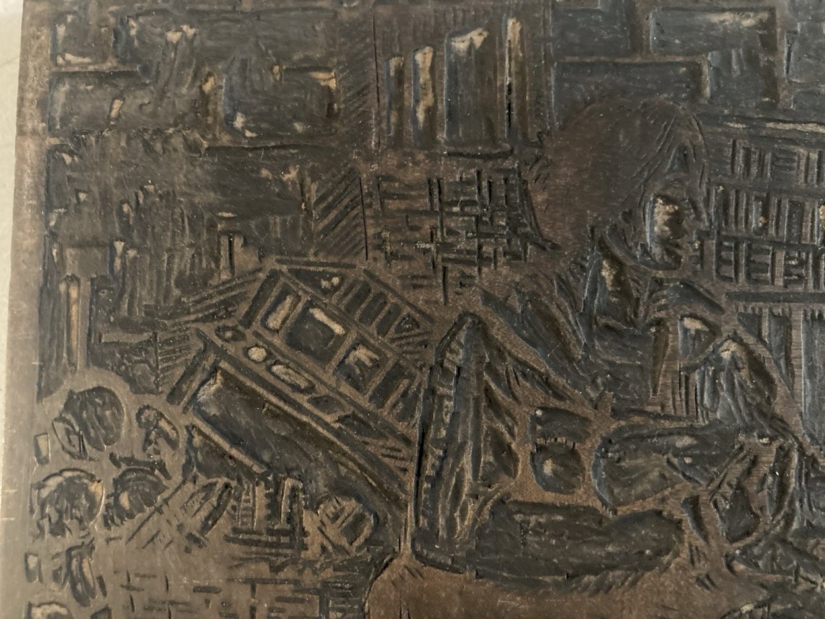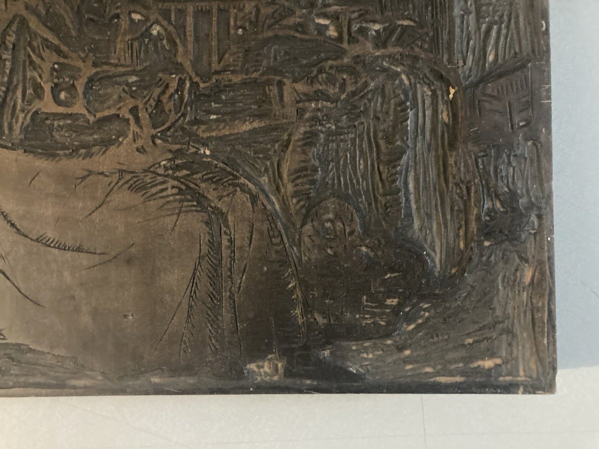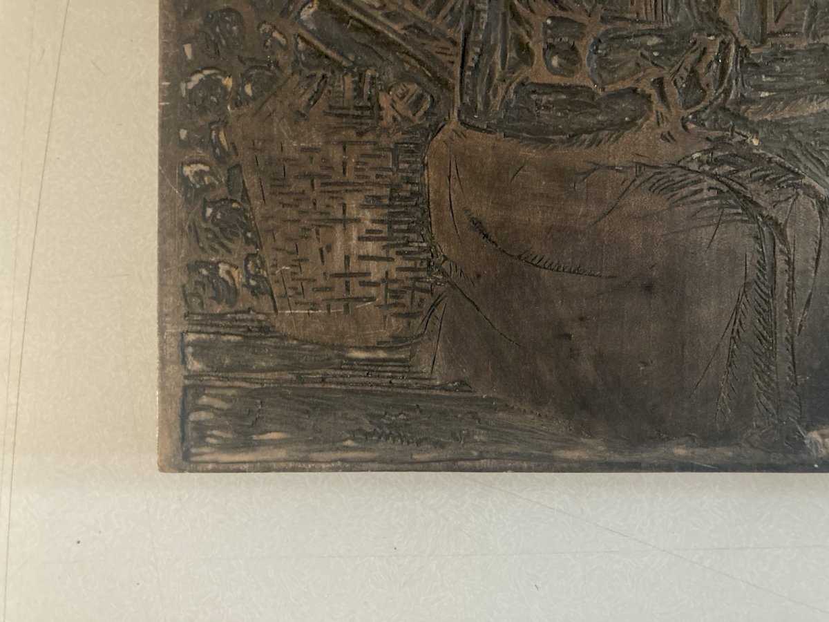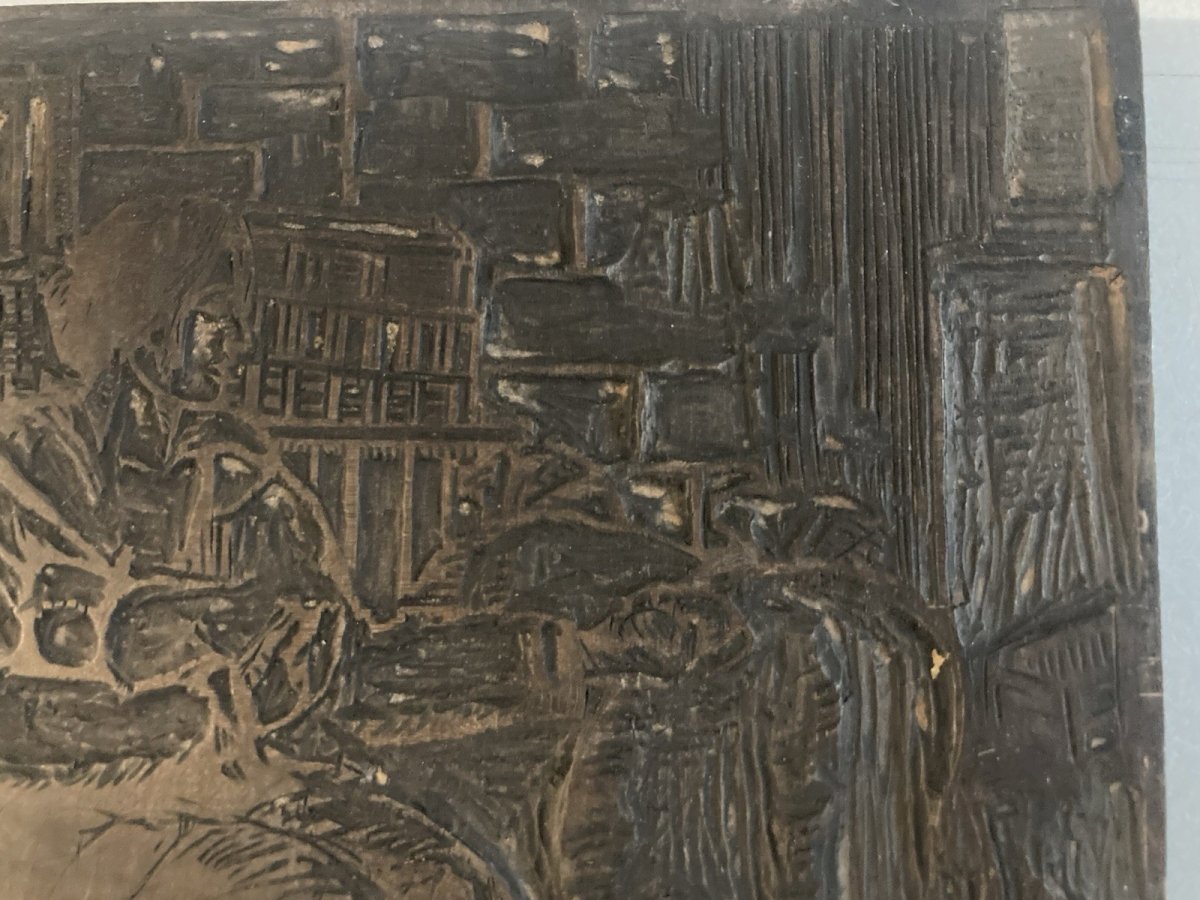 Matrice Tampon Gravure Sur Bois Curiosité Femme Panier Marché Ancien 1900 Plaque