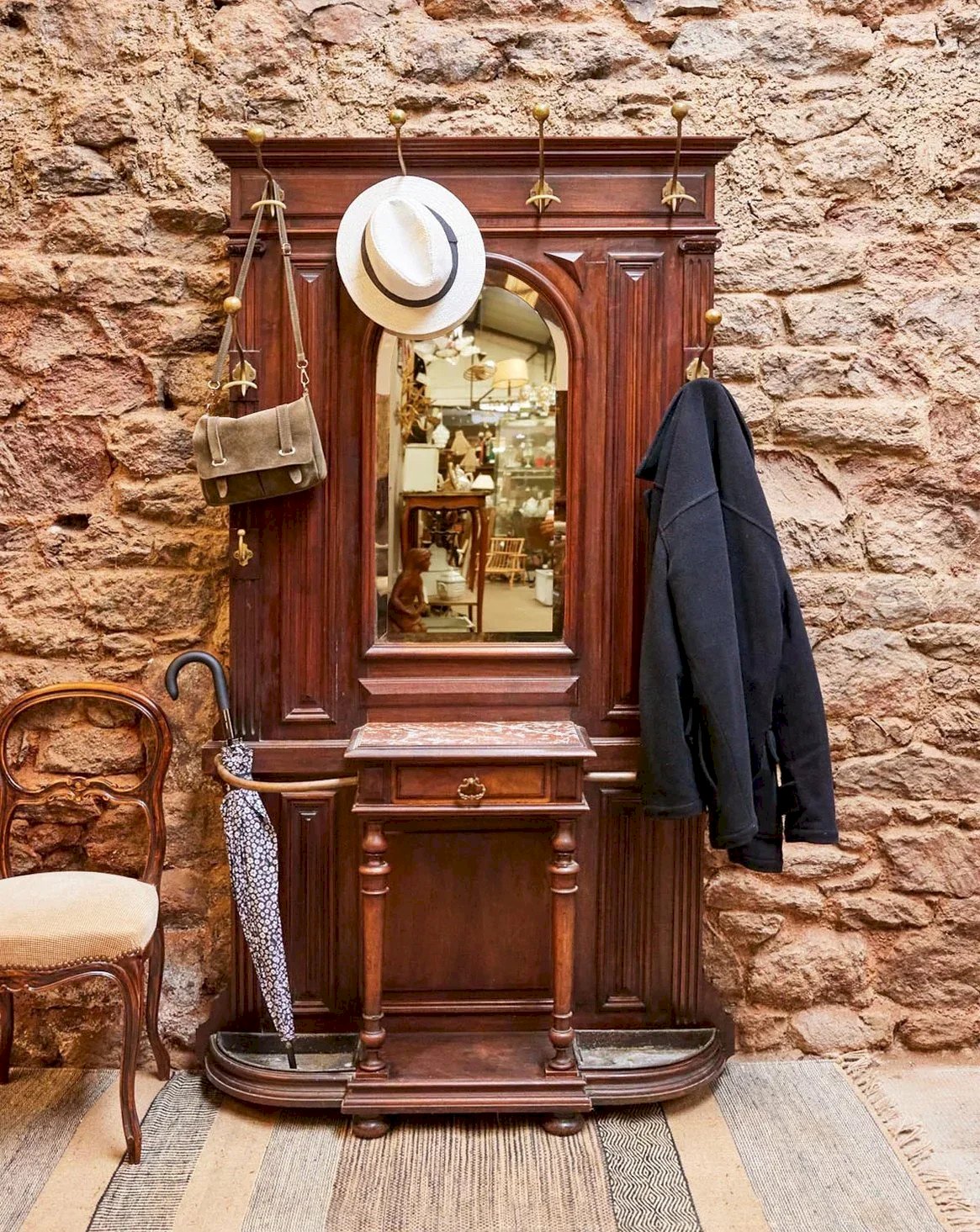 Découvrez ce vestiaire d'entrée en bois aux lignes élégantes, rehaussé de plateaux en marbre rose qui apportent une note raffinée et chaleureuse. Équipé d'un miroir, de deux porte-parapluies/cannes, de huit accroches et d'un tiroir de rangement, il organise manteaux, sacs et accessoires avec une belle capacité sans envahir l'espace. Son équilibre entre matériaux naturels et finitions soignées s'adapte tant aux intérieurs contemporains que classiques. Il installe une atmosphère accueillante dès le seuil de la maison. Longueur : 95 cm Largeur : 25 cm Hauteur : 195 cm Petite histoire du porte-manteau Le terme "porte-manteaux" apparaît au XVIIIe siècle, bien que le concept remonte à l'Antiquité. Initialement de simples crochets fixés aux murs, il évolue en un support élégant et fonctionnel, souvent sur pied. D'abord présent dans les halls des maisons bourgeoises, il accueille manteaux et chapeaux, devenant rapidement un élément incontournable de l'aménagement intérieur. Aujourd'hui, le porte-manteaux s'adapte à tous les styles, alliant praticité et esthétique. État:Occasion: Objet ayant été utilisé. Objet présentant quelques marques d'usure superficielle, ...Occasion: Objet ayant été utilisé. Objet présentant quelques marques d'usure superficielle, entièrement opérationnel et fonctionnant correctement. Il peut s'agir d'un modèle de démonstration ou d'un objet retourné en magasin après une courte période d'utilisation. les éventuelles imperfections. Marque:Debongout Type:Produit chiné Matériau:Bois, Marbre Style:Campagne