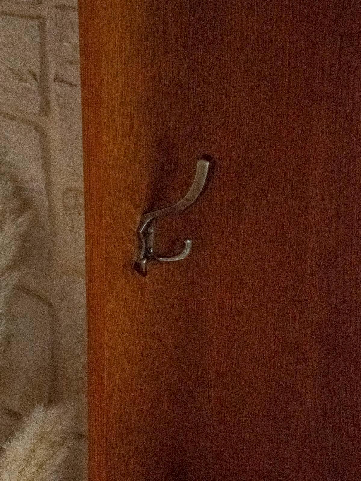 Invitez une allure chaleureuse dans votre entrée avec ce porte-manteau en bois clair, rehaussé de quatre patères en laiton et d’un grand miroir qui amplifie la luminosité; son tiroir discret, son petit placard et le compartiment à parapluies offrent un rangement structuré pensé pour les proportions d’un espace d’accueil, tandis que l’association des matières crée un style sobre et élégant, parfait pour une ambiance organisée et accueillante. Une trace dans le fond du tiroir et légères traces du temps. Longueur : 87 cm Largeur : 32,5 cm Hauteur : 185 cm Hauteur tiroir : 9,5 cm Petite histoire du porte-manteaux Le terme "porte-manteaux" apparaît au XVIIIe siècle, bien que le concept remonte à l'Antiquité. Initialement de simples crochets fixés aux murs, il évolue en un support élégant et fonctionnel, souvent sur pied. D'abord présent dans les halls des maisons bourgeoises, il accueille manteaux et chapeaux, devenant rapidement un élément incontournable de l'aménagement intérieur. Aujourd'hui, le porte-manteaux s'adapte à tous les styles, alliant praticité et esthétique. État:Occasion: Objet ayant été utilisé. Objet présentant quelques marques d'usure superficielle, ...Occasion: Objet ayant été utilisé. Objet présentant quelques marques d'usure superficielle, entièrement opérationnel et fonctionnant correctement. Il peut s'agir d'un modèle de démonstration ou d'un objet retourné en magasin après une courte période d'utilisation. les éventuelles imperfections. Marque:Debongout Type:Produit chiné Matériau:Bois, Verre, Laiton, Acier Style:Campagne