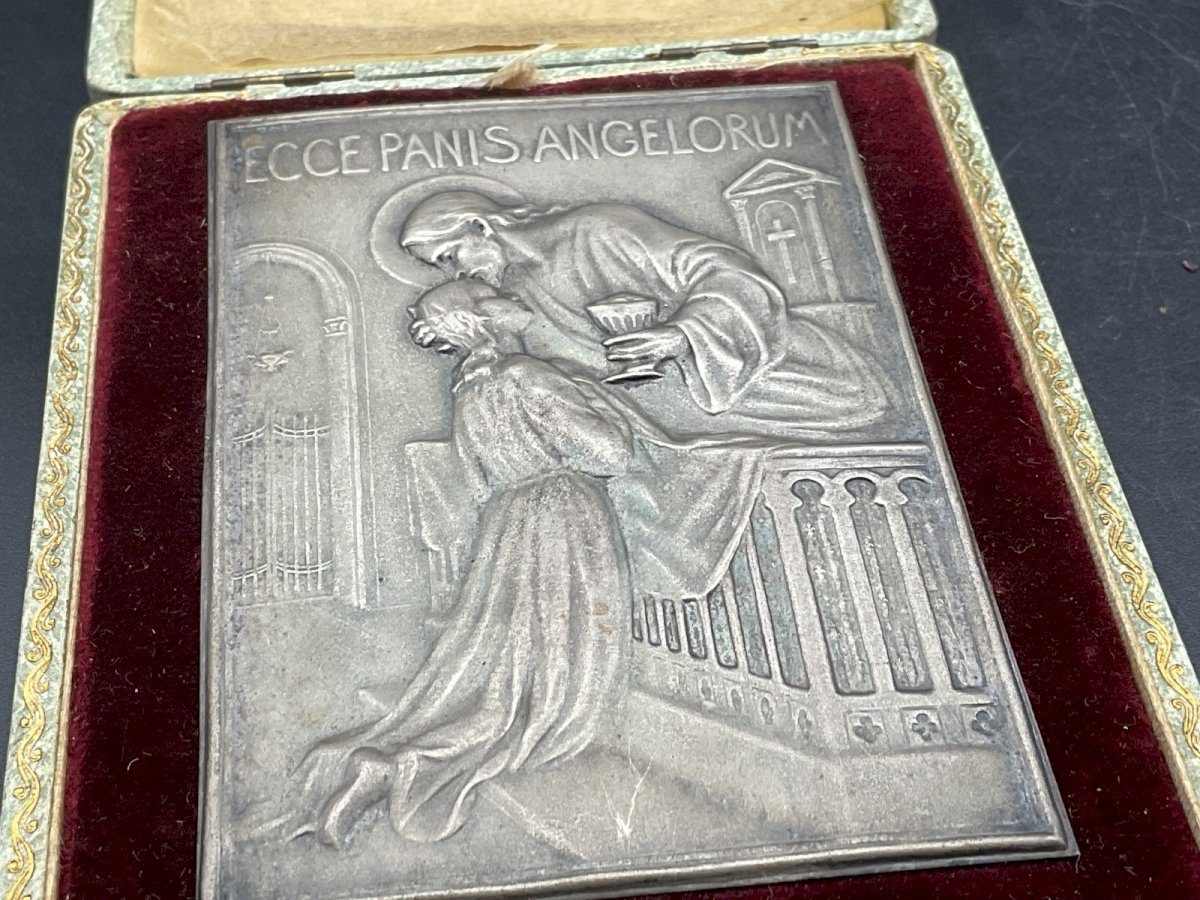 Médaille Bas relief religieux ECCE PANIS ANGELORUM Dimension : 9 x 6,5 cm Authenticité:Original Type:Objet de vitrine, Décoratif Origine:France Sous-type:Figurine, Statue Style:Antiquité Matière:Bronze