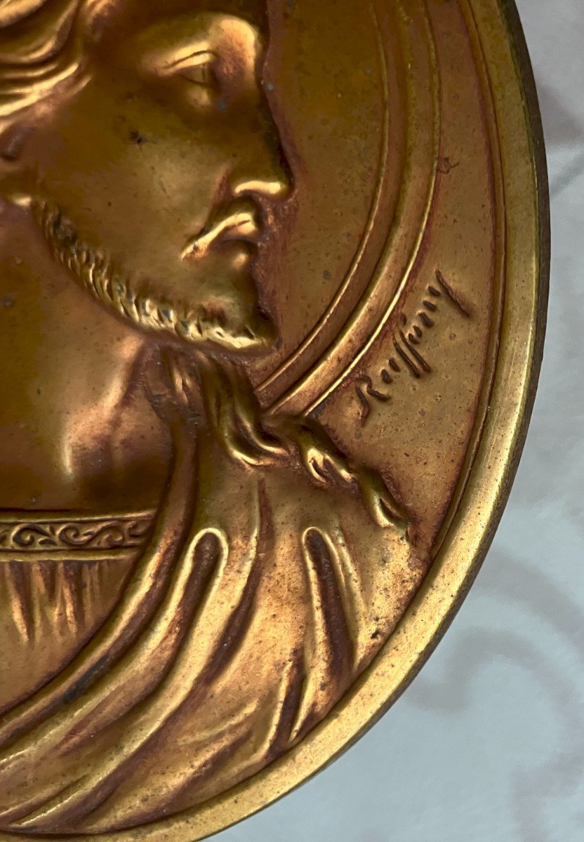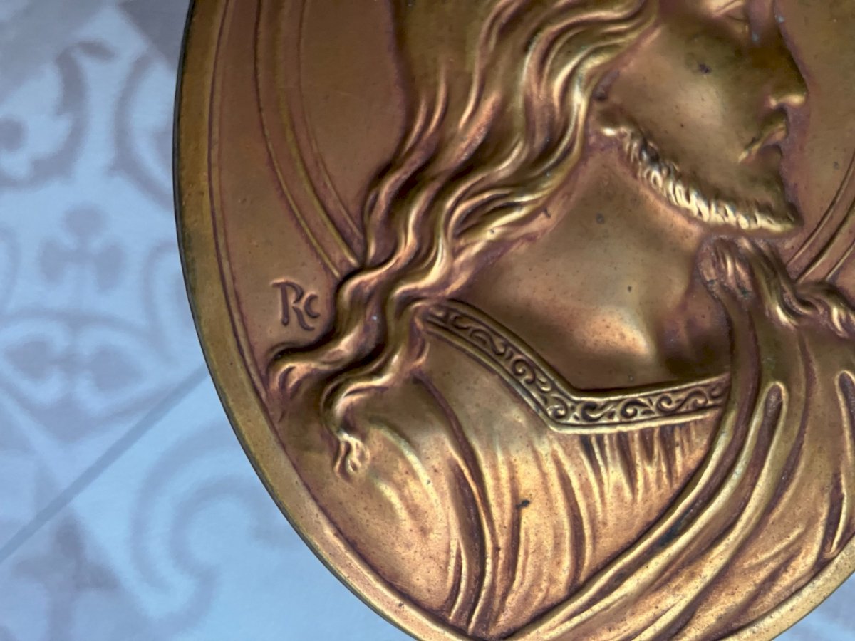 medaillon ancien en laiton repoussé Christ signé Oscar Ruffany 9,5x7,5 cm