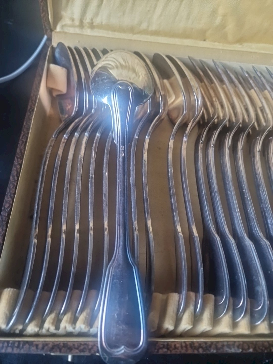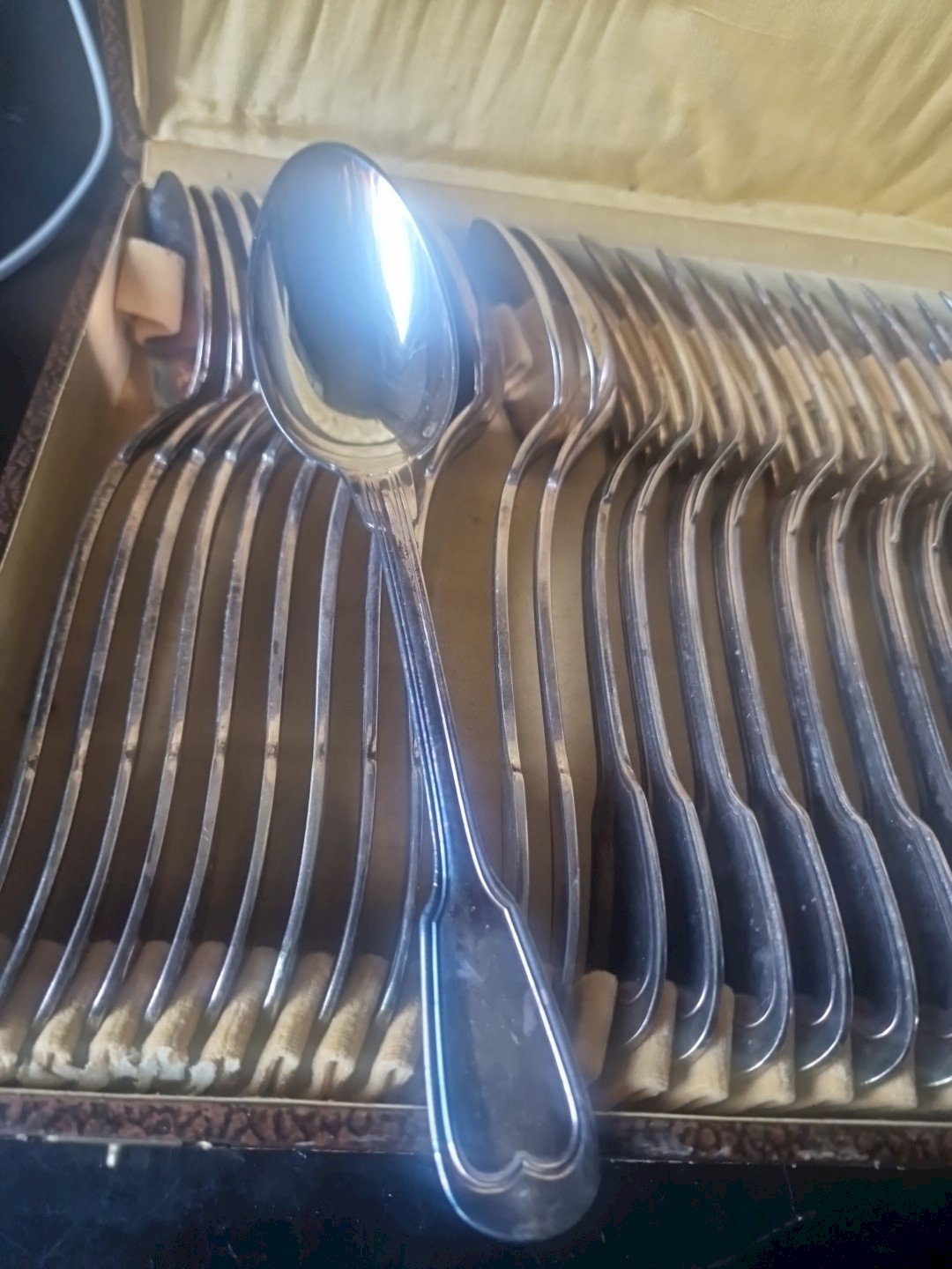 bon etat. Odeur de renfermé dans le coffret Authenticité:Original Type:Arts de la table, Cuisine Origine:France Sous-type:Cuillère Matière:metal blanc