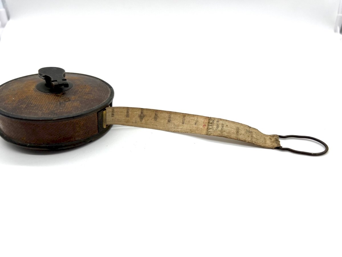 Mètre ruban tailleur XIXe – outil d’artisan – bobine bois ancienne
