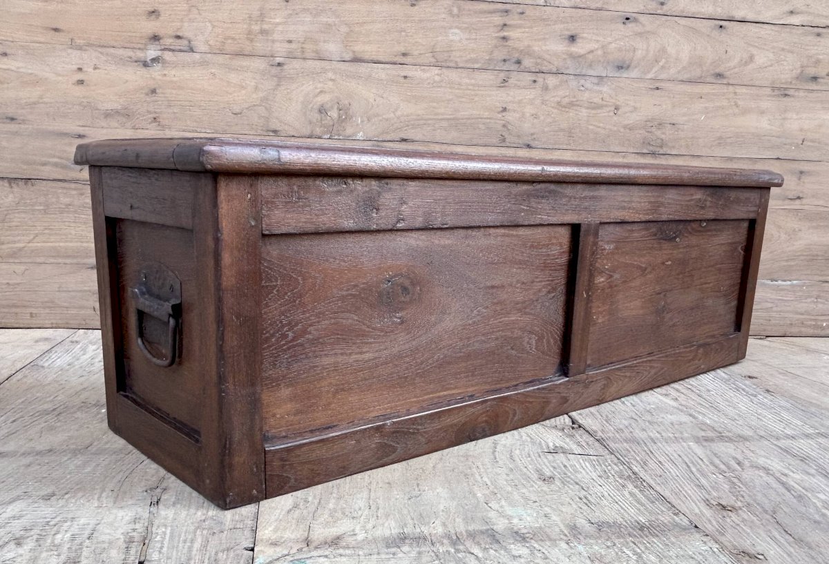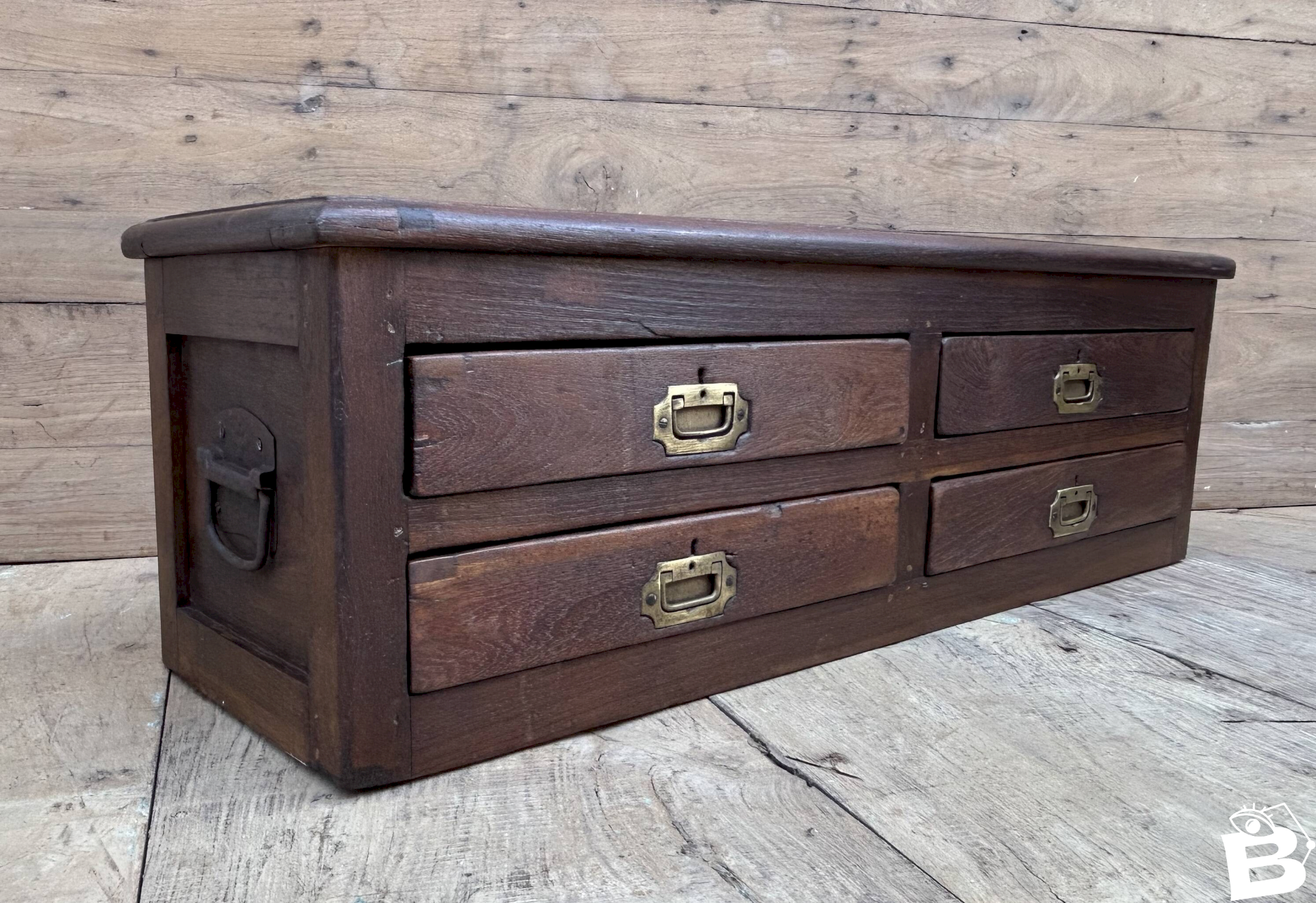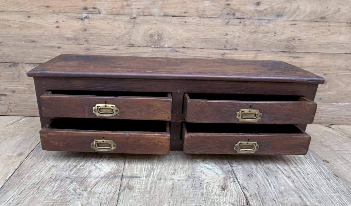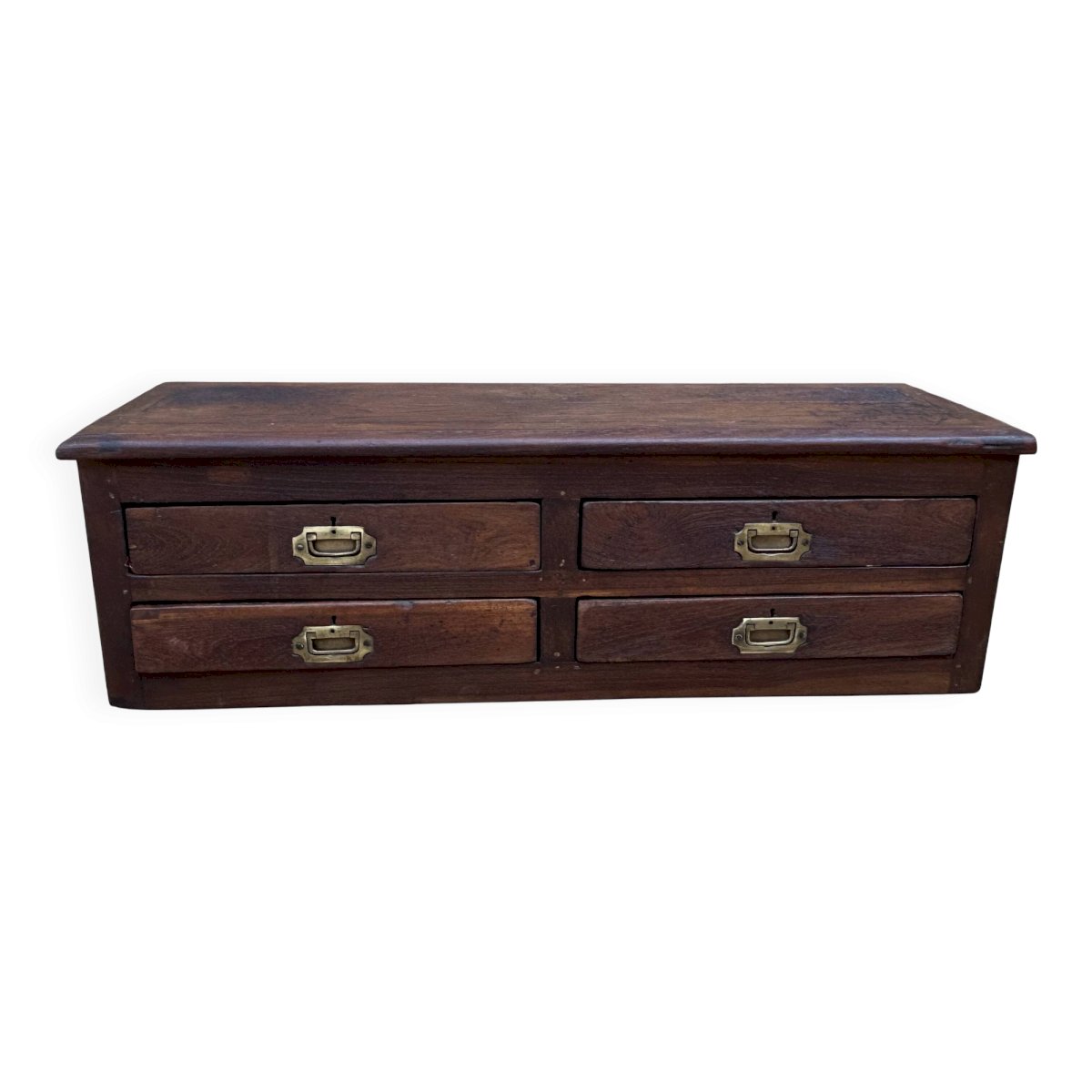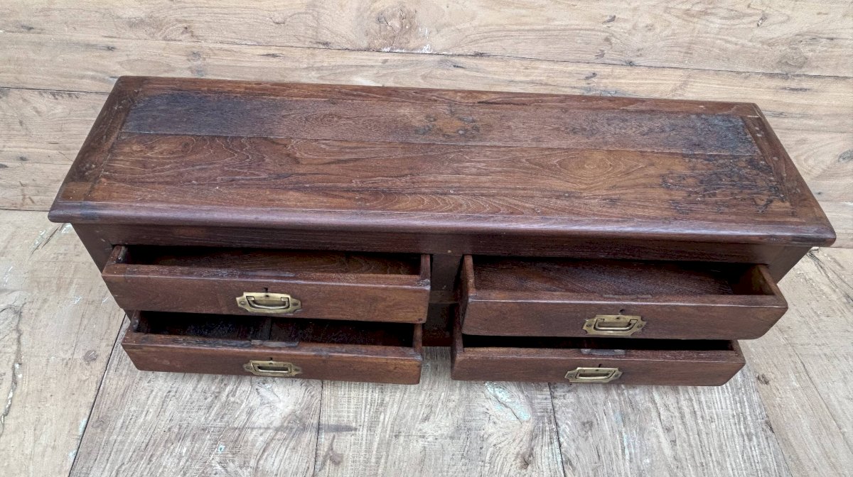 Meuble de métier en teck birman / 100 x 30 x 31 cm - poignées laiton d'origine / H tiroirs de H en B: 7-7-6-6 cm / prof 22 cm / 21 kg