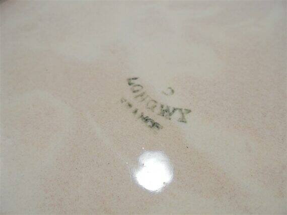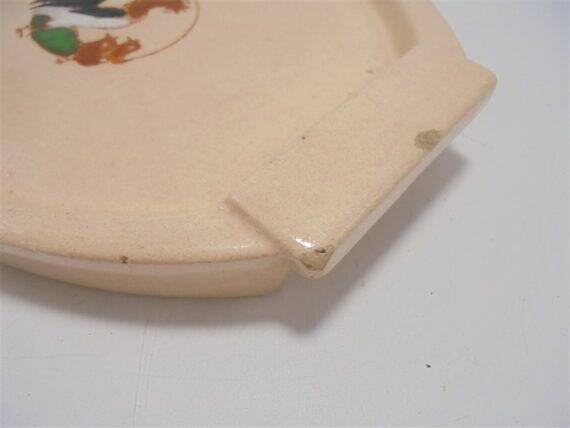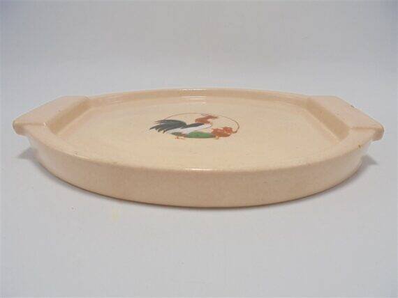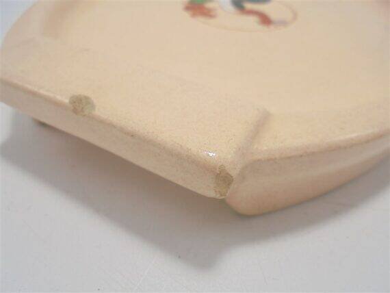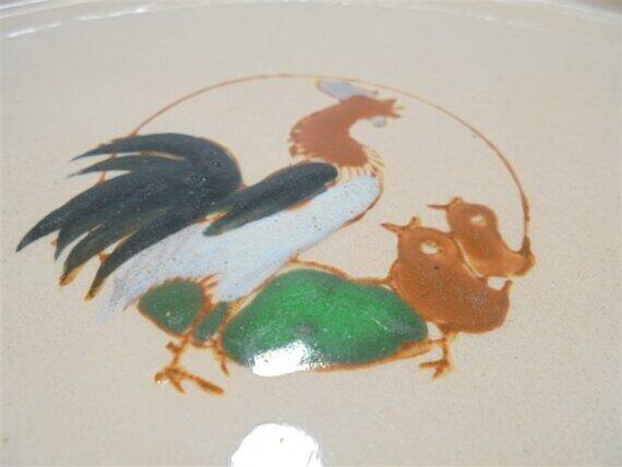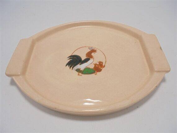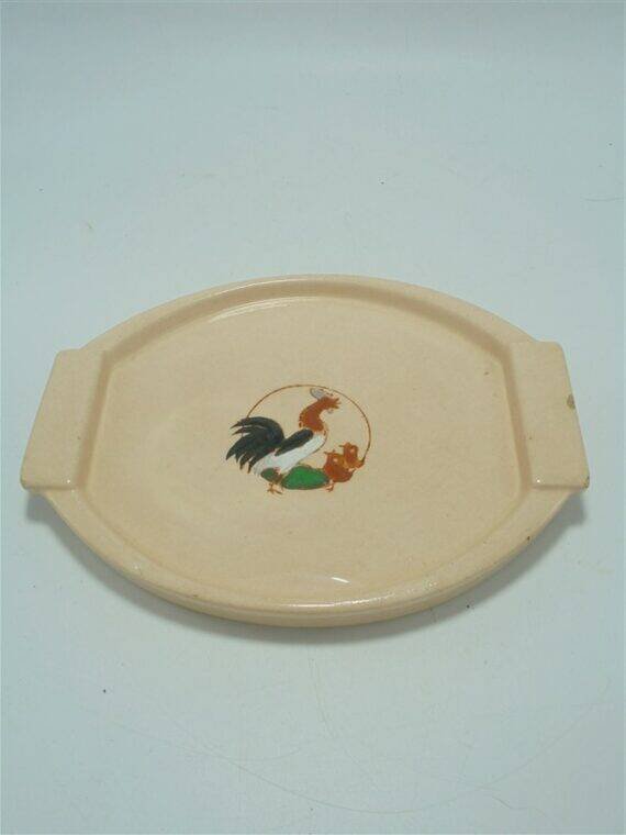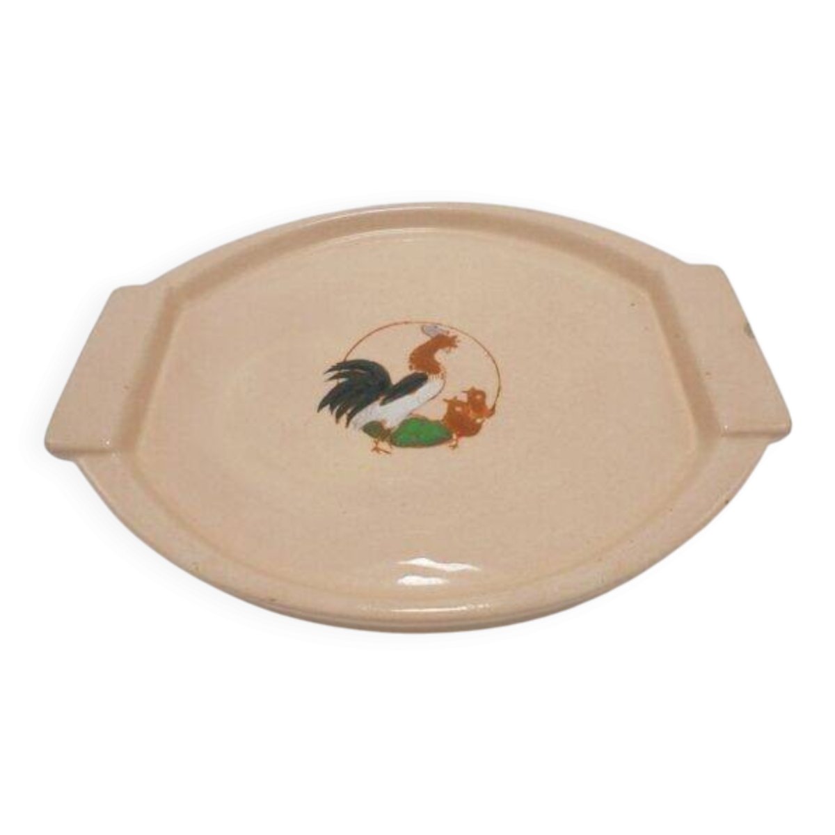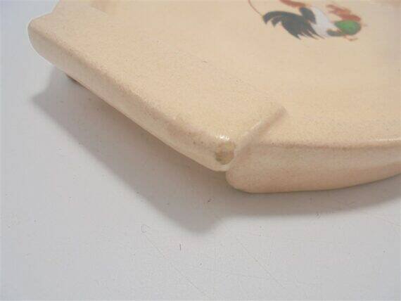 Mini plateau Longwy en céramique signée Longwy, au décor d'un coq et de 2 poussins sur fond rose pâle.Il présente de petits accidents visibles sur photo.Dimensions: environ 22 X 17 X 3 cm.Poids: 460 g.