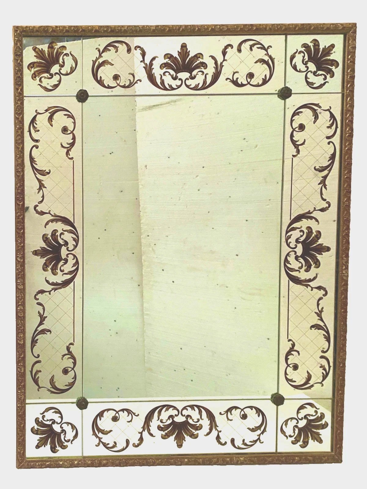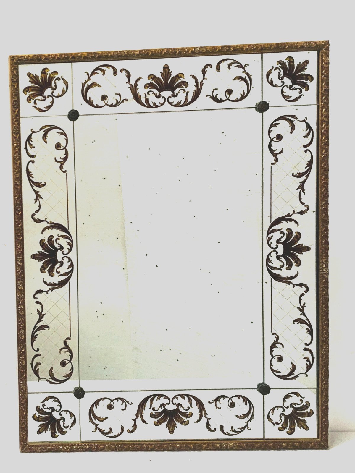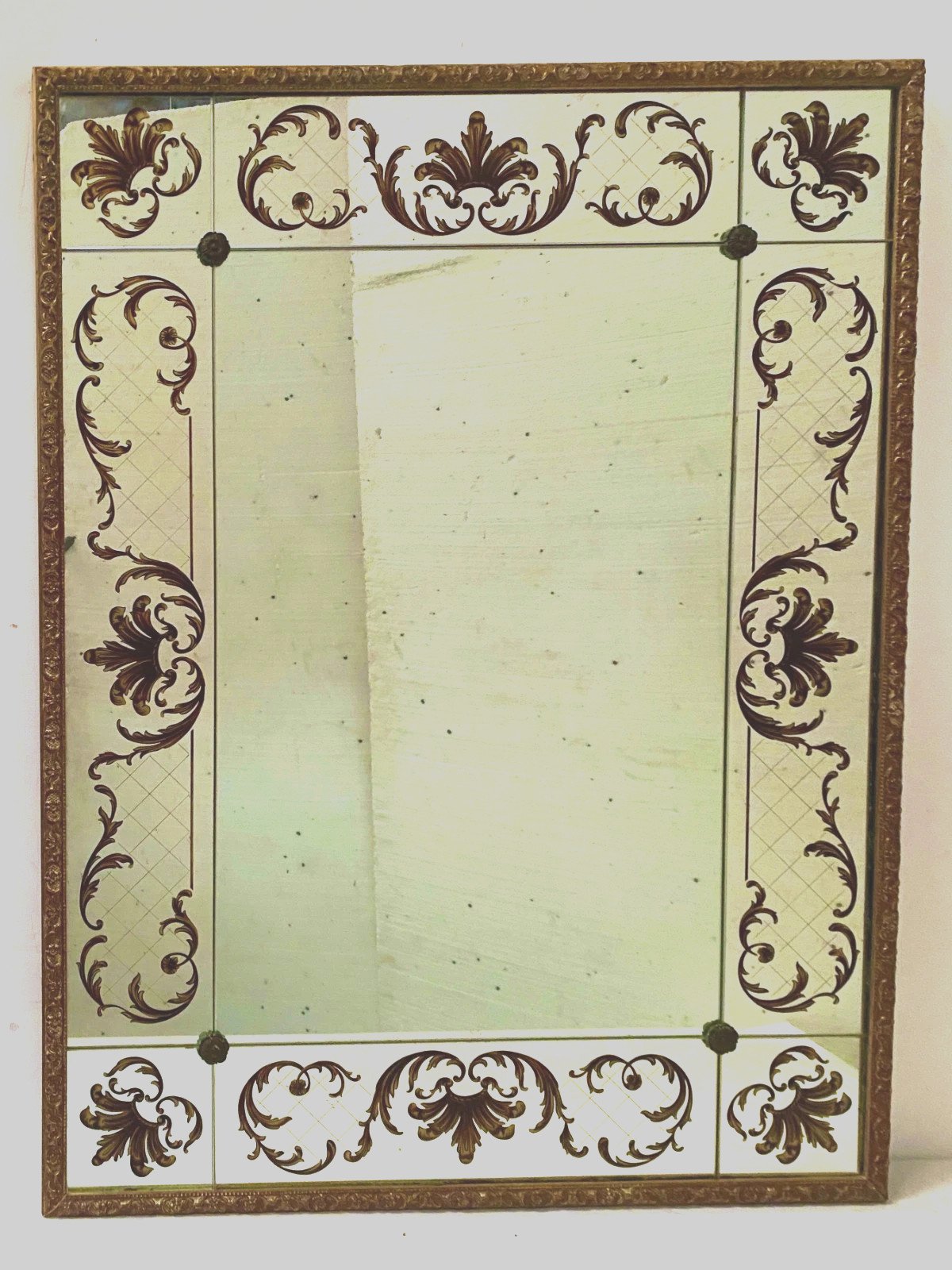 Miroir de style des années 1950 en verre églomisé Décor végétal a rehaut d'or  Bon état  Dimension  H 120 x L 90 x 4 cm  Epoque XX siècle   Pour une livraison a l’international, me contacter merci   Nous essayons d’être le plus précis possible dans notre description N ' hésitez pas a nous poser toutes vos question avant de finaliser votre achat soit par mail ou au tel PETIT RAPPEL Le meilleur allié de la vente par correspondance reste le dialogue, c'est pour cela que je vous communique mon numéro de portable pour toutes questions pendant une vente mais aussi pour toutes interrogations pendant vos achats. Je répondrais volontiers à toutes vos questions, n'hésitez pas les photos tiennent lieu de descriptif Pour tout retour, les frais d'expédition et de retour resterons a la charge de l'acheteur Type:Mural Pays d'origine:France Hauteur:120 Longueur:90 Largeur:4 Forme:Rectangulaire