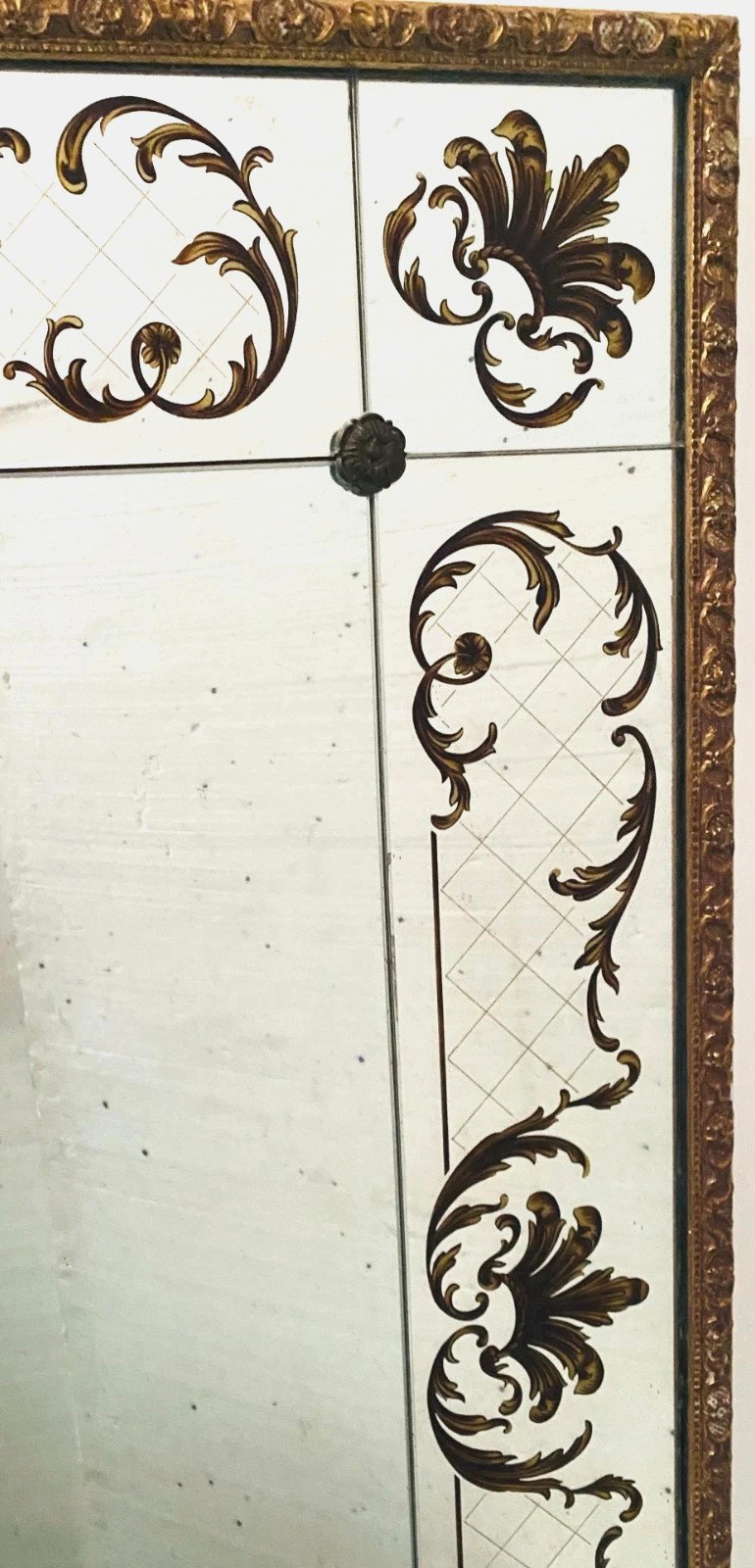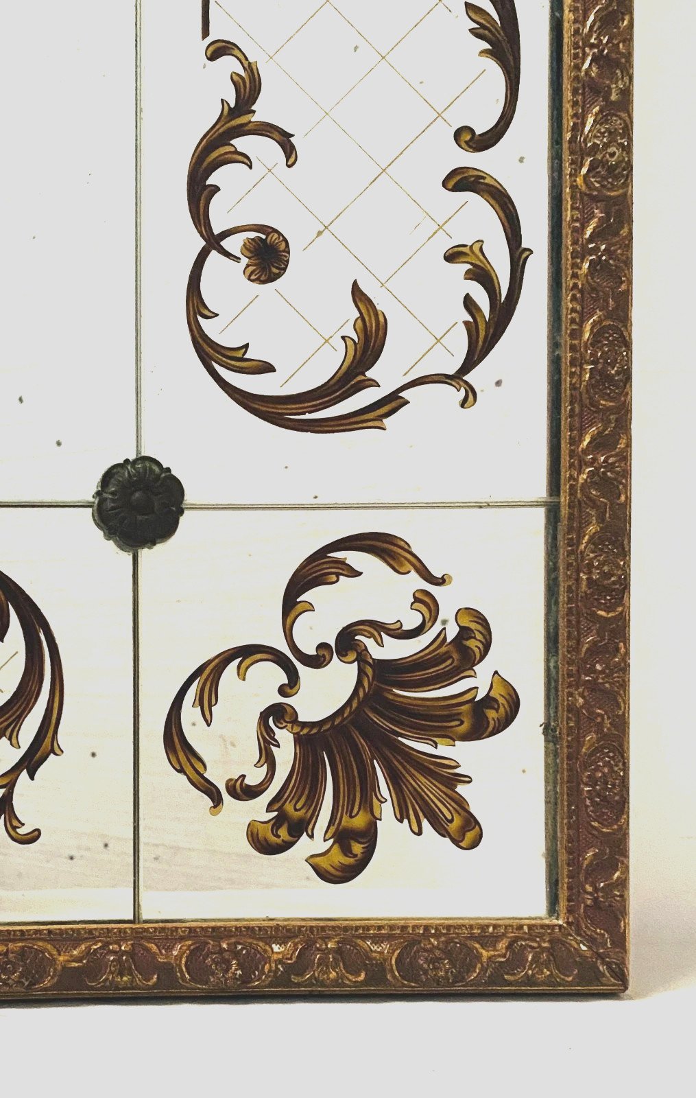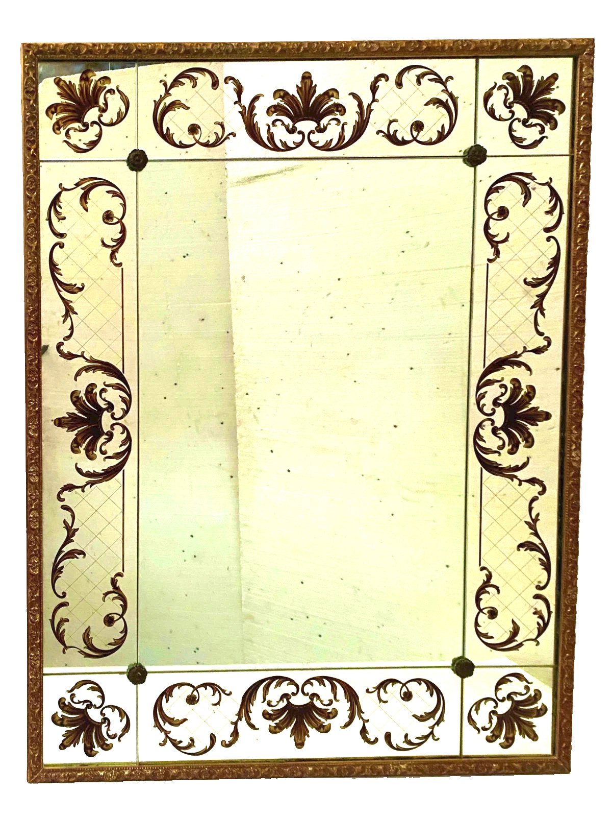Miroir de style des années 1950 en verre églomisé Décor végétal a rehaut d'or  Bon état  Dimension  H 120 x L 90 x 4 cm  Epoque XX siècle   Pour une livraison a l’international, me contacter merci   Nous essayons d’être le plus précis possible dans notre description N ' hésitez pas a nous poser toutes vos question avant de finaliser votre achat soit par mail ou au tel PETIT RAPPEL Le meilleur allié de la vente par correspondance reste le dialogue, c'est pour cela que je vous communique mon numéro de portable pour toutes questions pendant une vente mais aussi pour toutes interrogations pendant vos achats. Je répondrais volontiers à toutes vos questions, n'hésitez pas les photos tiennent lieu de descriptif Pour tout retour, les frais d'expédition et de retour resterons a la charge de l'acheteur Type:Mural Pays d'origine:France Hauteur:120 Longueur:90 Largeur:4 Forme:Rectangulaire