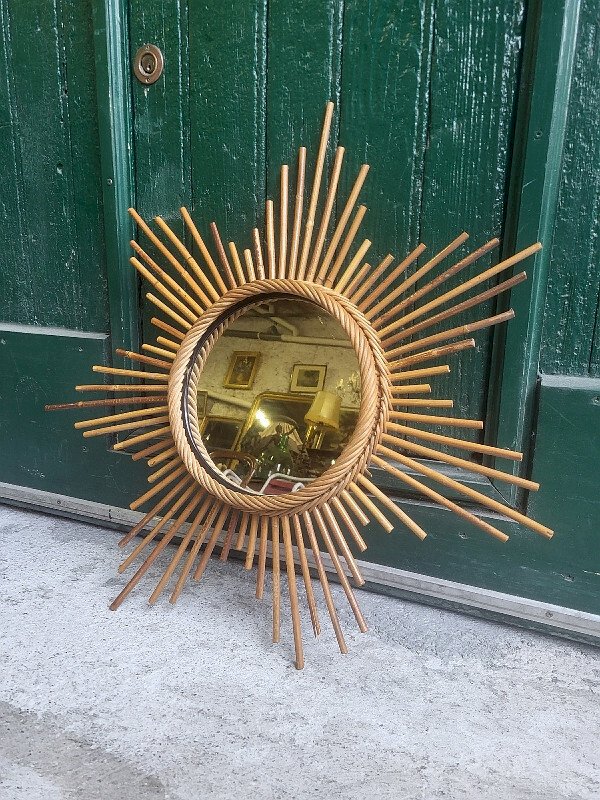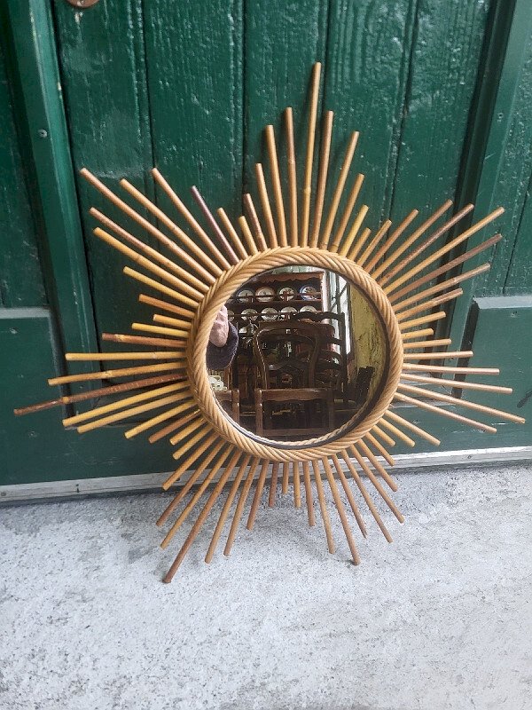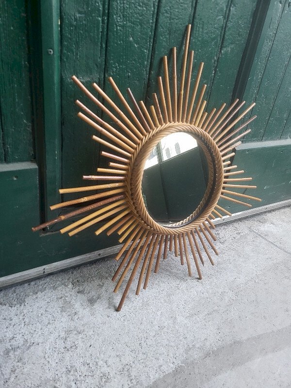 joli miroir de sorcière en bambou il est en très bon état il est des années 1960 1970 c'est un très beau modèle très décoratif il mesure 68 cm de diamètre hors tout sur 23 cm de diamètre pour le miroir et 3 cm d'épaisseur   Type:Mural Sous-type:MIROIR DE SORCIERE Forme:Rond