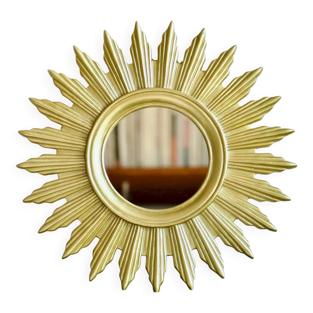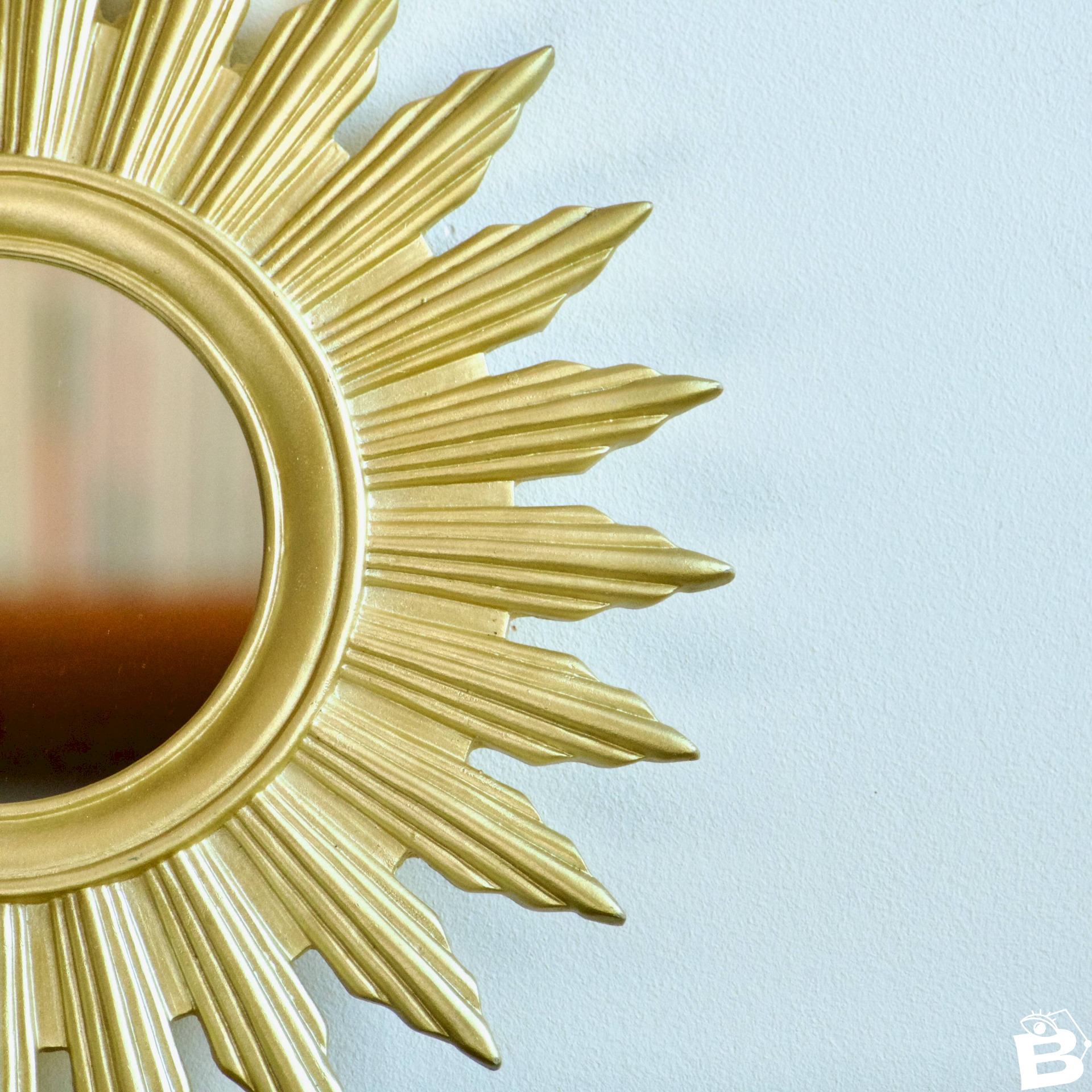 Très joli miroir soleil vintage, en alliage métallique et stuc de couleur dorée.Reliefs rayons de soleil, belle brillance, il apporte beaucoup d’élégance et de lumière.Attache prévue à l’arrière.Il est en très bel état, aucun manque.