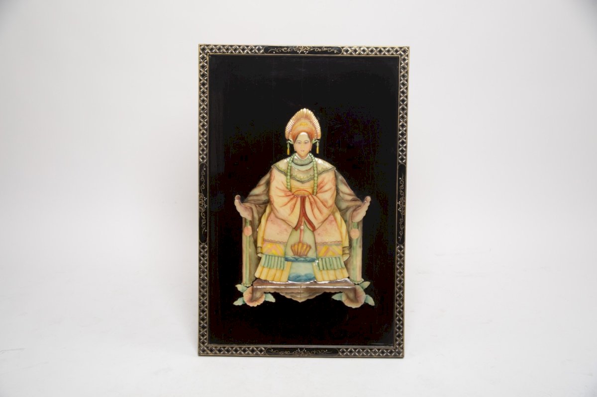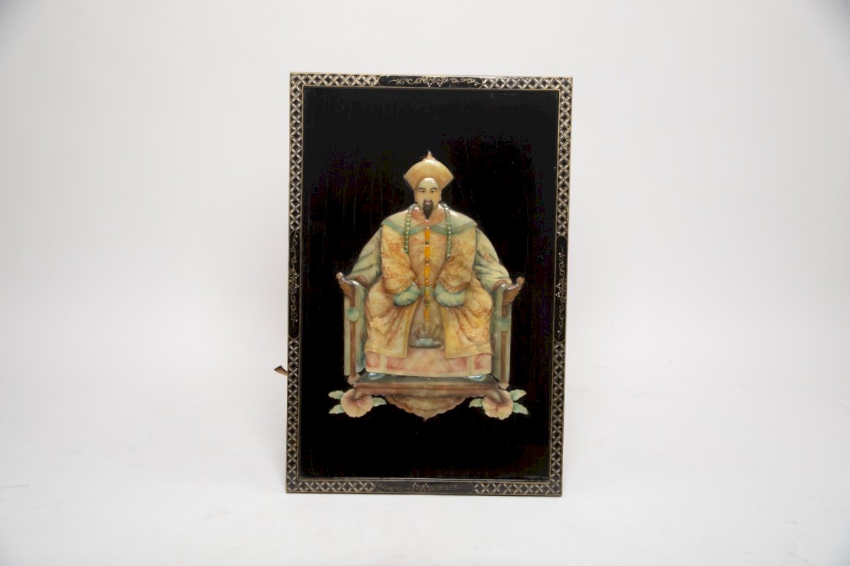 Monumental 1950s Chinese Jade Inlay Imperial Wall Panels – Set of 2 An impressive and highly decorative pair of large Chinese wall panels dating to the mid-20th century, circa 1950s. Each panel depicts an imperial couple inspired by Qing dynasty iconography. The figures are seated on traditional Ming-style chairs and are executed in high-relief carved jade and hardstone inlay, meticulously assembled piece by piece and delicately hand-finished. The contrast between the soft pastel stone tones and the deep black lacquered background creates a dramatic and elegant visual impact. The geometric gilt border enhances the architectural presence of the panels. These are not antique Qing dynasty pieces, but high-quality mid-century decorative artworks inspired by imperial Chinese imagery. Why They Stand Out • Monumental scale – over 36 inches tall each • True statement pieces • Hollywood Regency / Asian Chic aesthetic • Ideal for luxury interiors, hospitality projects or collectors of Asian-inspired décor • Can be displayed side by side for symmetry or facing each other for dramatic effect Dimensions (Each Panel) Height: 92 cm / 36 in Width: 61 cm / 24 in Depth: 2.5 cm / 1 in Weight: approx. 8 kg (17.6 lbs) each Materials Wood panel Carved jade and semi-precious stone inlay Hand-painted details Black lacquer background with gilt frame Condition Excellent vintage condition. No major damage. Minor age-appropriate wear consistent with mid-century production. Shipping Professional packing. International shipping available. Please contact for an accurate shipping quote depending on destination. Type:Wall Panel Pays d'origine:Chine Hauteur:92 Matière:Jade Thème:Personnage Largeur:61