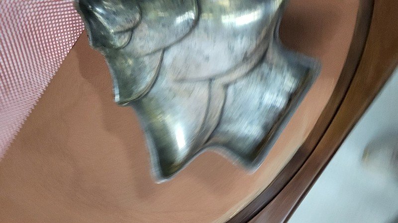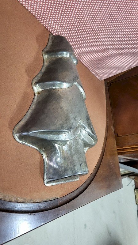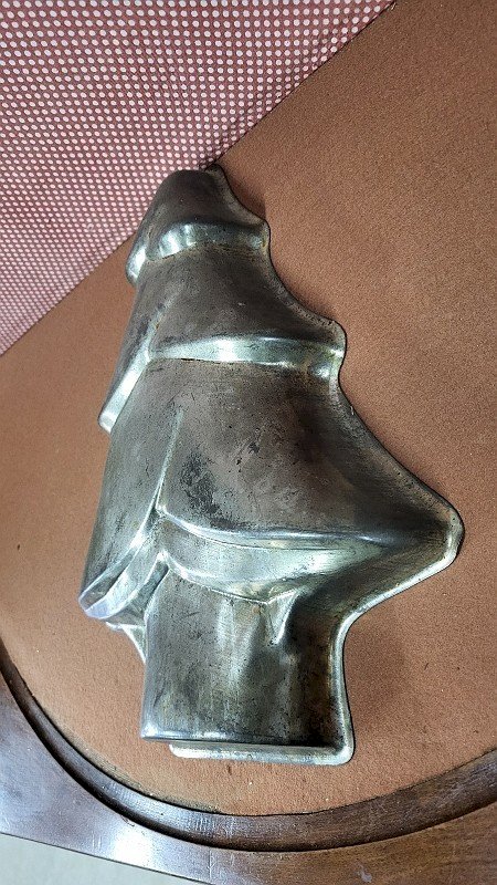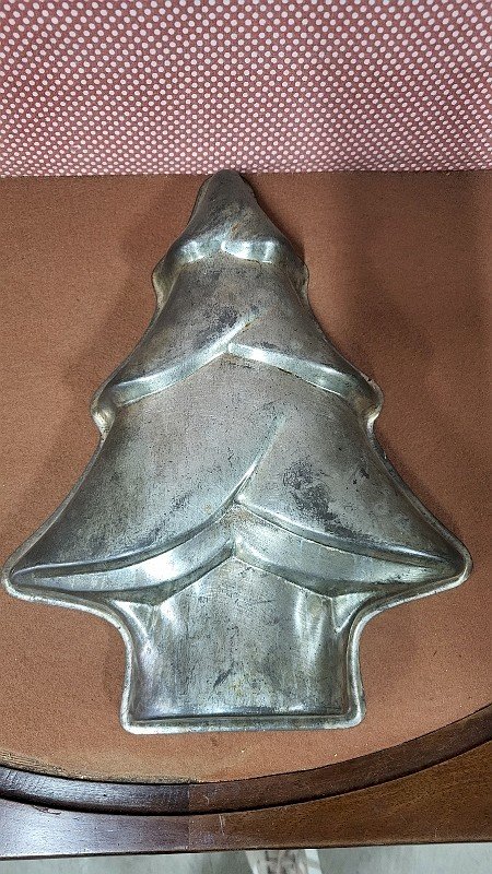 joli et ancien moule à gâteau en tôle Sapin il est en très bon état il mesure 26 cm de large sur 33.5 cm de haut et 5 cm d'épaisseur Type:MOULE