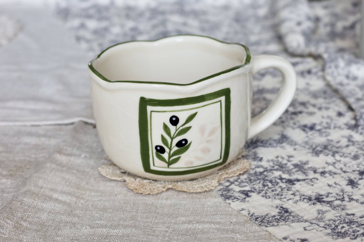 Charmant mug en porcelaine de belle contenance, décoré d’un motif d’olives aux accents méditerranéens.
