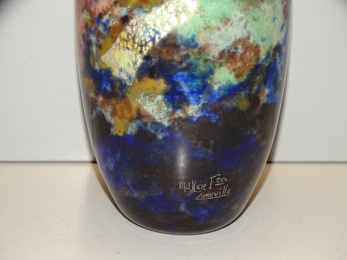 joli vase  en verre doublé bigarré avec inclusions argentées et dorées signé muller fres lunéville,  Présence de micros rayures de frottements ( nettoyage )  sur le corps et en dessous - ( voir photos ) - En bel état d'usage - Réf: 1V251219/28  - Hauteur 17,8 cm -  Diamètre col 8,6 cm - Diamètre max 11,5 cm -  Poids 0,927 kg -   Pour toutes questions :  EXPEDITION POSSIBLE EN MONDIAL RELAY ou COLISSIMO sur demande TRES BON EMBALLAGE GARANTI       MERCI de BIEN REGARDER TOUTES les PHOTOS car ELLES FONT PARTIE INTEGRANTE de la DESCRIPTION et PERMETTENT de VOIR l'OBJET AU MIEUX  avec SES PETITS DEFAUTS EVENTUELS - Marque:MULLER Fres LUNEVILLE Pays d'origine:France