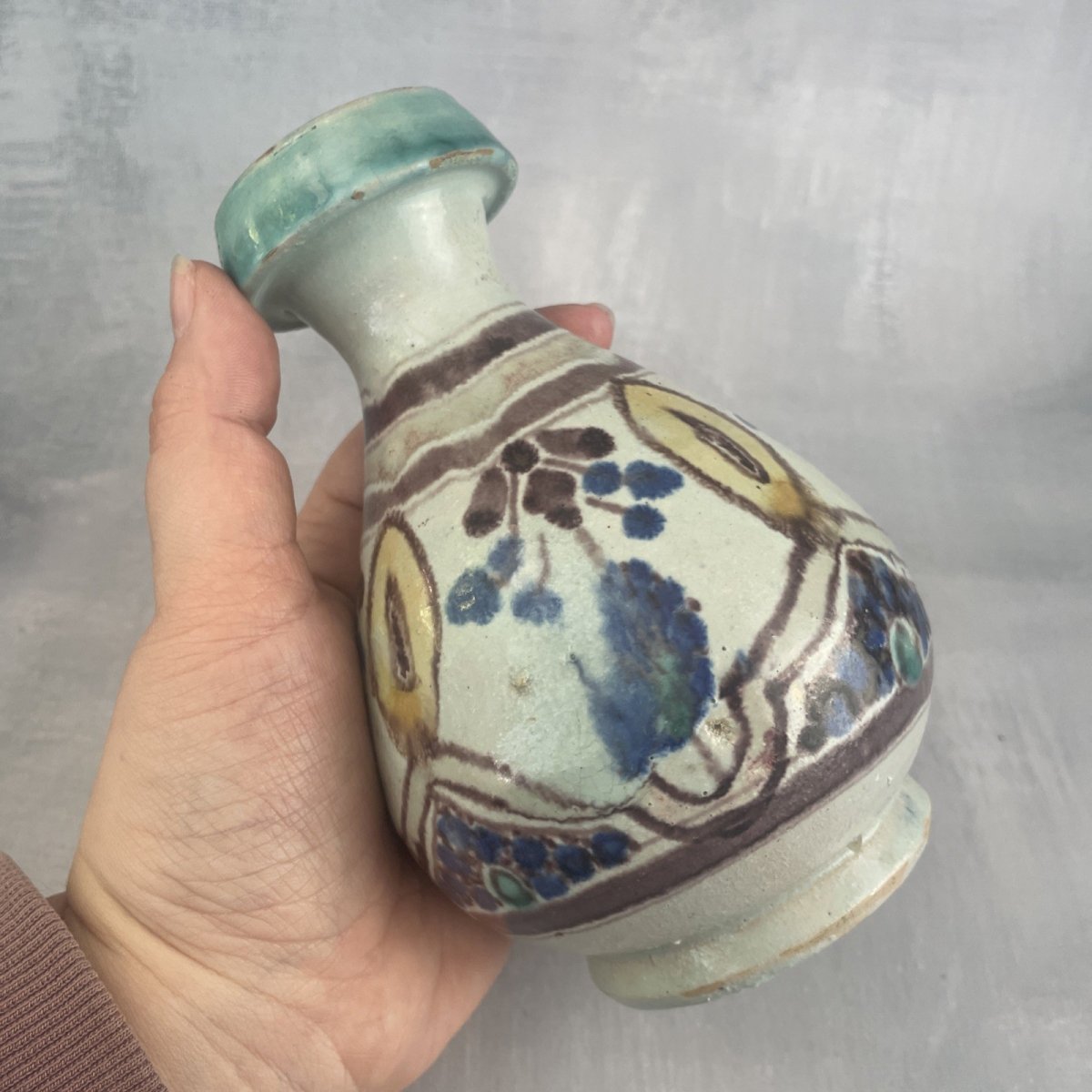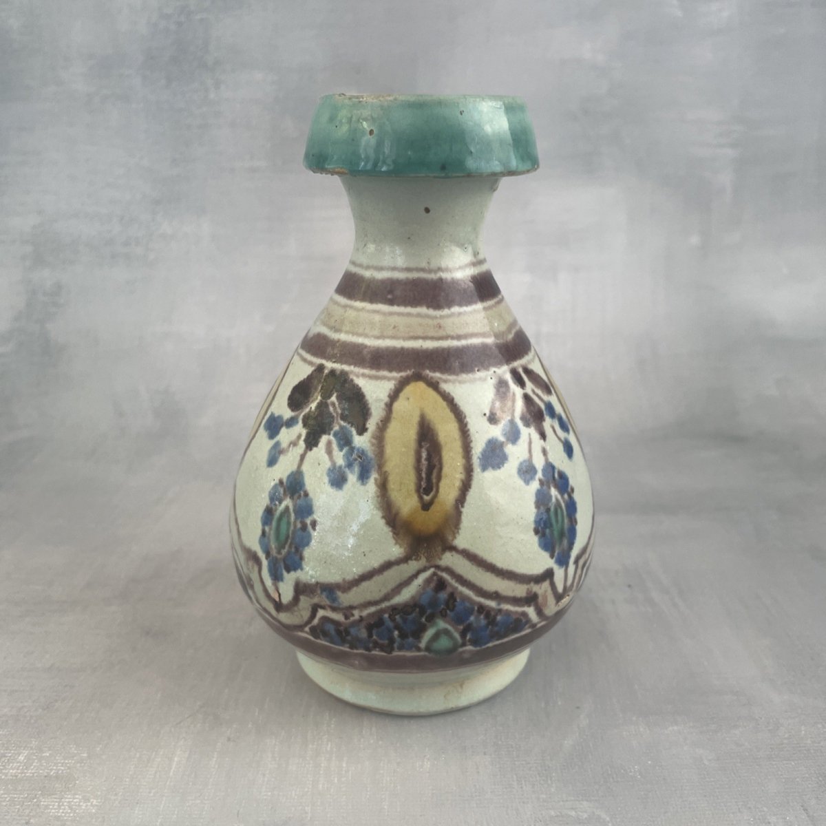 NABEUL TUNISIE vase céramique émaillé polychrome signature à identifier ~15cm NABEUL TUNISIA polychrome enamelled ceramic vase signature to identify Hauteur ~ 15 cm Dimensions base ~ 6.5 cm Poids total ~ 0.3 kg Plusieurs égrenures et éclats principalement au col et à la base, voir photos Pensez à grouper vos achats pour réduire les frais de port !