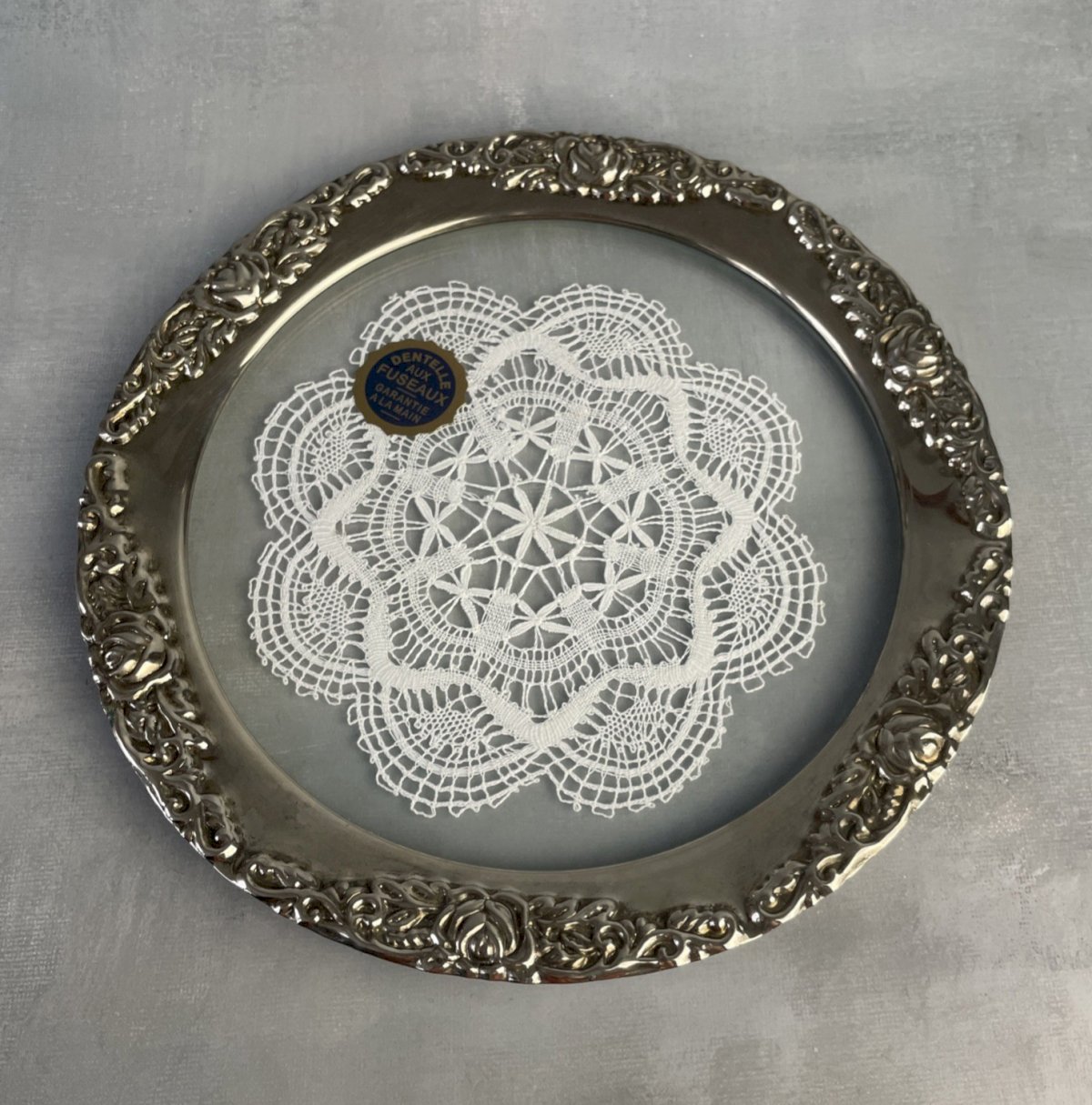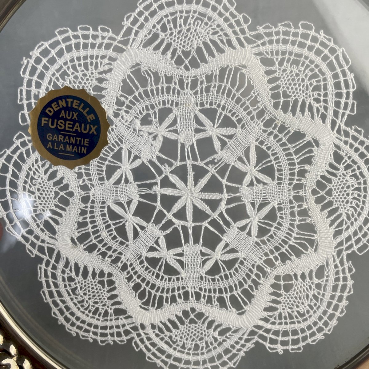 Napperon en dentelle aux fuseaux sous verre cerclé métal argenté décor de roses